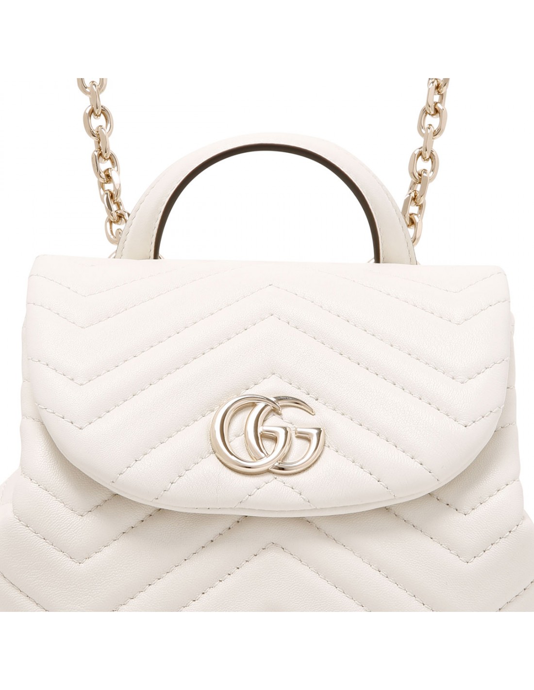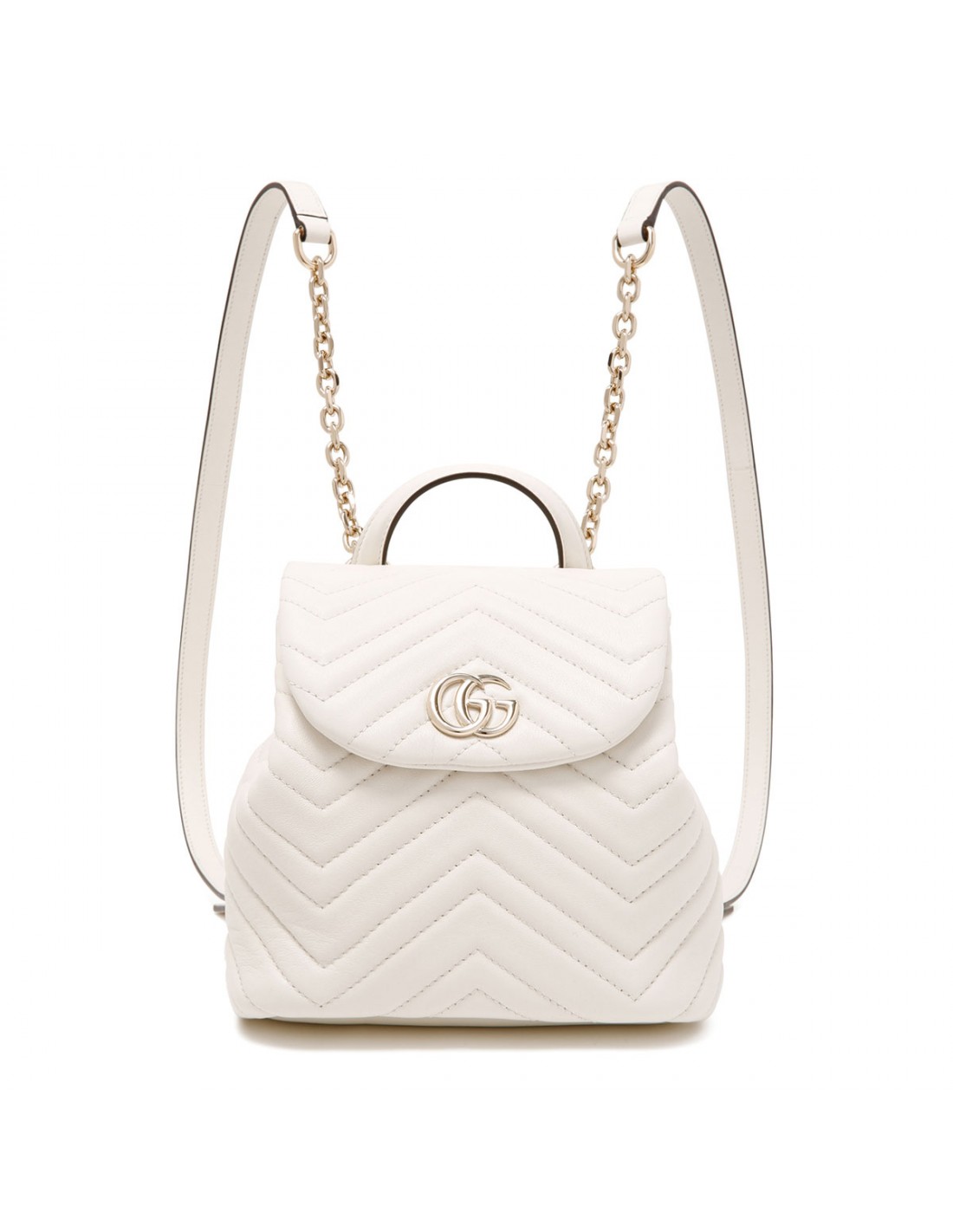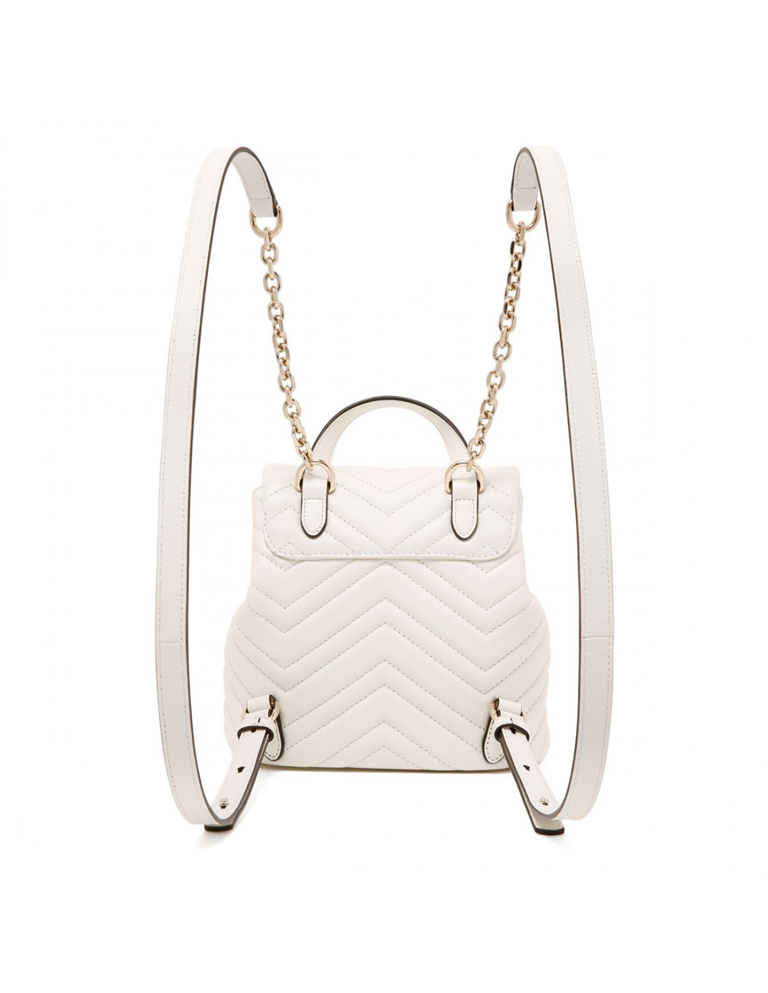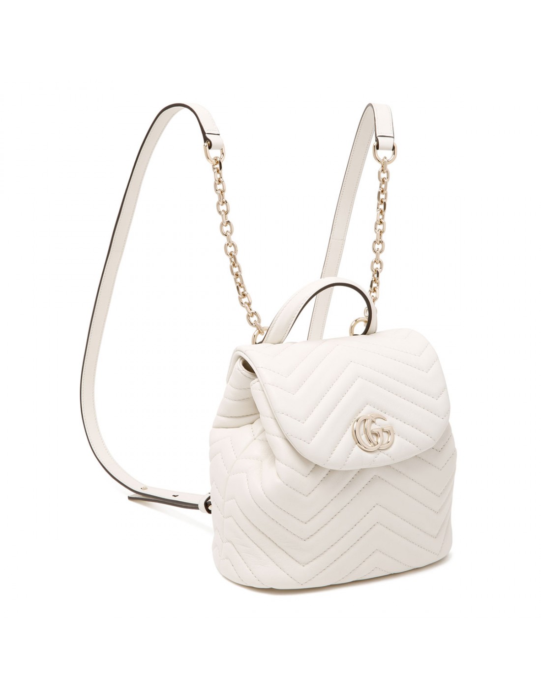 White matelassé chevron nappa leather GG Marmont mini backpack from Gucci featuring light gold-toned double G and hardware, adjustable leather straps, top handle, flap magnetic closure and interior drawstring with toggle, Rosso Ancora red viscose lining, one open pocket.