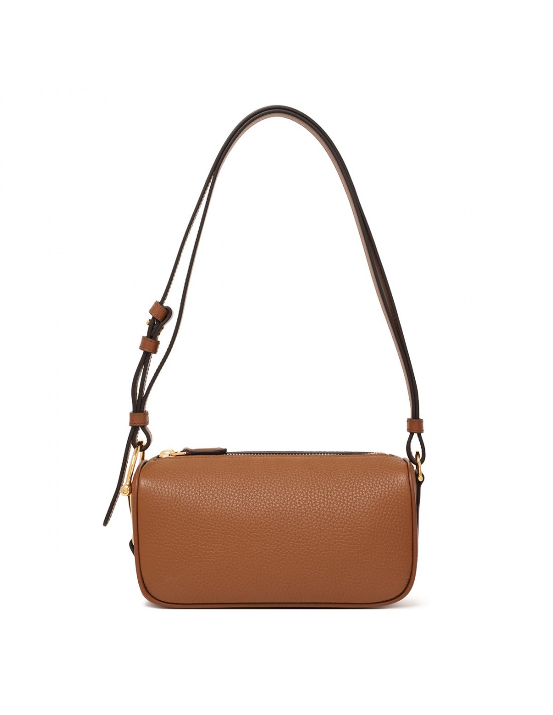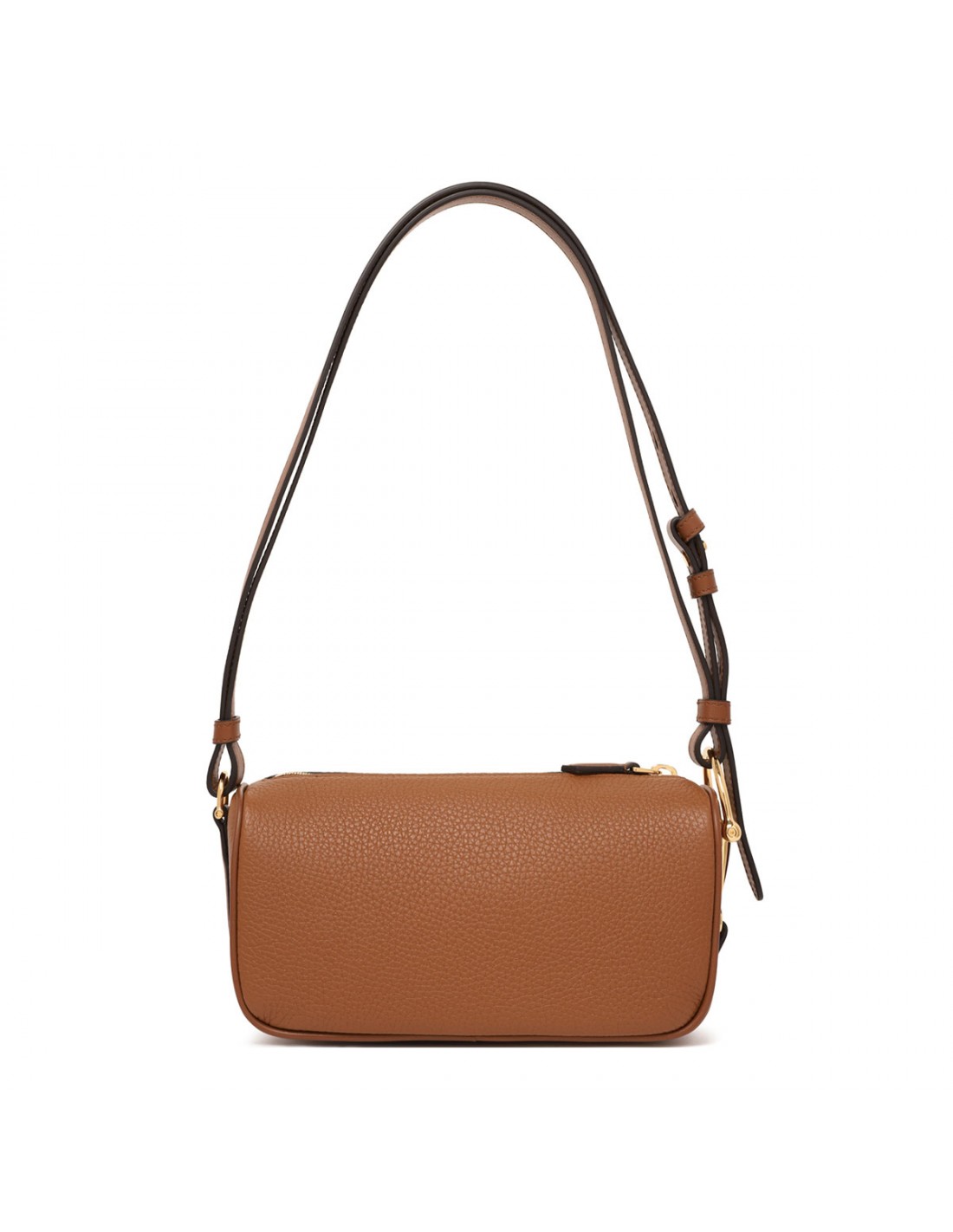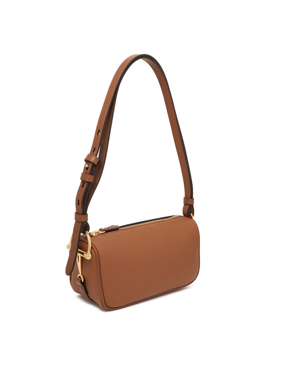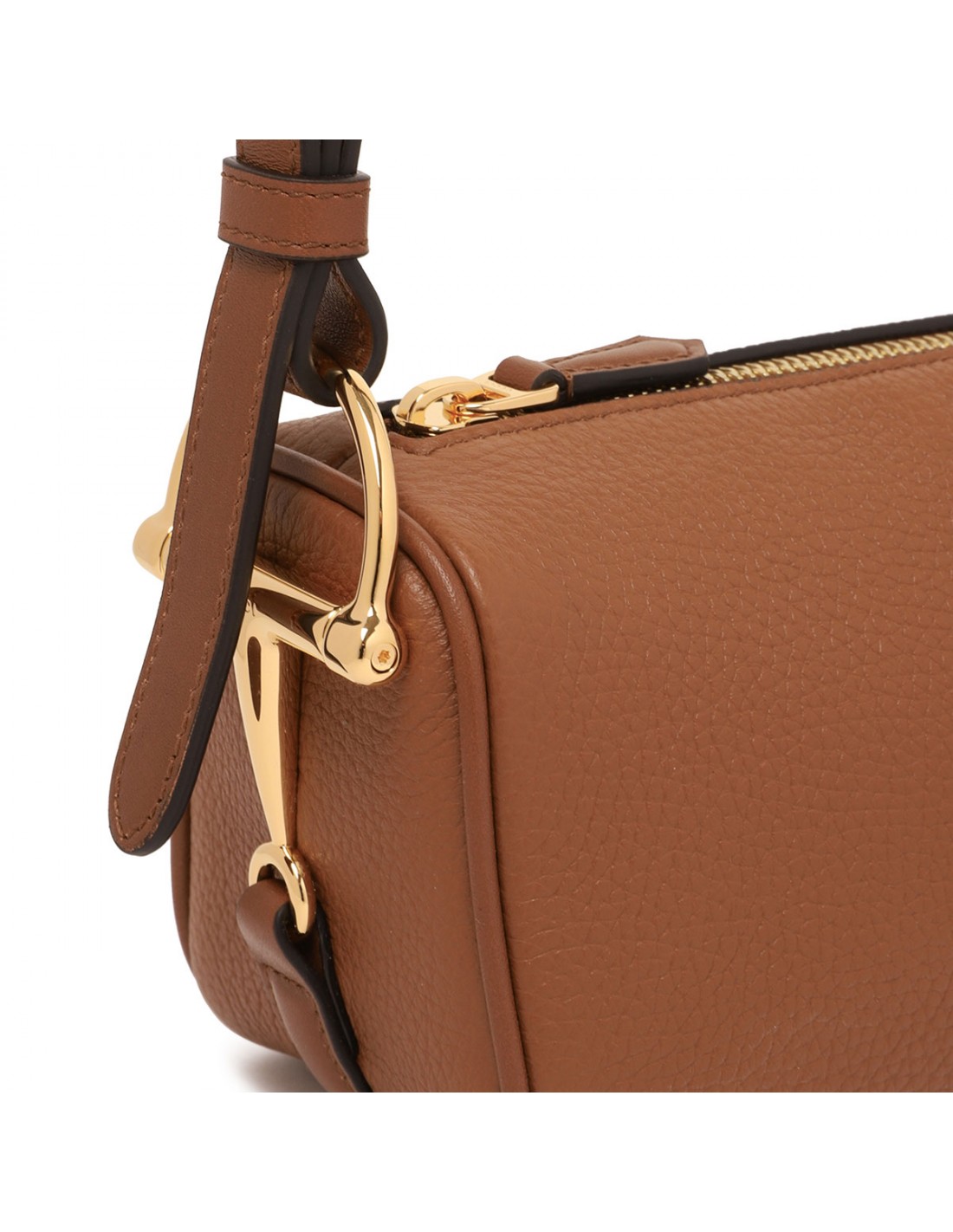 Brown soft grainy leather mini bag from Gucci featuring light gold-toned half Horsebit and hardware, leather shoulder strap, zip fastening along top, tonal cotton linen lining.