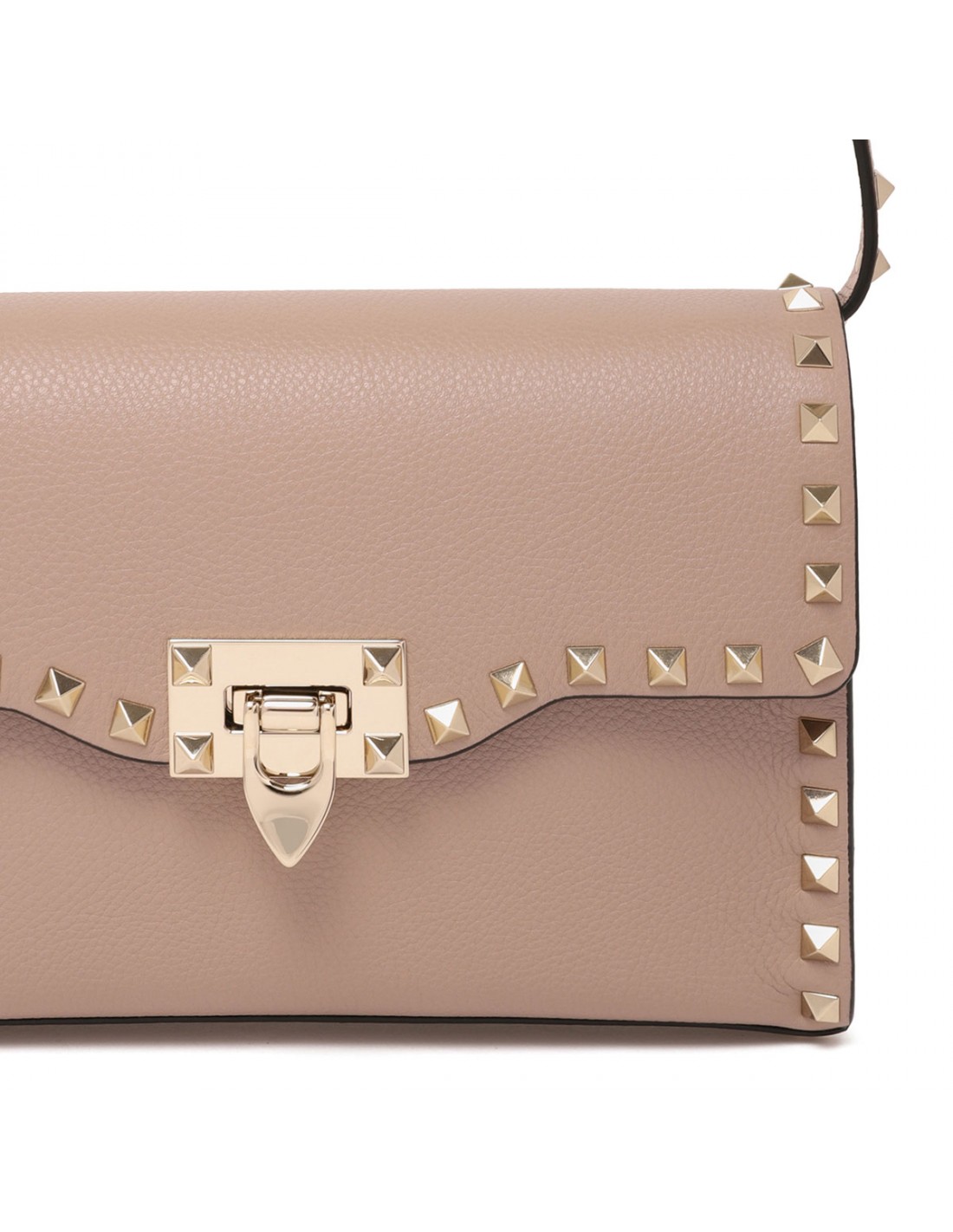 Poudre pink grainy calfskin Rockstud small crossbody bag from Valentino Garavani featuring platinum-finish metal studs and hardware, front flap with hook closure, adjustable shoulder strap, one open slip pocket.