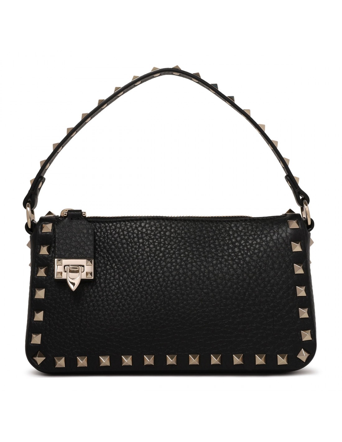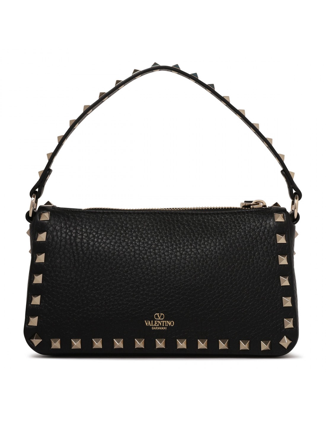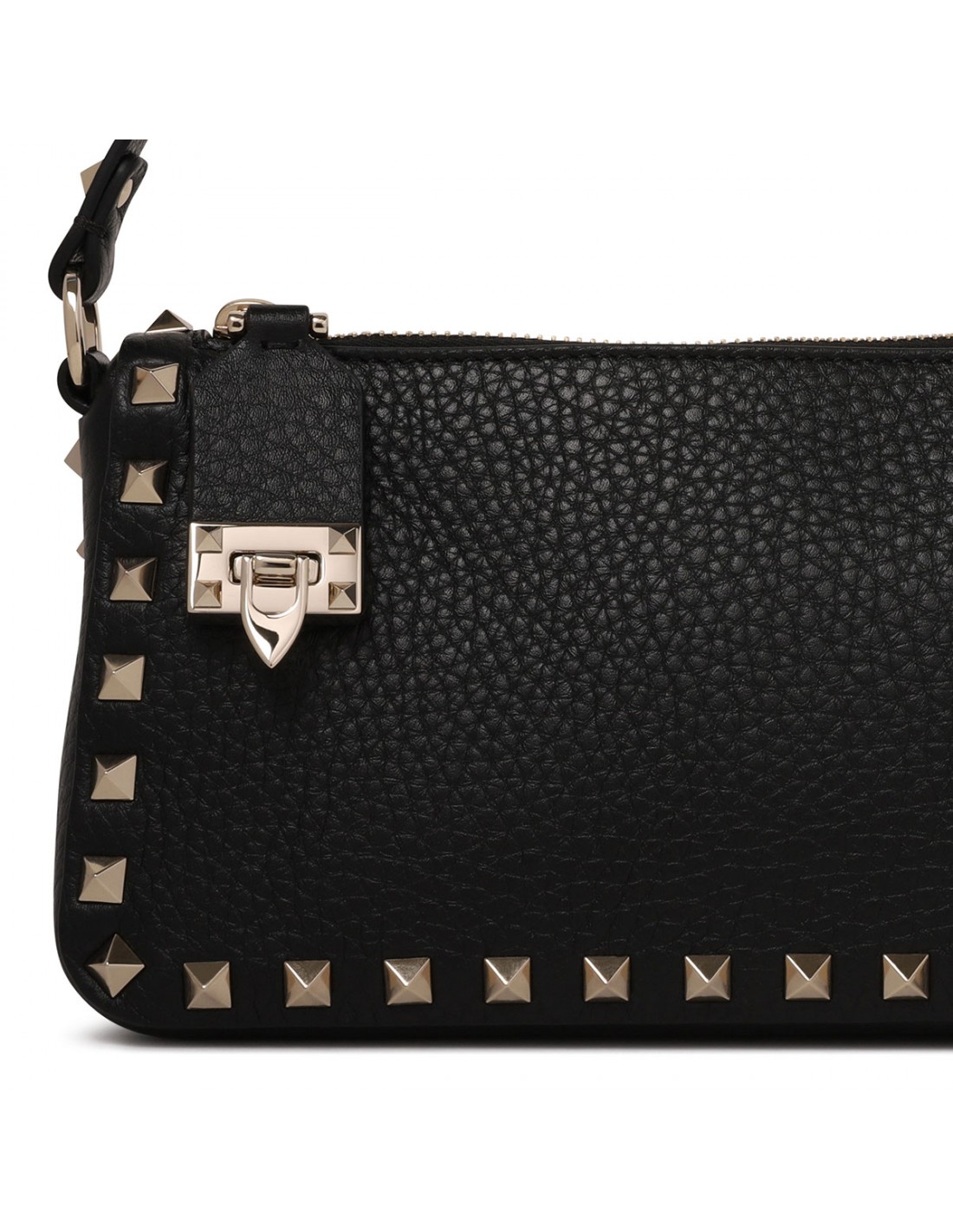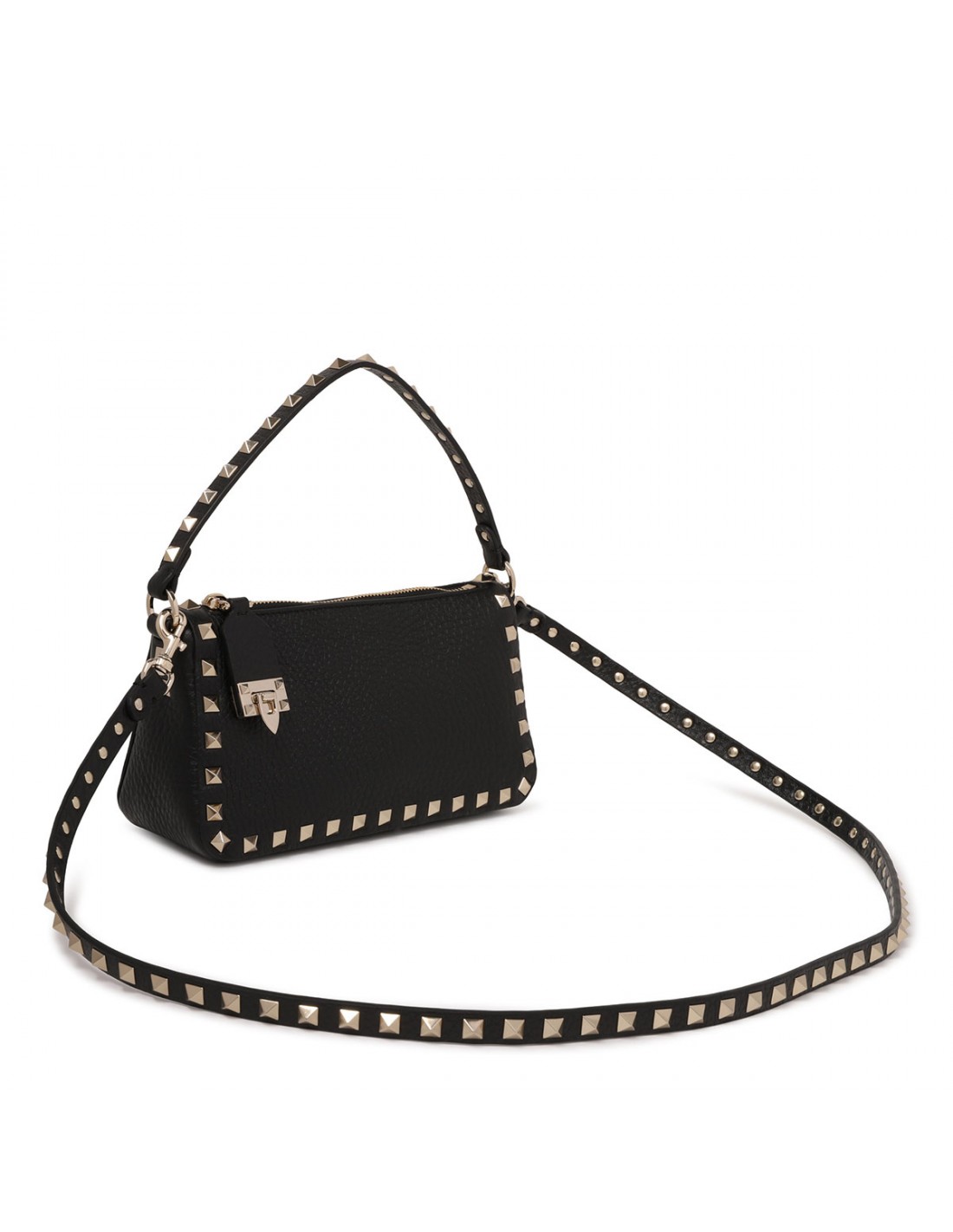 Black grainy leather Rockstud small crossbody bag from Valentino Garavani featuring platinum-finish small studs and hardware, hook closure reinterpreted to secure the zip pull, zip and hook fastening, adjustable and detachable shoulder strap, internal card slot.