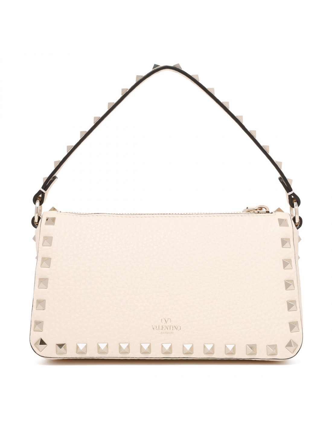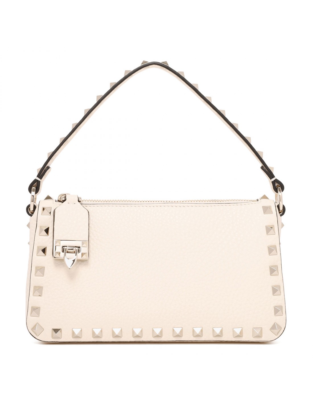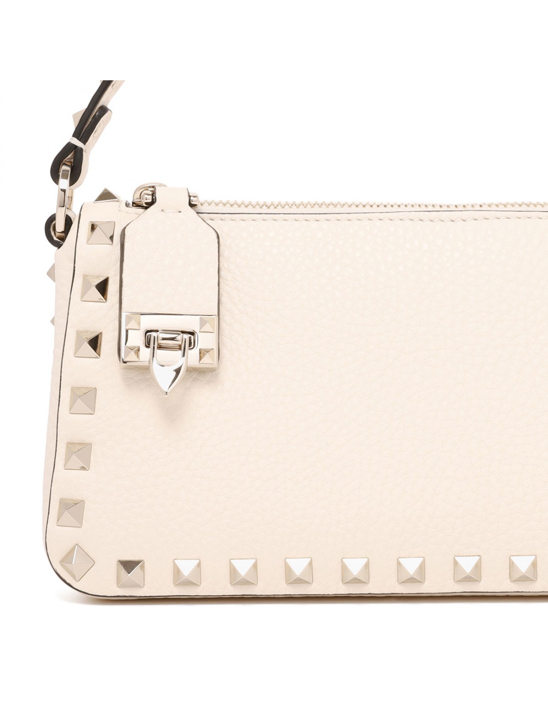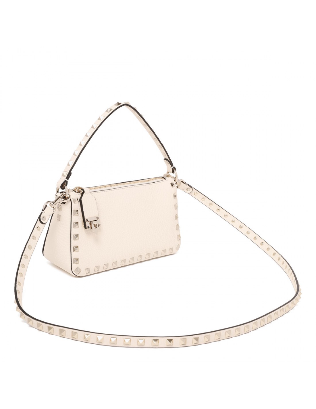 Light ivory grainy leather Rockstud small crossbody bag from Valentino Garavani featuring platinum-finish small studs and hardware, hook closure reinterpreted to secure the zip pull, zip and hook fastening, adjustable and detachable shoulder strap, internal card slot.