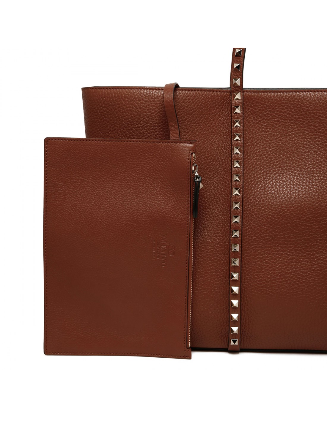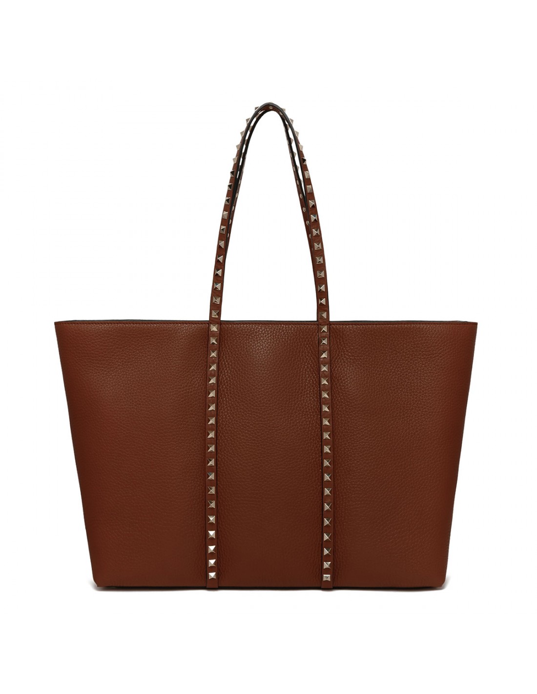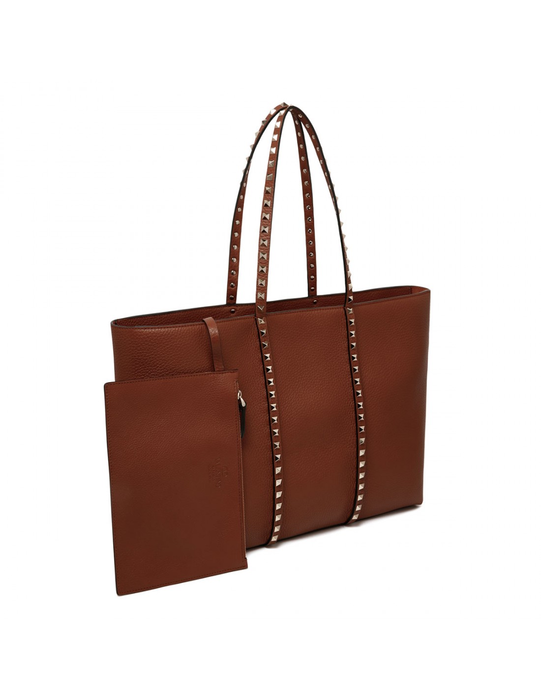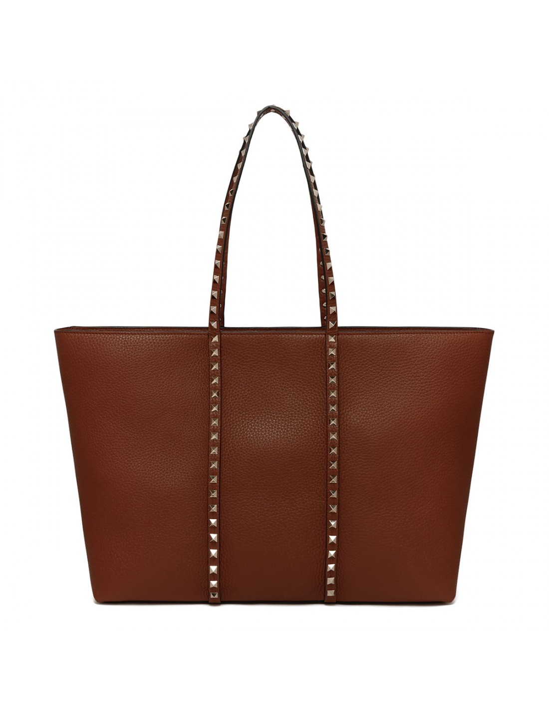 Tan hue grained leather Rockstud tote bag from Valentino Garavani featuring platinum-finish studs, double leather top handle, zip fastening along top, logo detail, internal zipped pouch and open pocket.