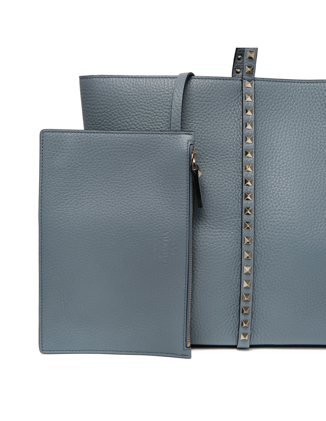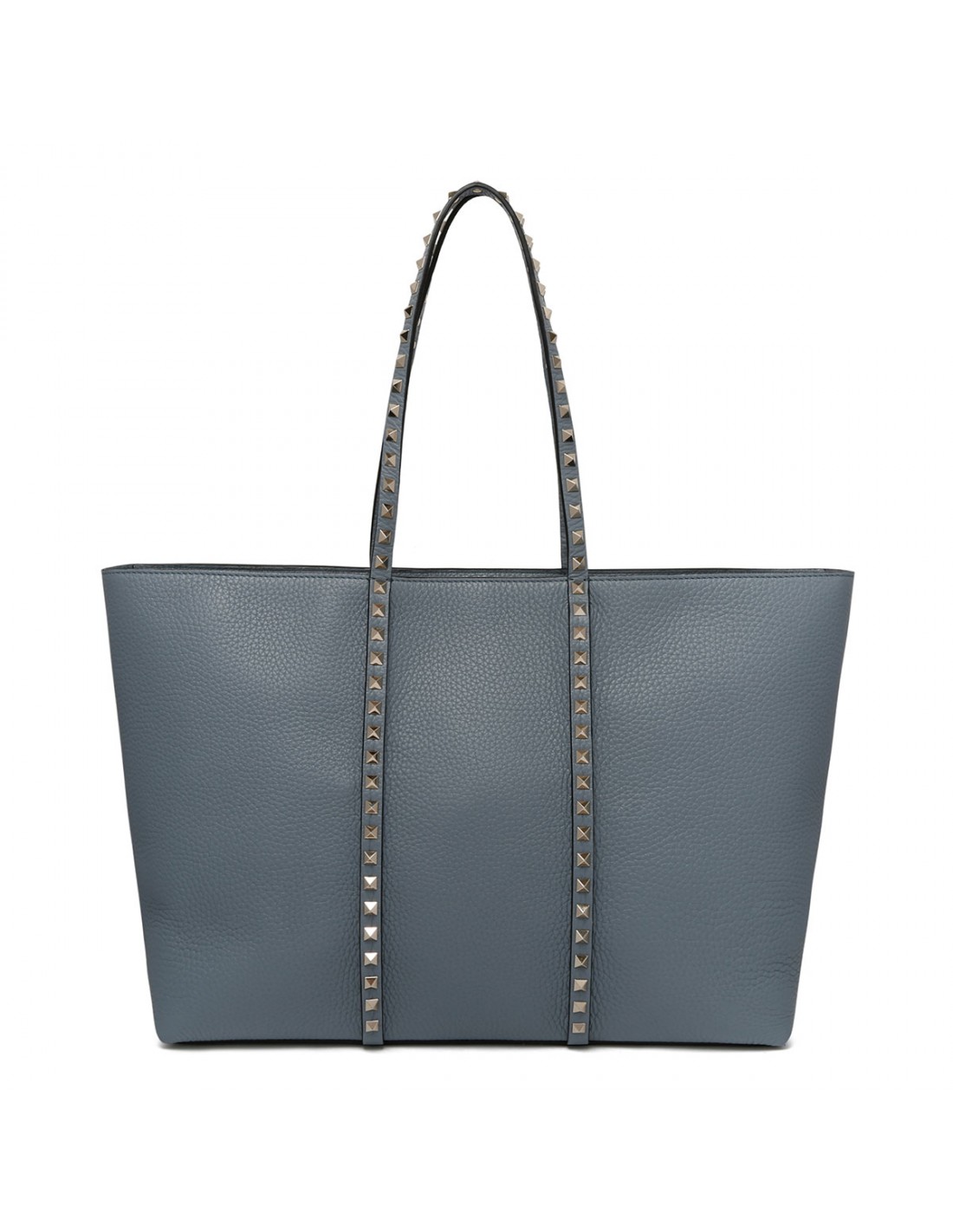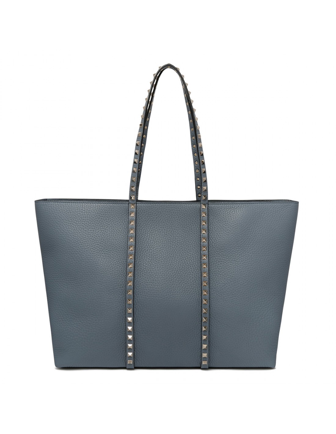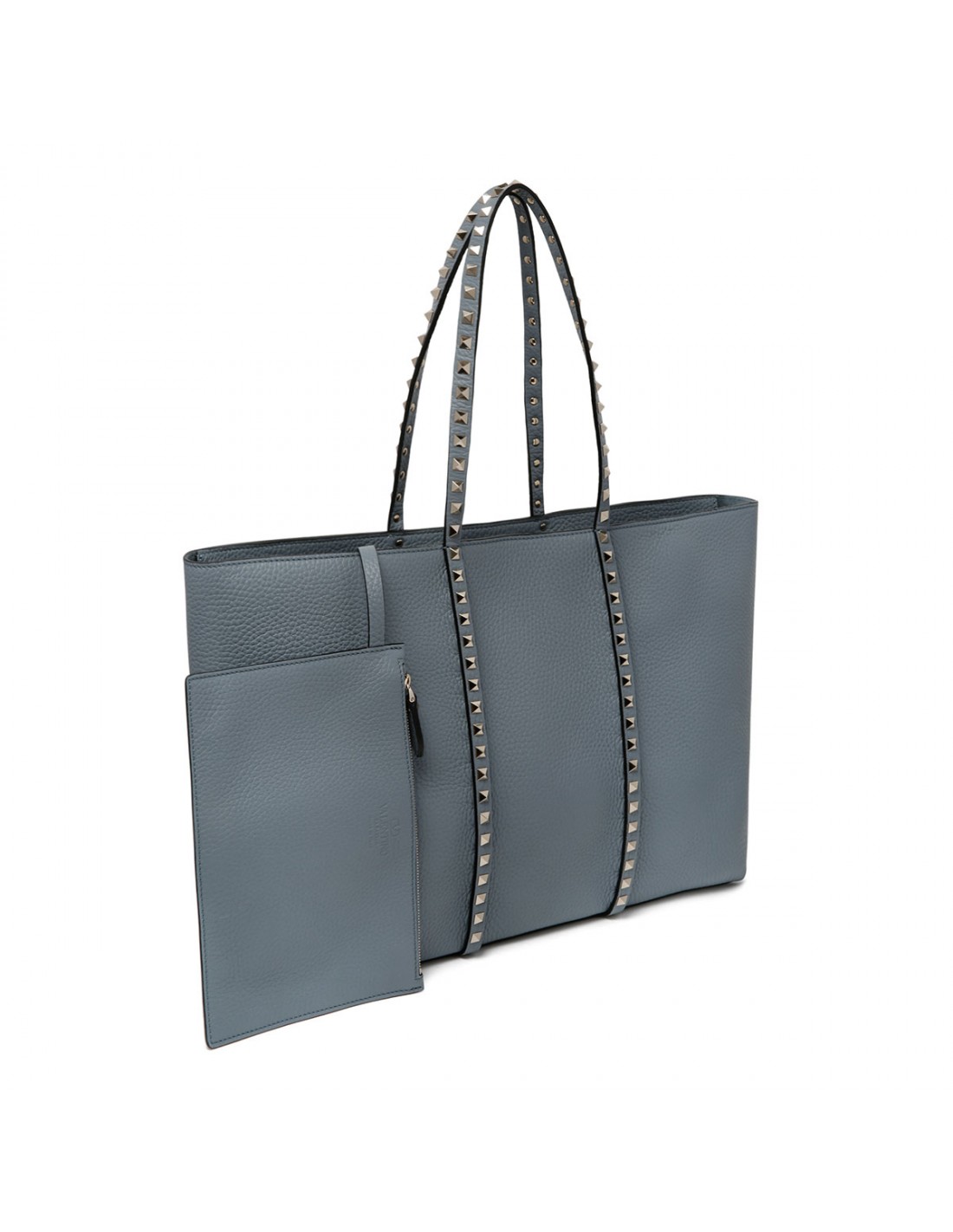 Stone gray hue grained leather Rockstud tote bag from Valentino Garavani featuring platinum-finish studs, double leather top handle, zip fastening along top, logo detail, internal zipped pouch and open pocket.