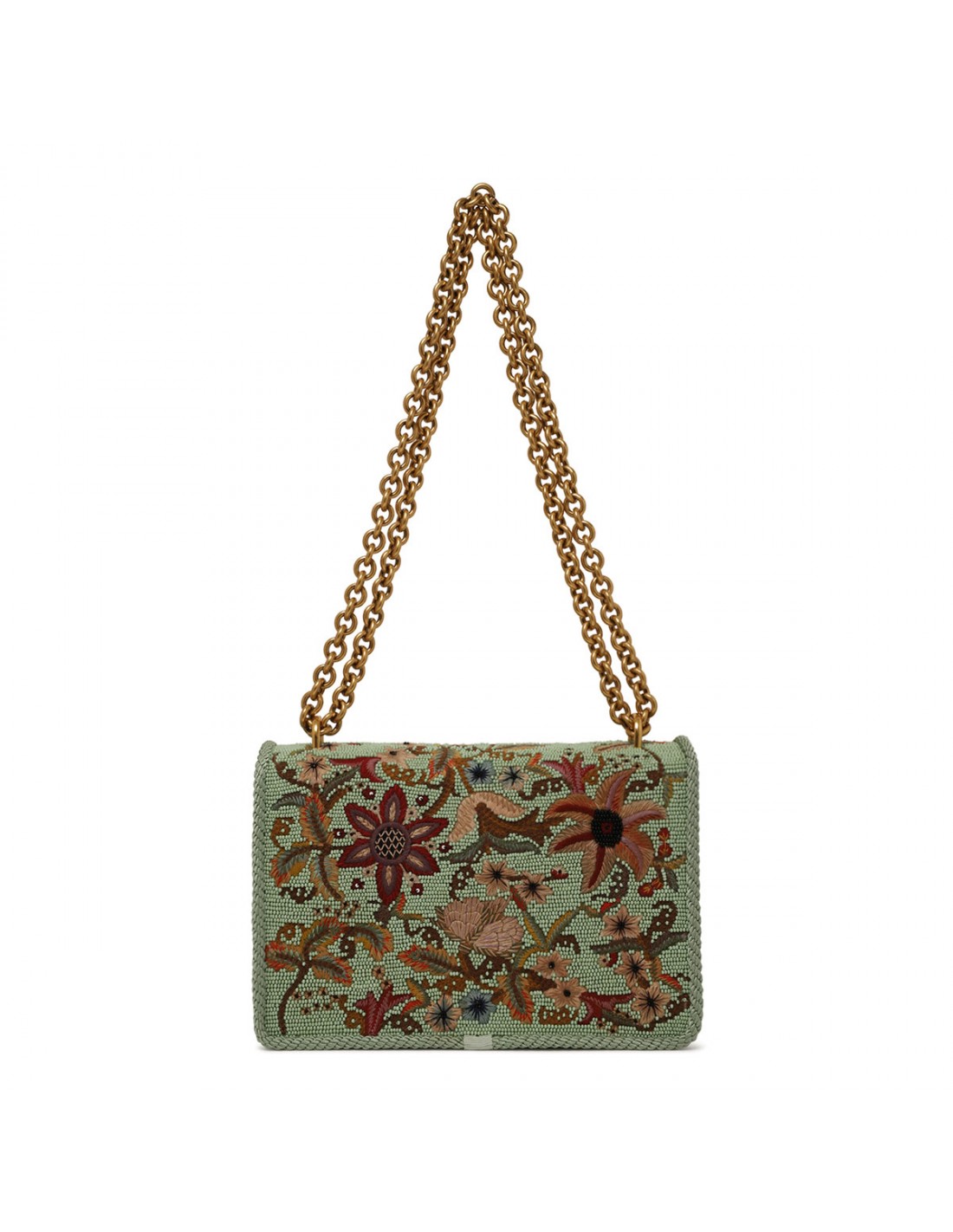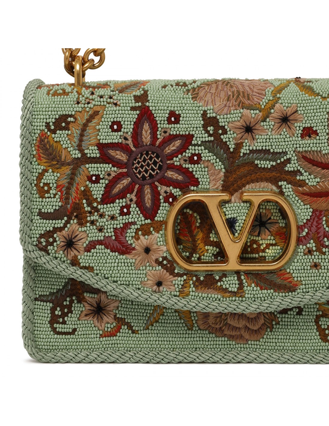 Green leather and silk Vain shoulder bag from Valentino Garavani featuring multicolor floral embroideries, metallic VLogo Signature, sliding chain shoulder strap, antique gold-finish hardware, magnetic closure, nappa lining, two internal compartments, zip pocket and slip pocket.