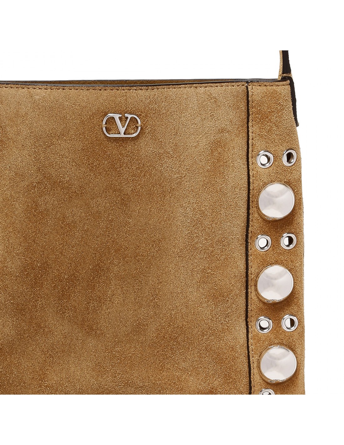Havana beige suede leather Nellcôte small shoulder bag from Valentino Garavani featuring ball studs and rivets decoration, fringed trims, adjustable suede shoulder strap, metallic detail with VLogo Signature, palladium-finish hardware.