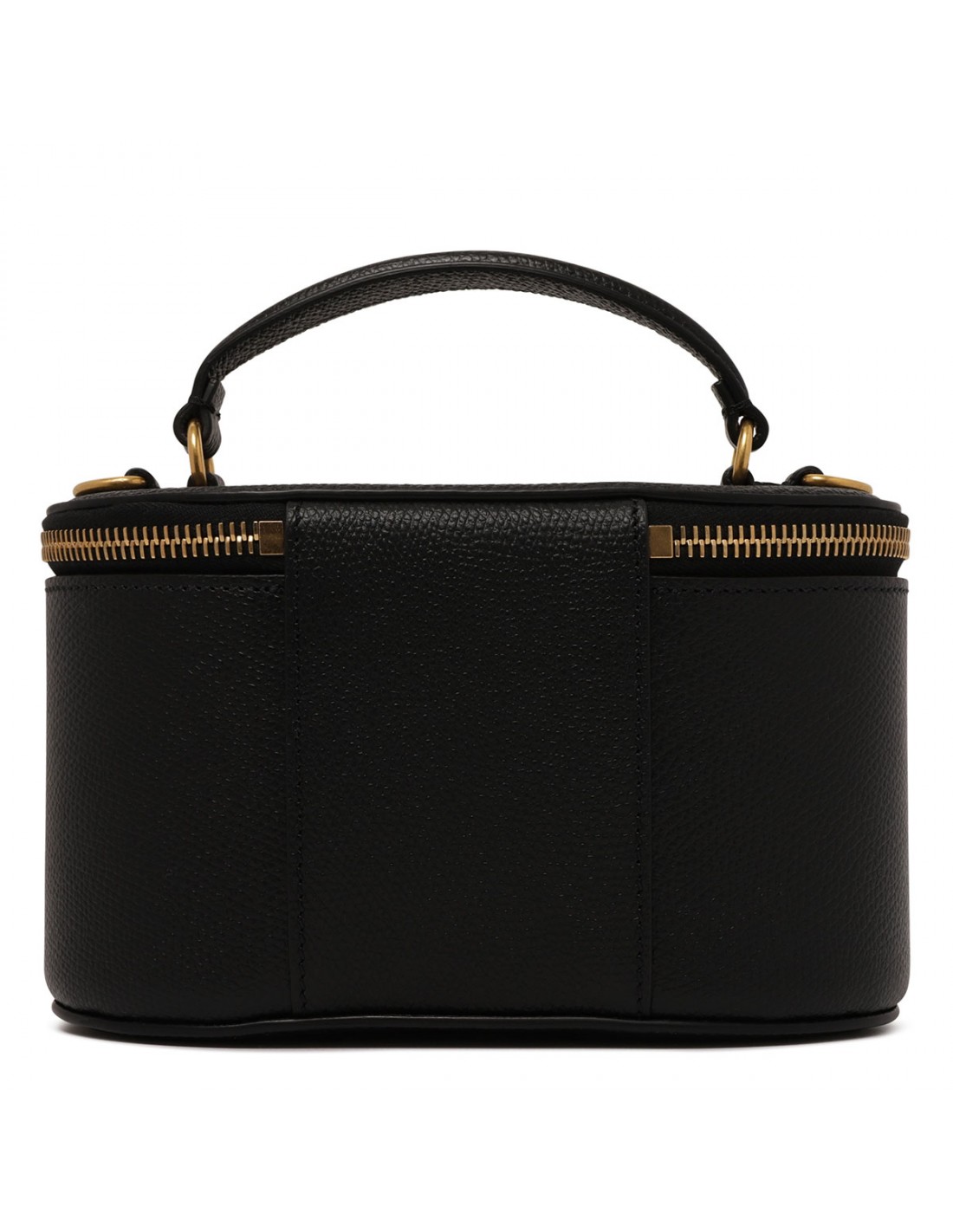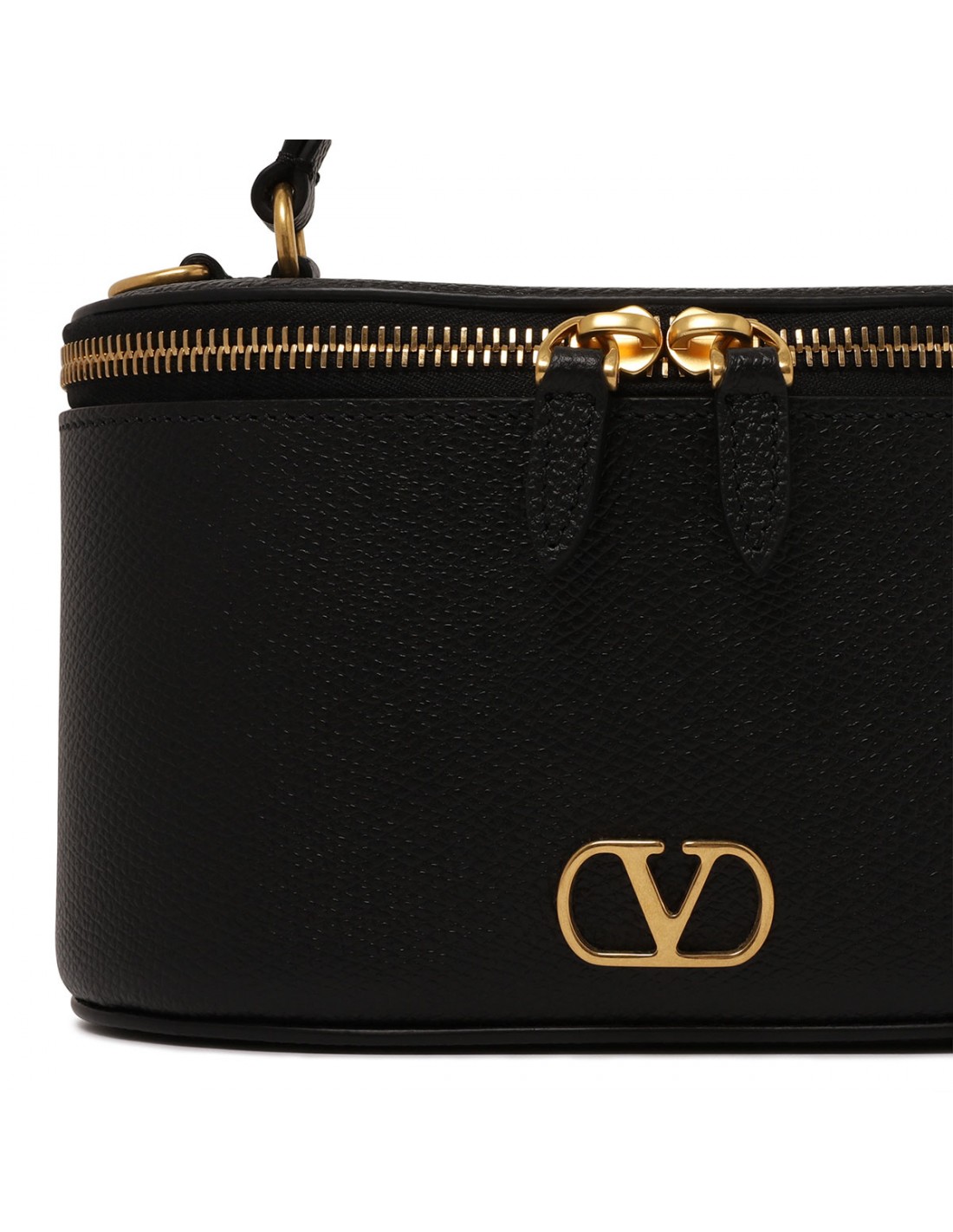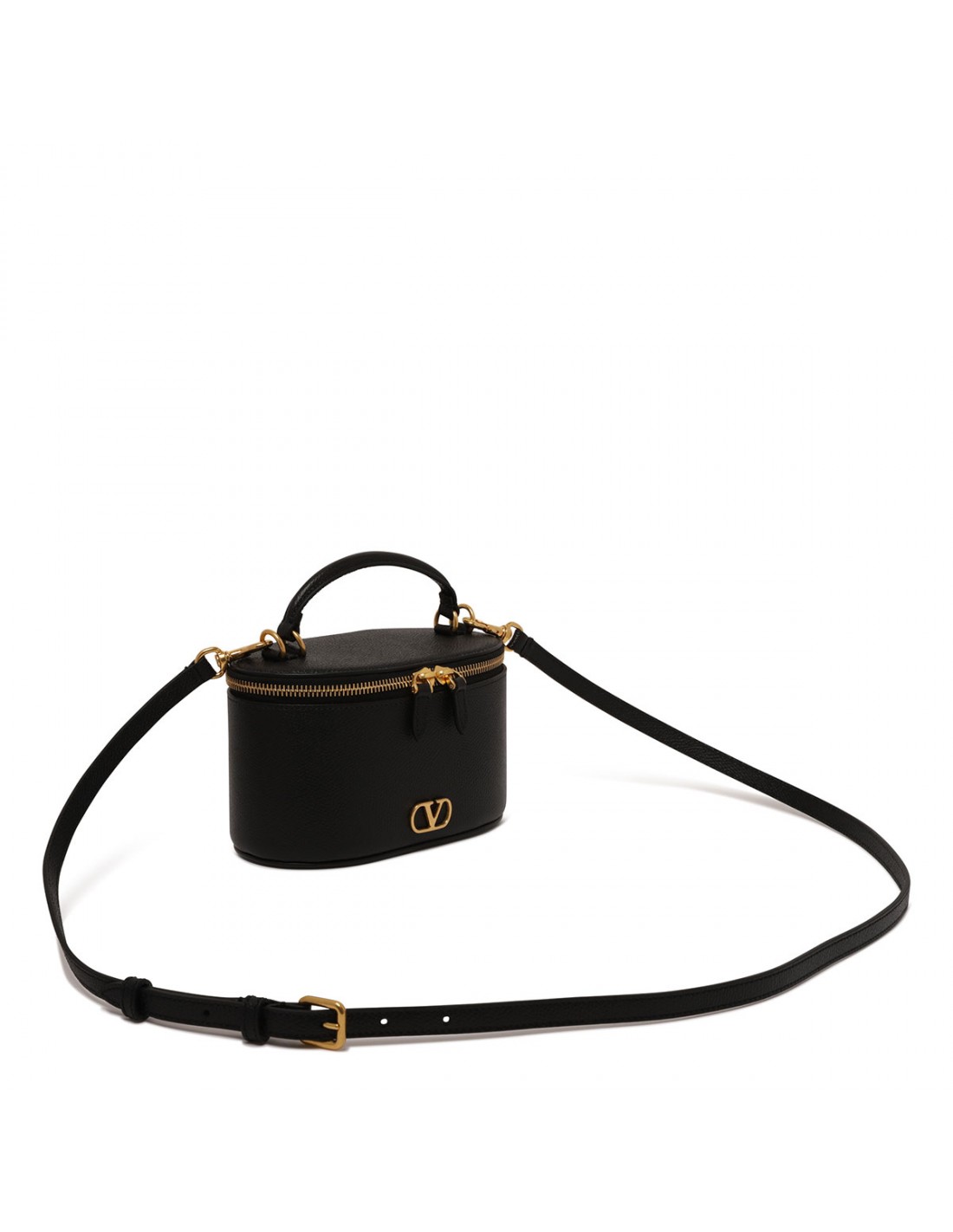 Black grainy leather VLogo Signature mini vanity bag from Valentino Garavani featuring VLogo signature detail, top handle, detachable and adjustable shoulder strap, two way zip closure, nappa leather lining, one internal card slot.