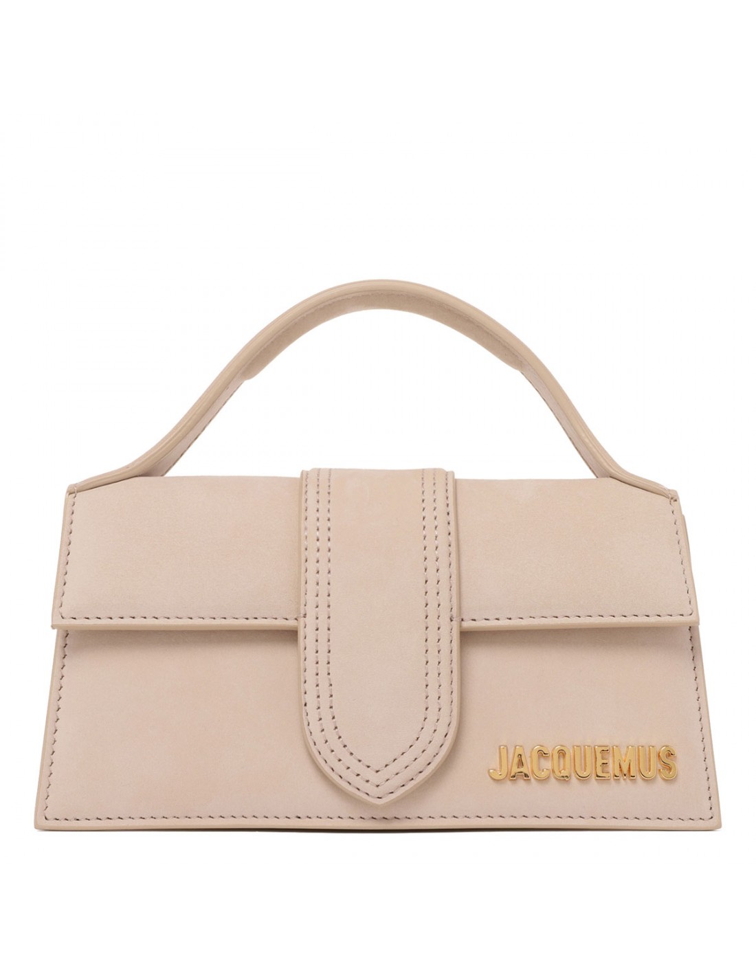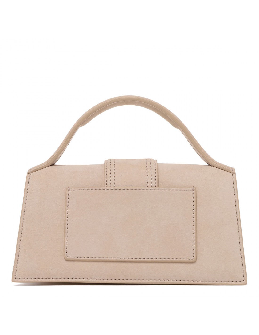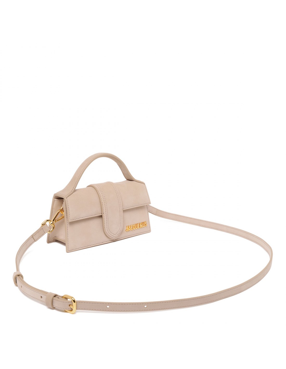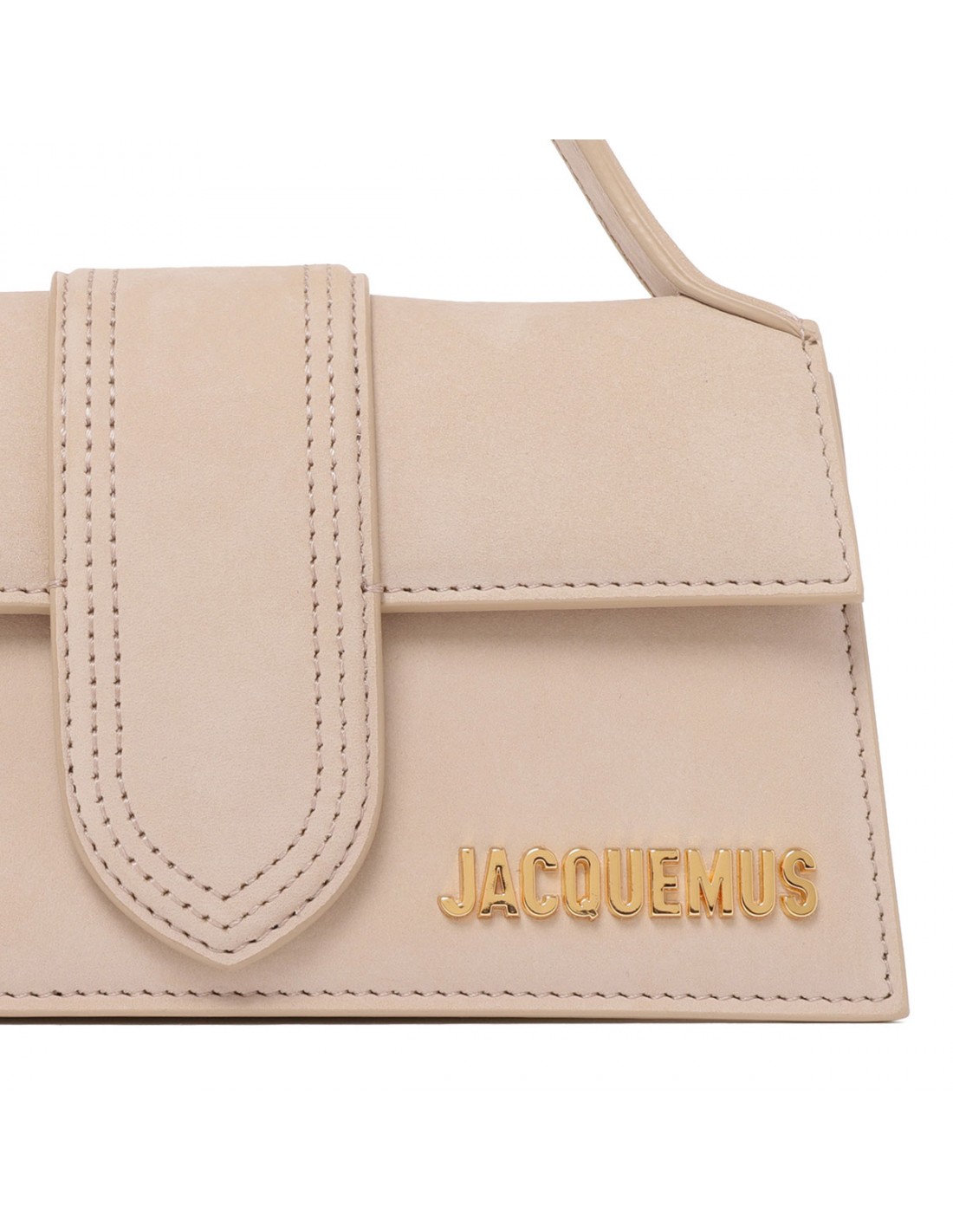 Dark beige leather The Bambino bag from Jacquemus featuring structured silhouette, padded top handle, front flap with magnetic tab fastening, long detachable strap, engraved lobster clasp, back patch pocket, topstitching, gold metal logo and hardware.