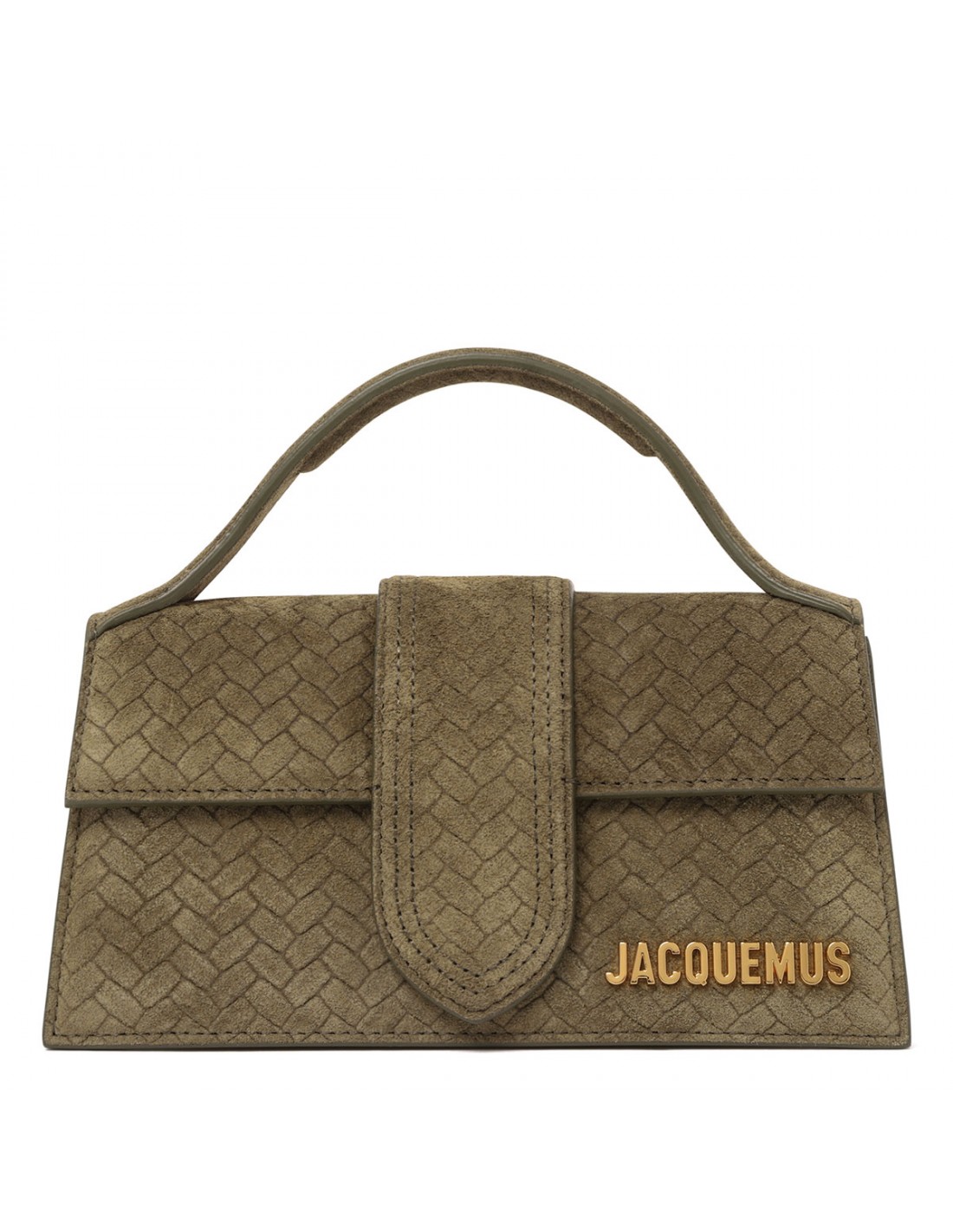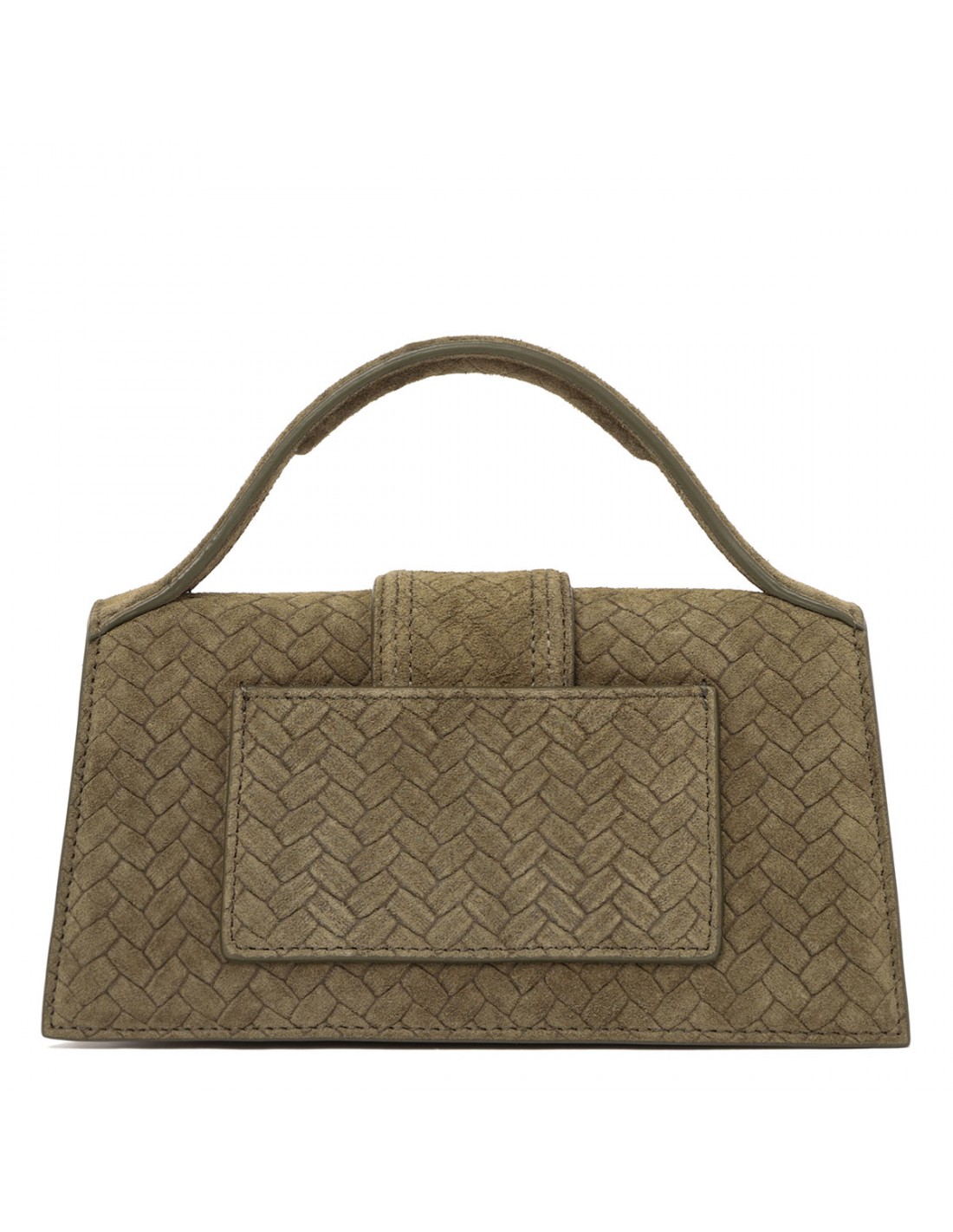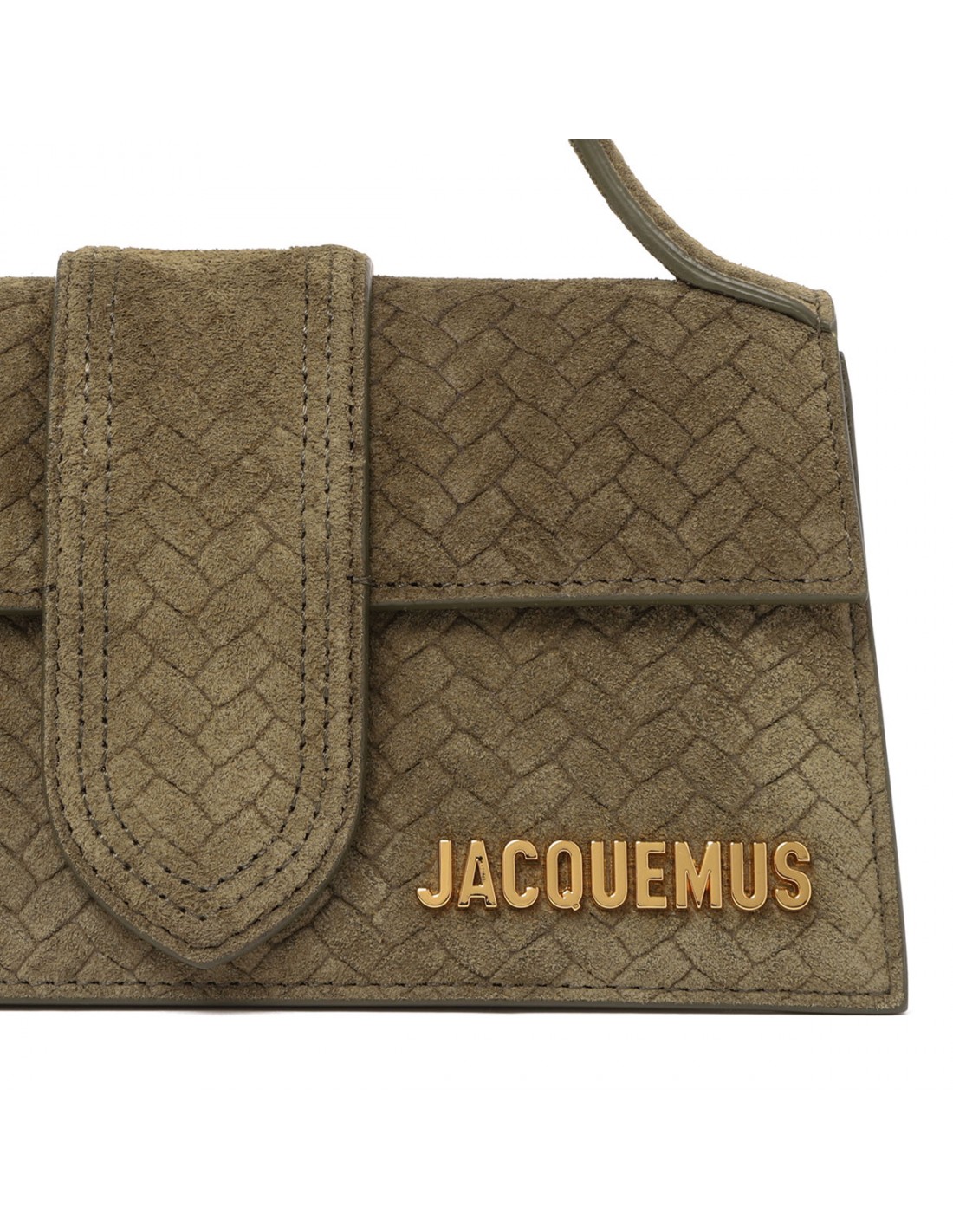Khaki suede leather The Bambino bag from Jacquemus featuring woven effect, structured silhouette, padded top handle, front flap with magnetic tab fastening, long detachable strap, engraved lobster clasp, back patch pocket, topstitching, gold metal logo and hardware.