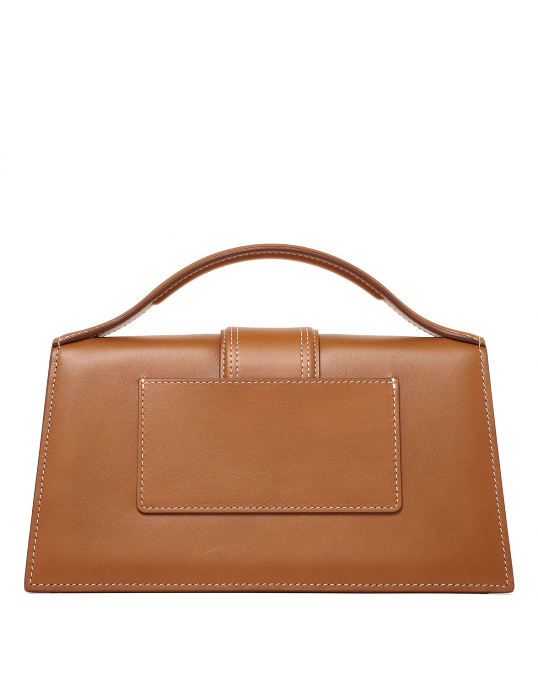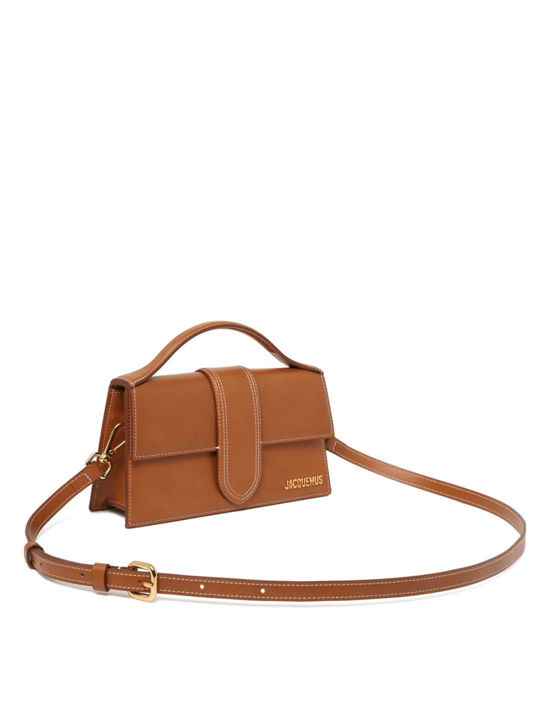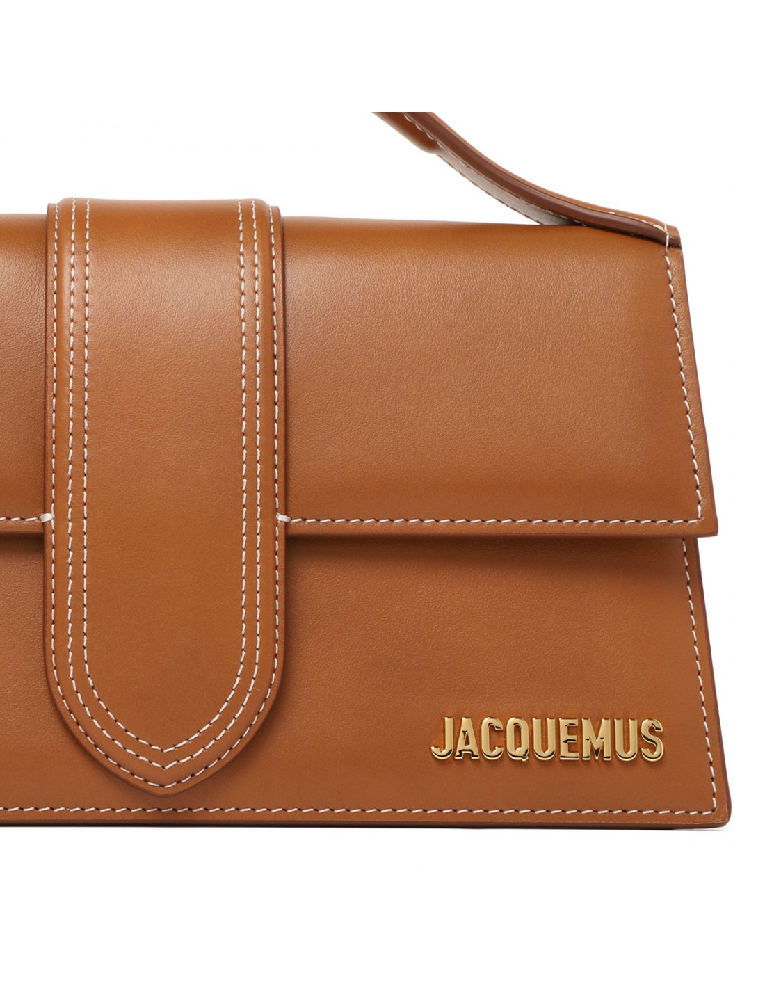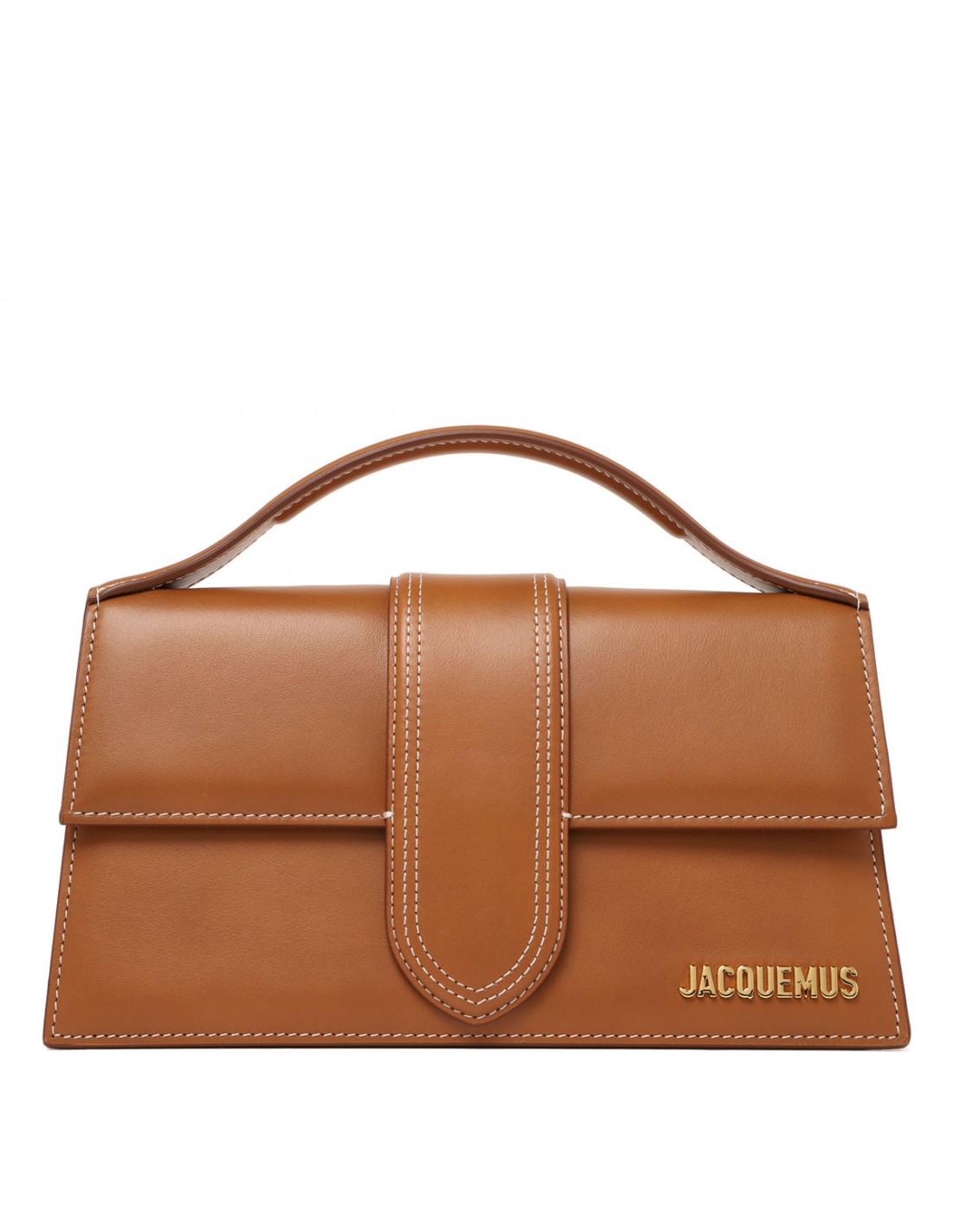 Light brown leather The Large Bambino bag from Jacquemus featuring structured silhouette, padded top handle, front flap with magnetic tab fastening, long detachable strap, engraved lobster clasp, back patch pocket, topstitching, gold metal logo and hardware.
