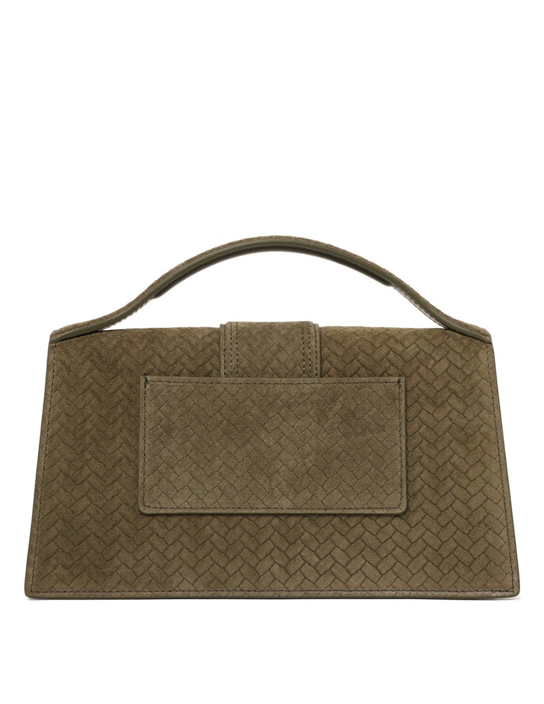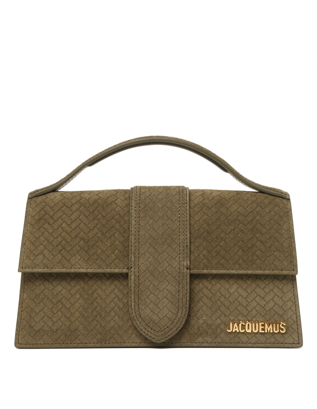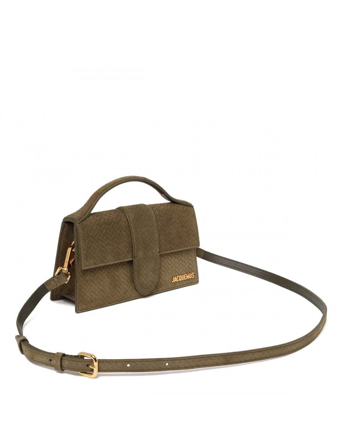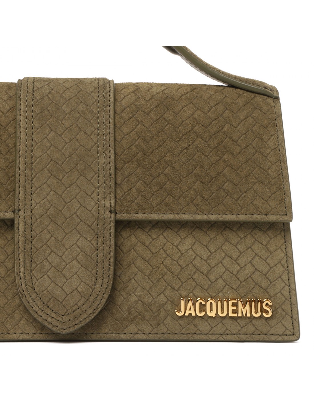 Khaki suede leather The Large Bambino bag from Jacquemus featuring woven effect, structured silhouette, padded top handle, front flap with magnetic tab fastening, long detachable strap, engraved lobster clasp, back patch pocket, topstitching, gold metal logo and hardware.