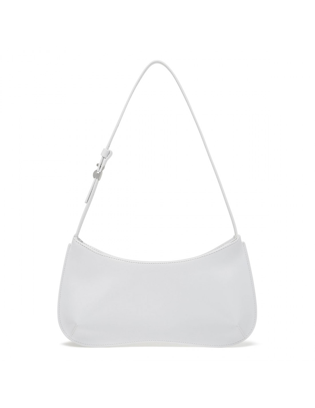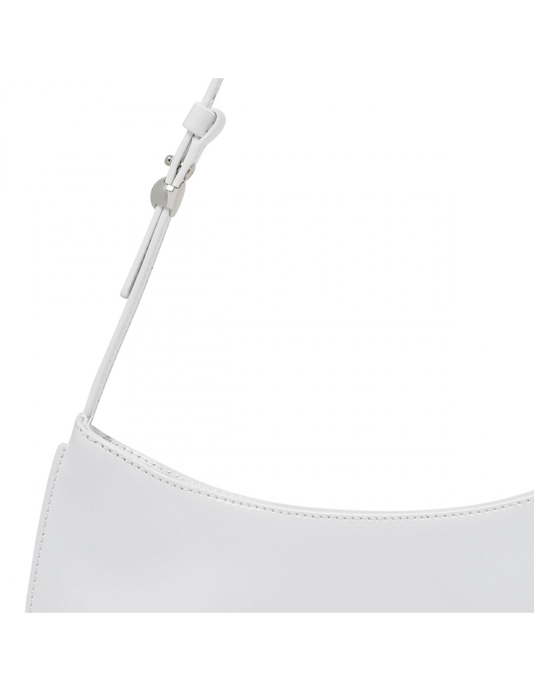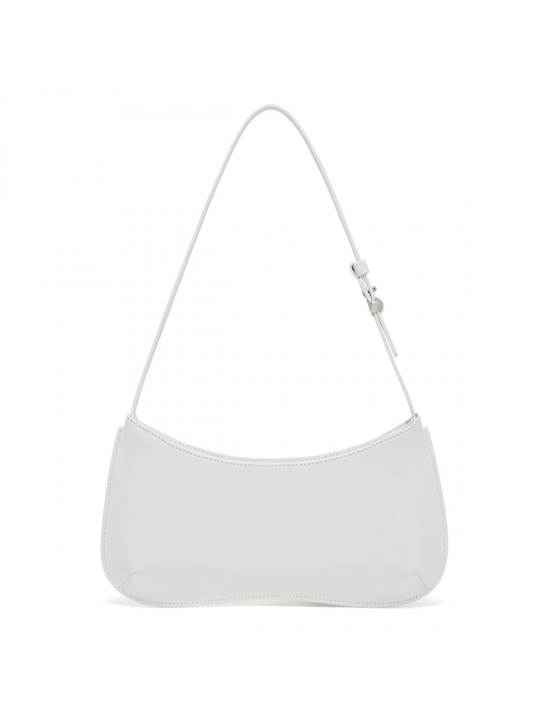 White calf-leather The Bisou shoulder bag from Jacquemus featuring adjustable buckled leather strap with engraved metal bead, zip fastening along top, edge-to-edge construction, logo embossed, silver tone metal hardware, internal patch pocket.