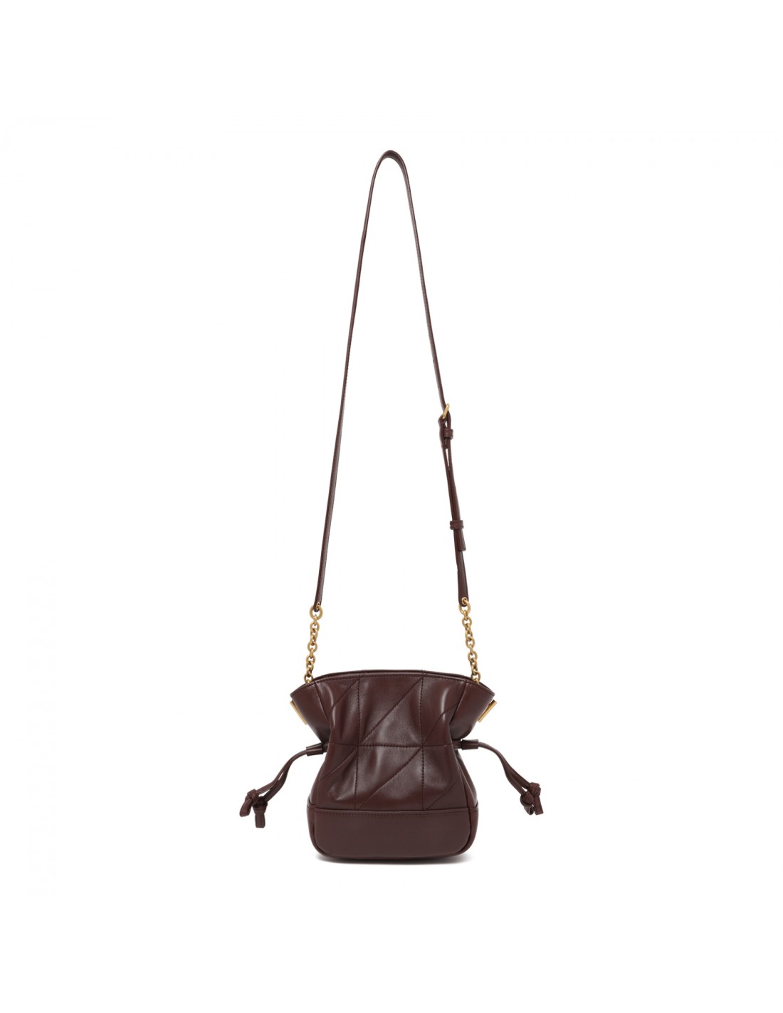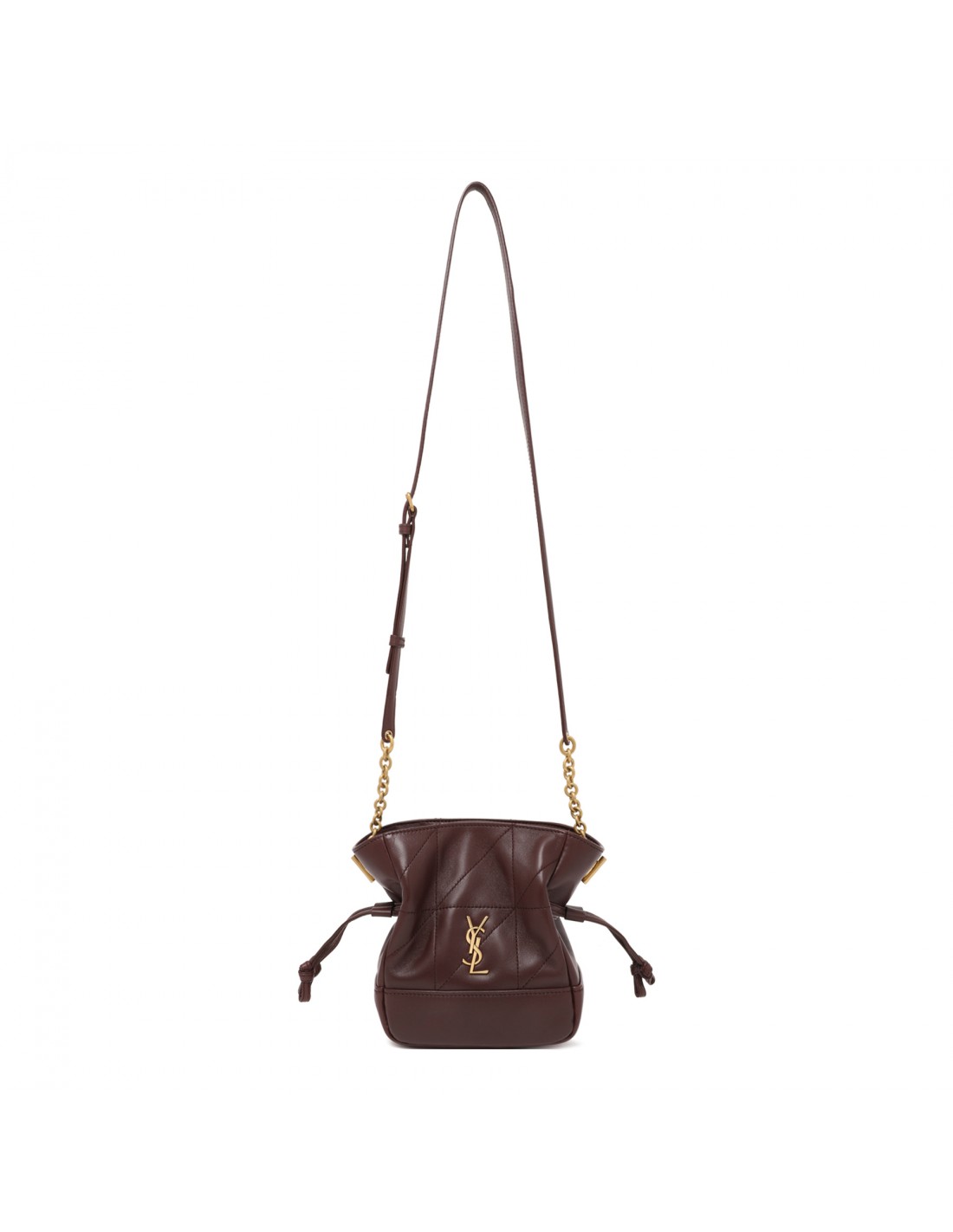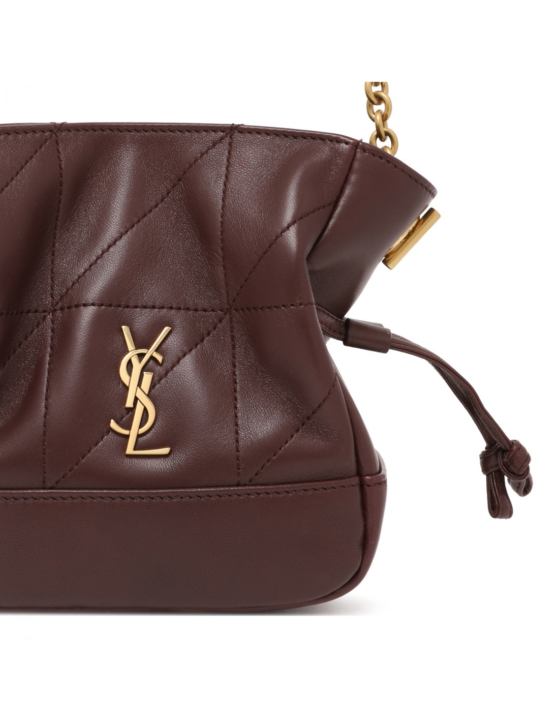 Red cabernet hue leather Jamie mini shoulder pouch from Saint Laurent featuring Cassandre decoration, Carré Rive Gauche topstitching, leather-and-chain strap, drawstring and snap button closure, bronze-tone hardware, leather lining.