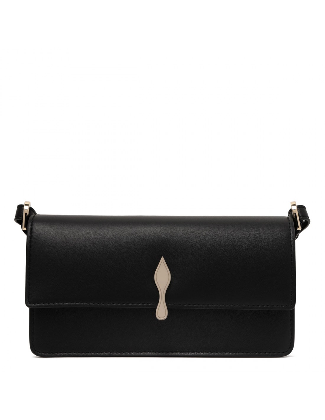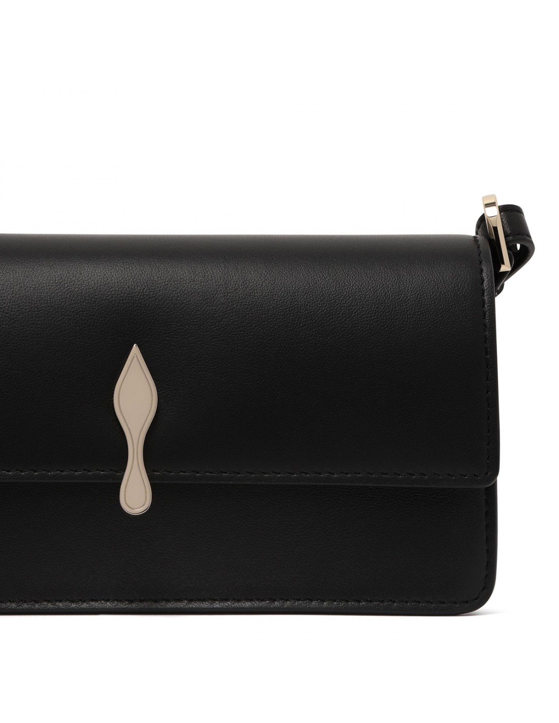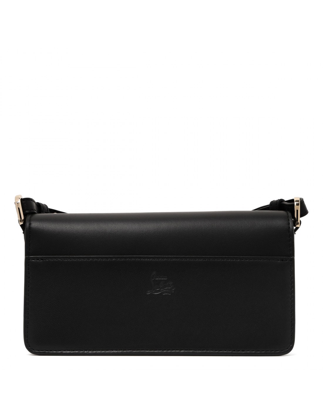 Black lamb nappa leather Bettina mini shoulder bag from Christian Louboutin featuring gold clasp with iconic sole shape, adjustable and detachable leather strap, magnetic snap button fastening, back flat pocket, one main compartment, two internal card slots.
