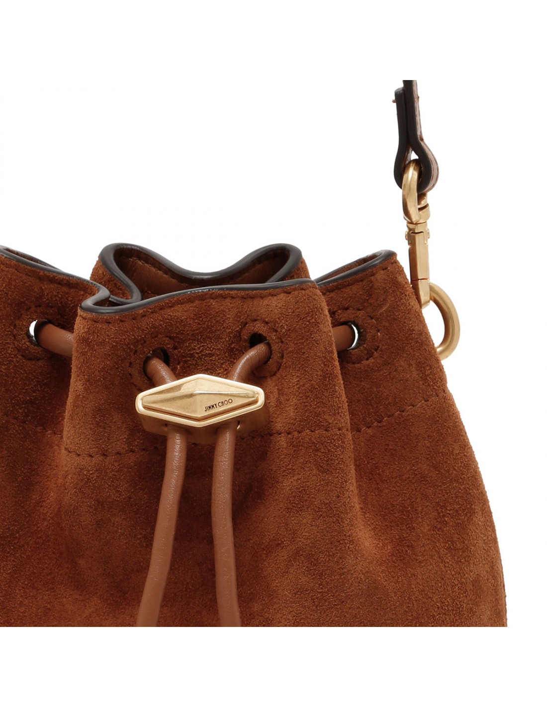 Brown suede leather Bon Bon bucket bag from Jimmy Choo featuring detachable and adjustable shoulder strap, top drawstring fastening, logo-engraved gold-tone hardware, one main compartment, leather lining, internal logo patch.