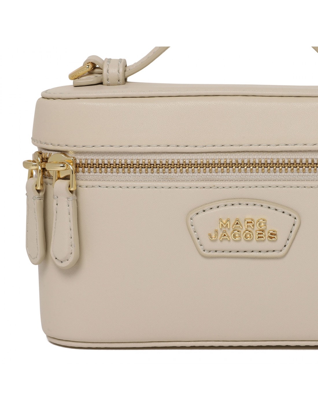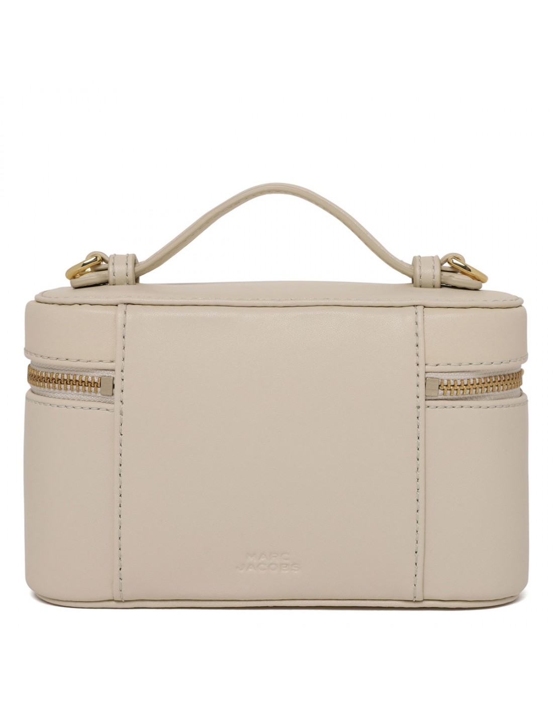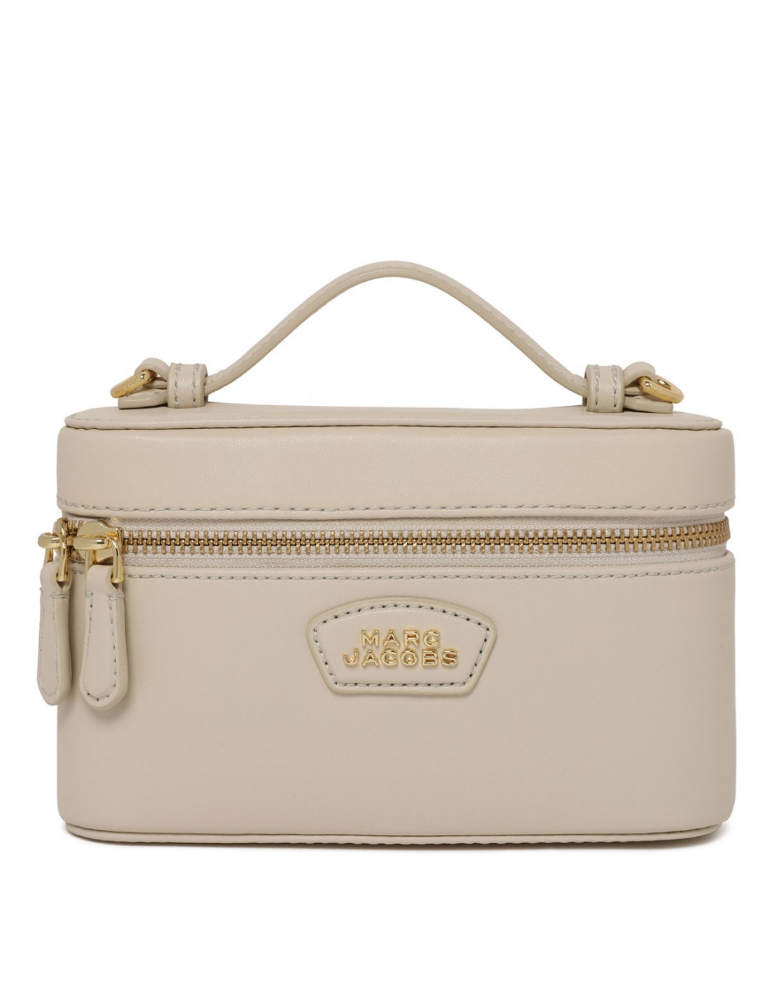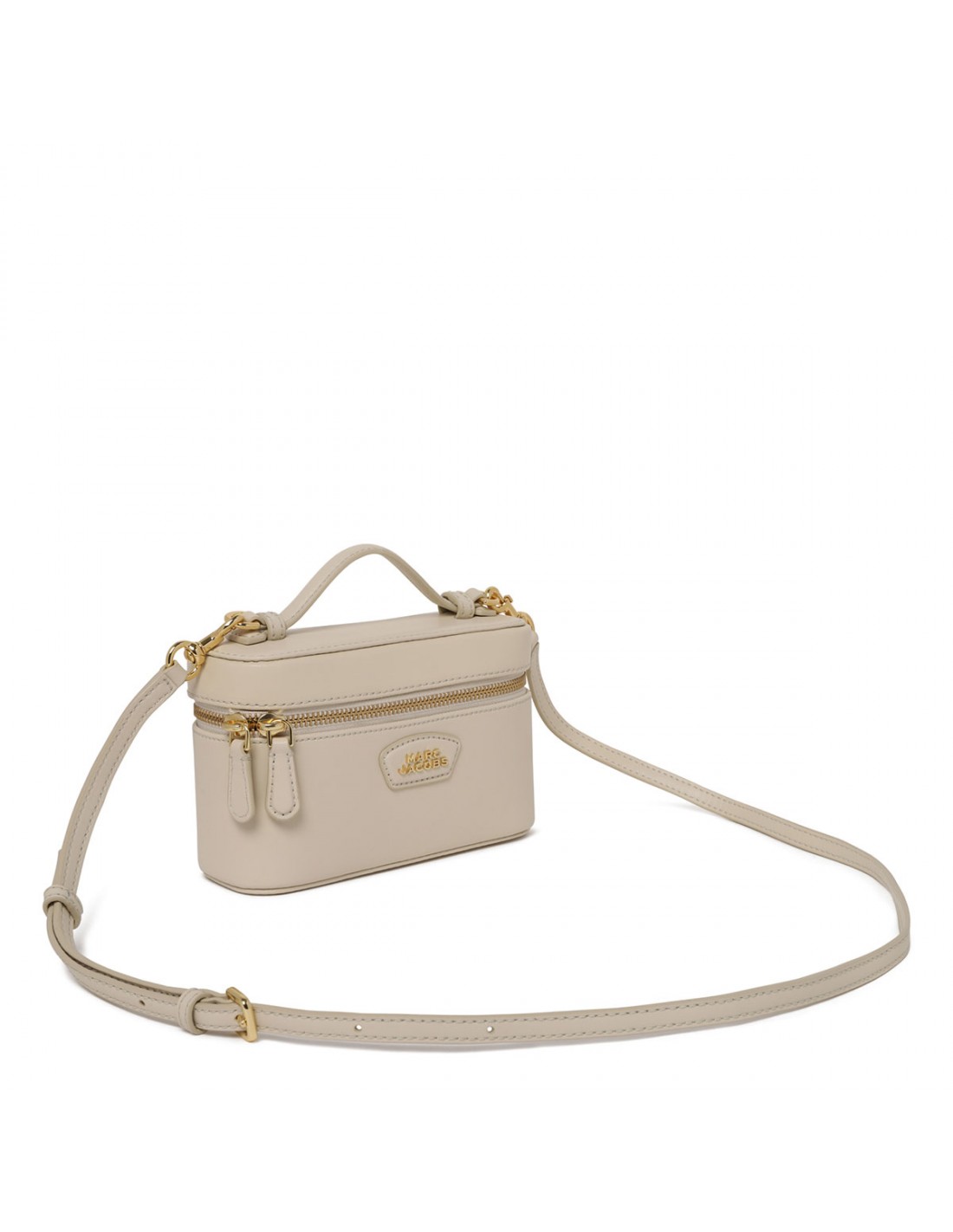 Cloud white smooth leather The Everyday vanity bag from Marc Jacobs featuring structured and boxy shape, zip-around fastening, leather top handle, adjustable and detachable shoulder strap, metal logo branding, twill lining.