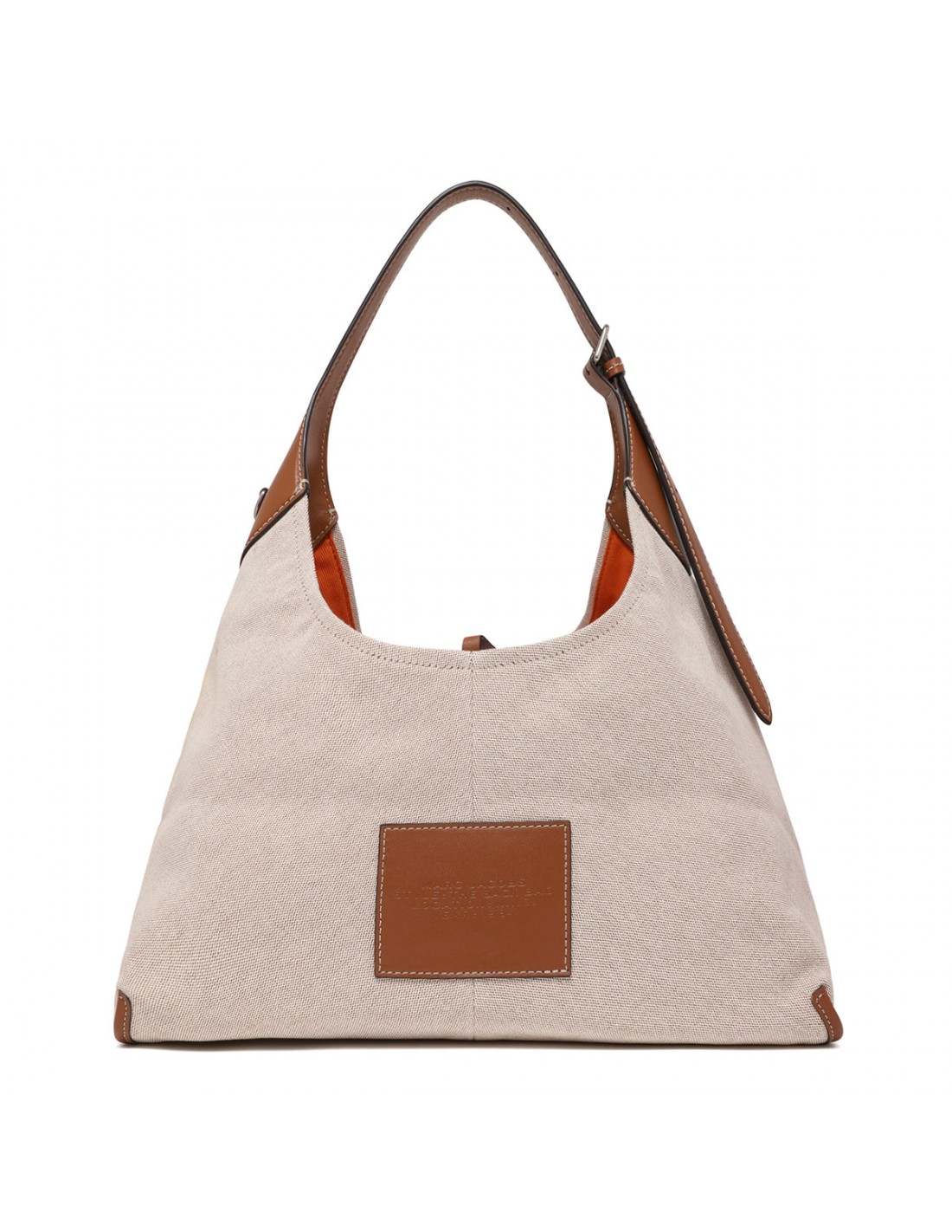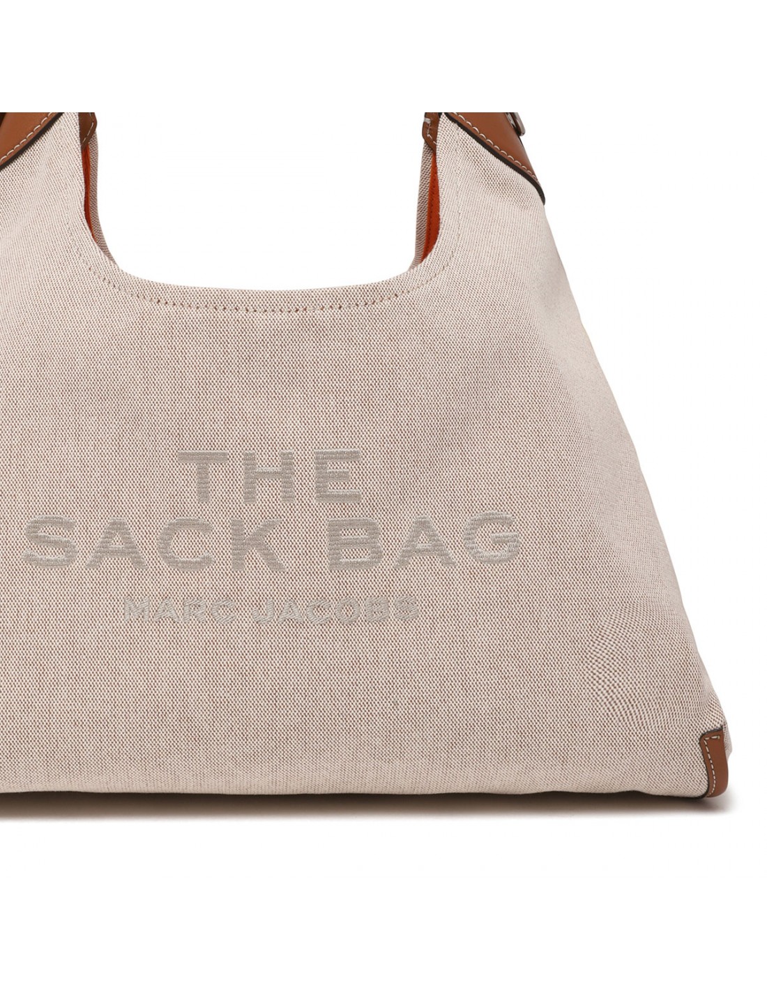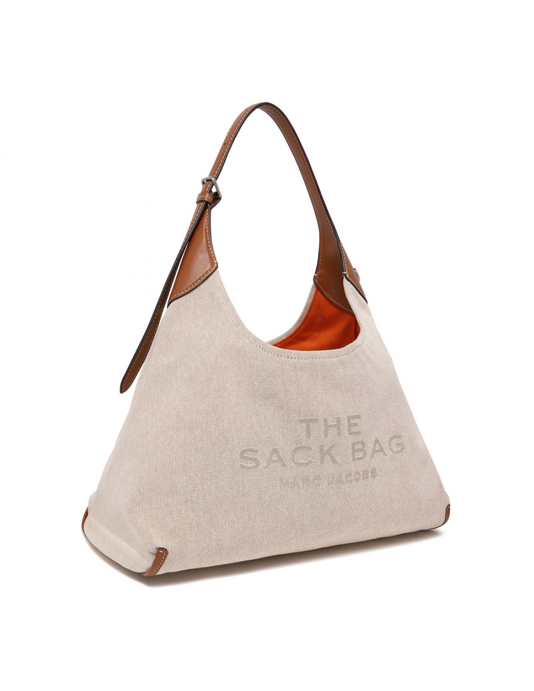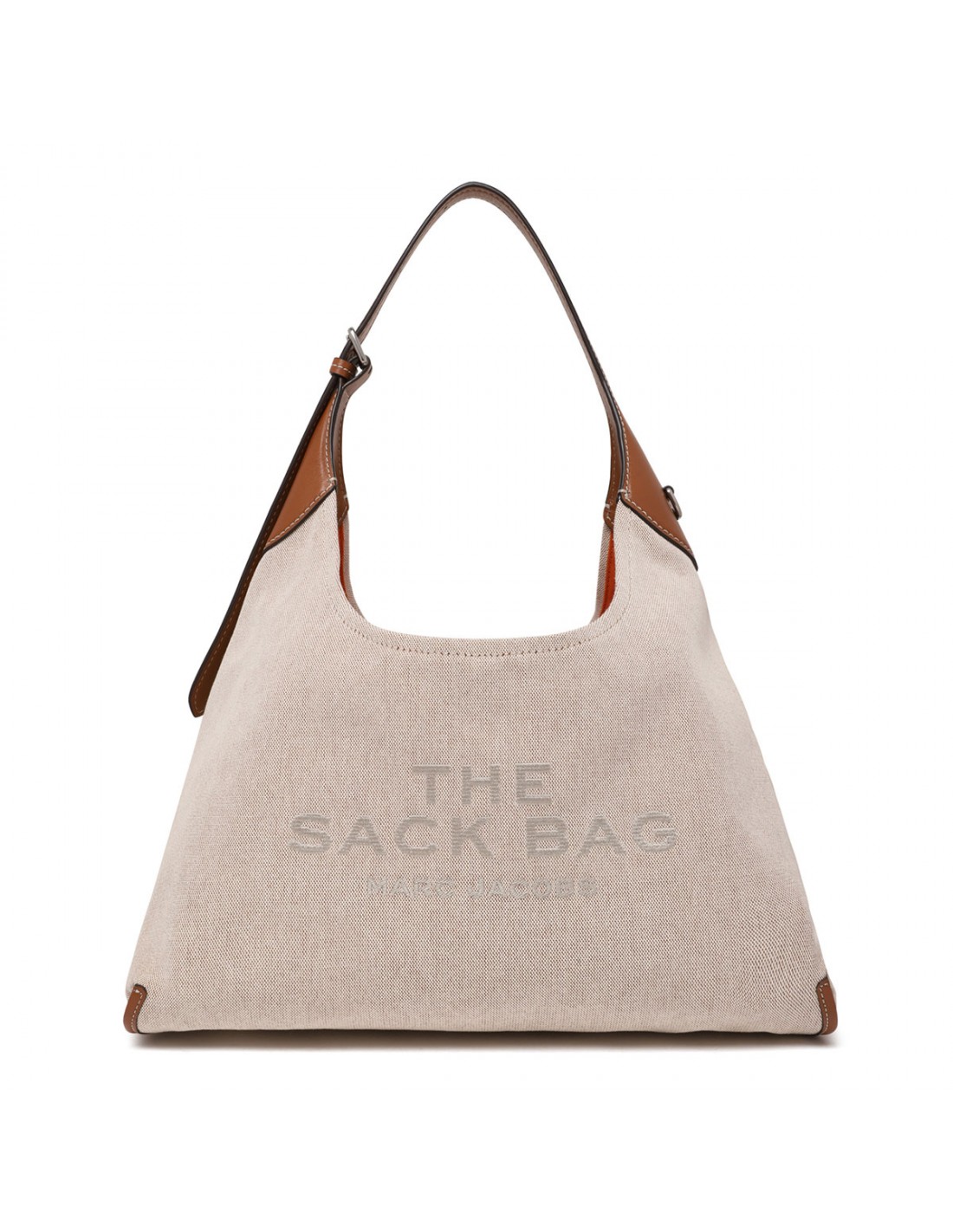Ivory canvas The Sack bag from Marc Jacobs featuring brown leather trim details, dog clip closure, adjustable top handle, logo on front and back, twill lining and internal zipped pocket.