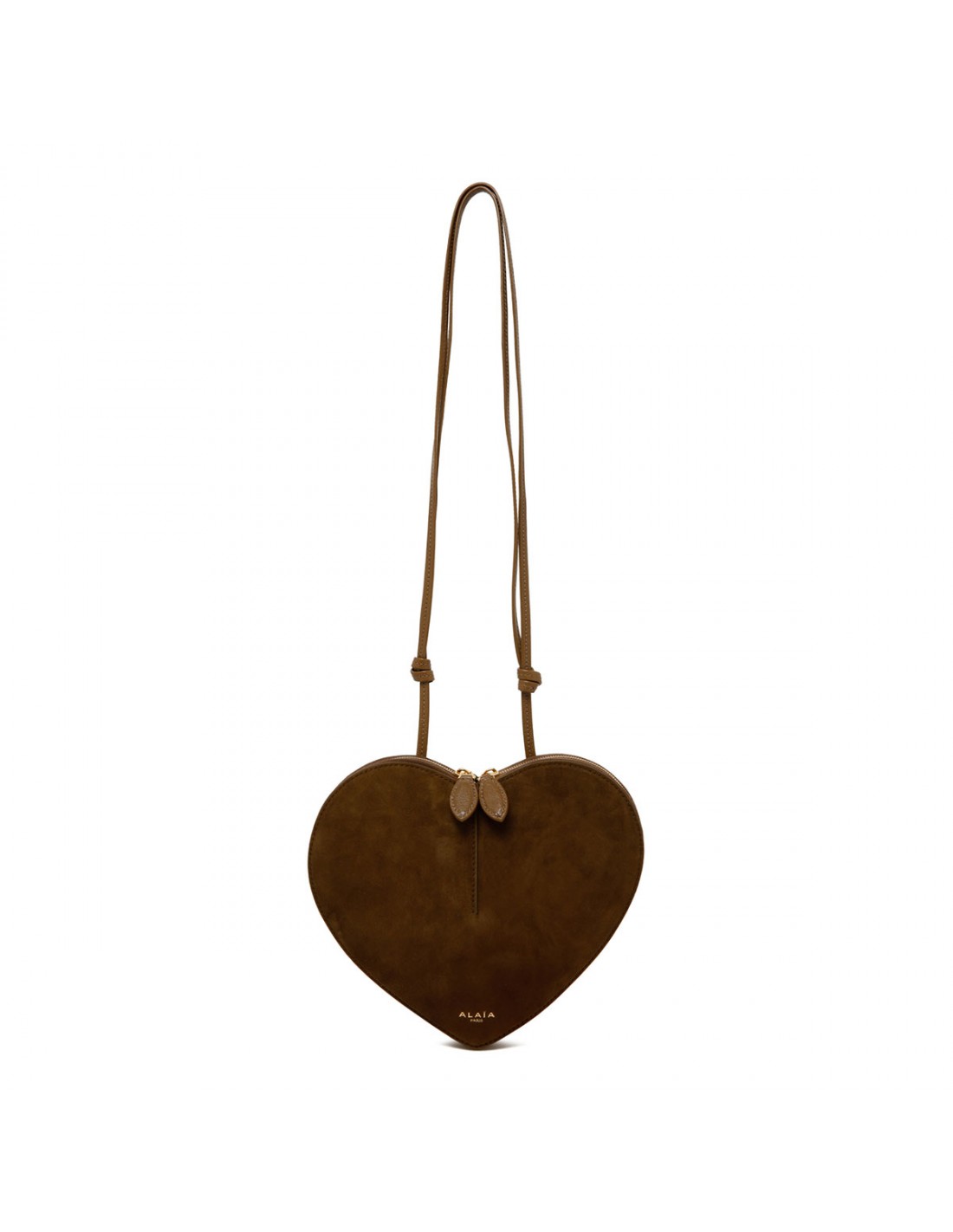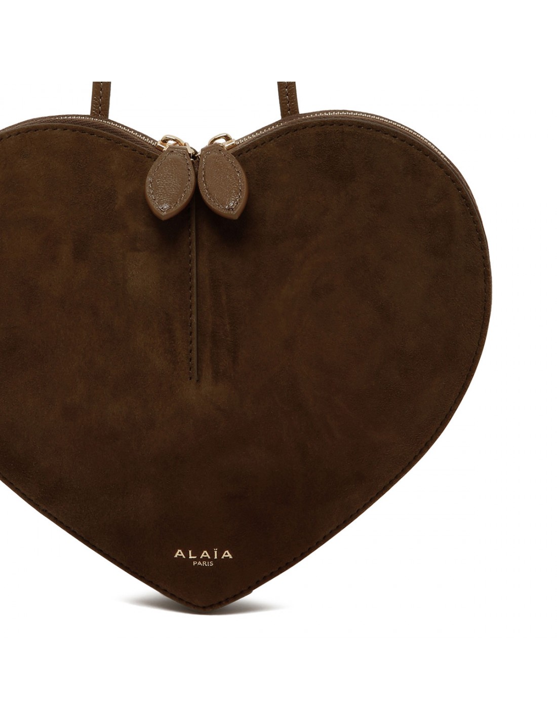 Khaki green suede leather Le Coeur bag from Alaia featuring heart-shape, two-way zip fastening and adjustable shoulder strap.