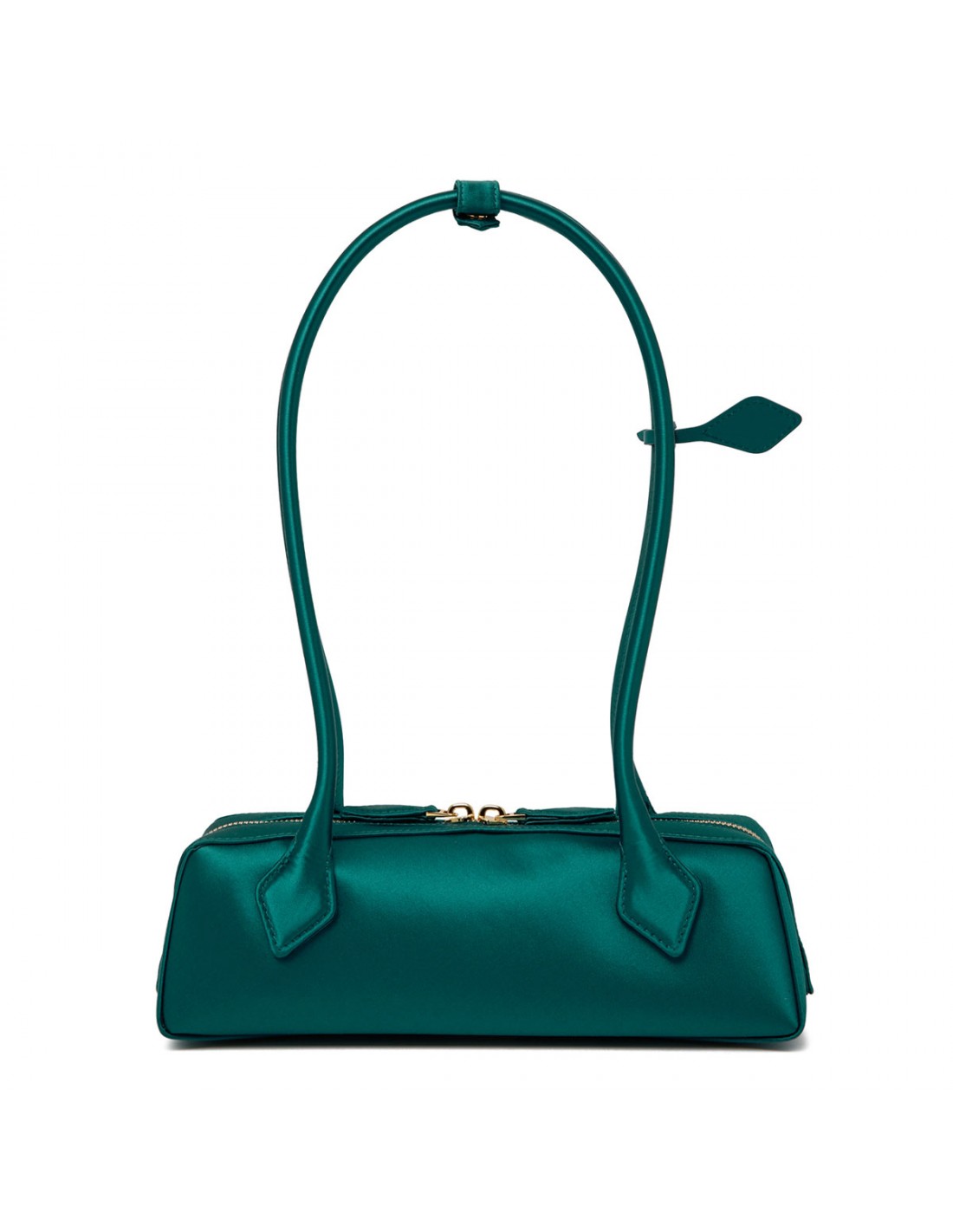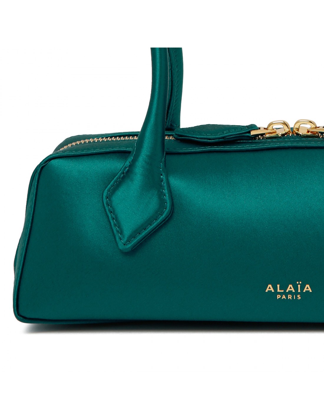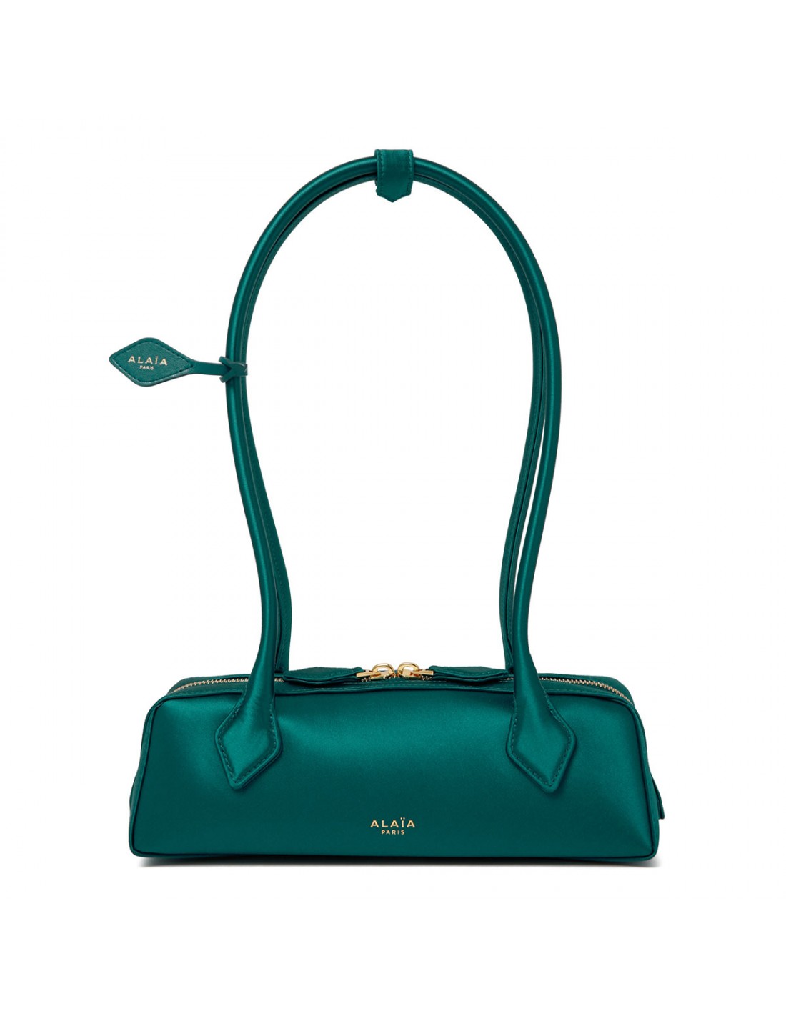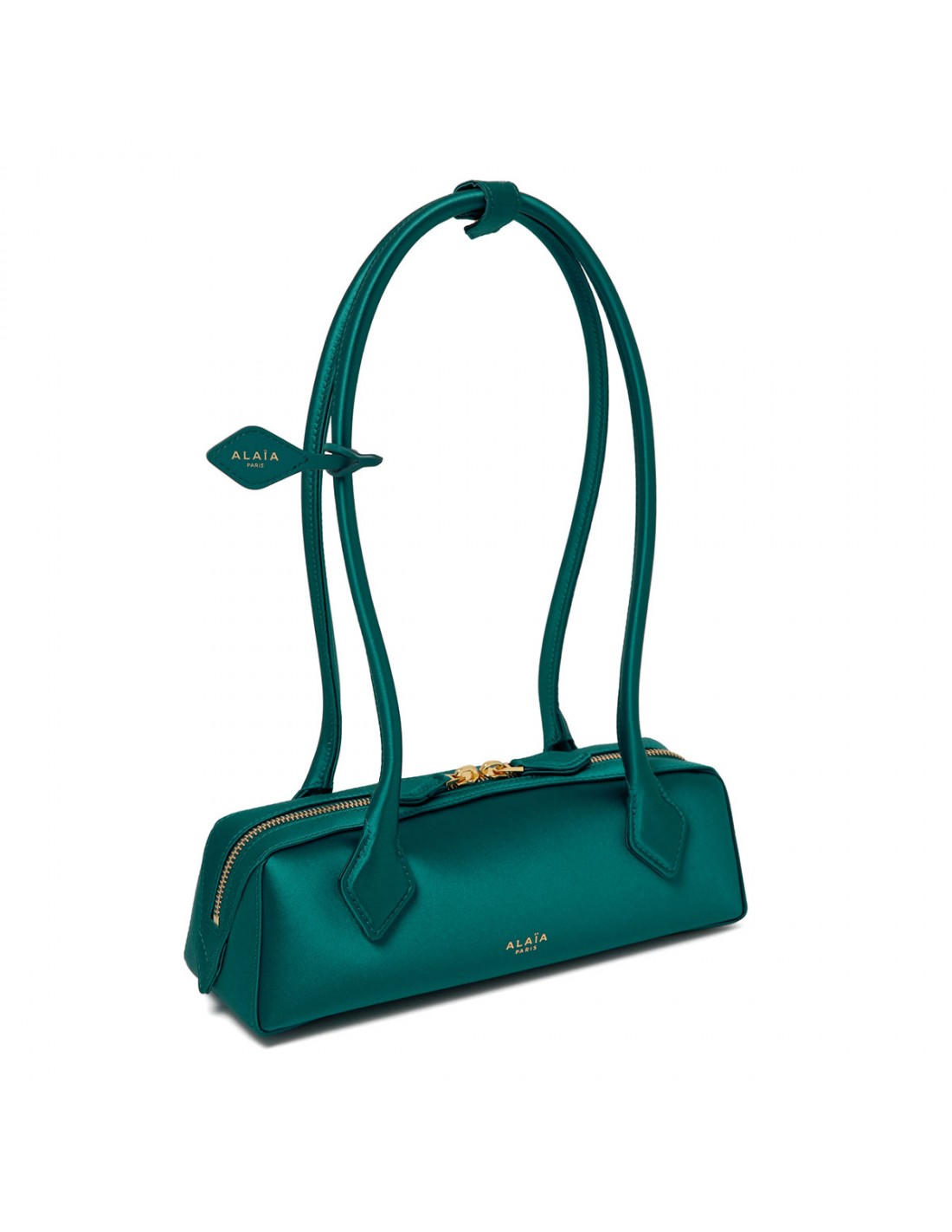 Emerald green silk satin Le Teckel small bag from Alaia featuring elongated shape, double tubular leather top handle with two decorative ties, two-way zip fastening along top, detachable small mirror in the inner pocket.