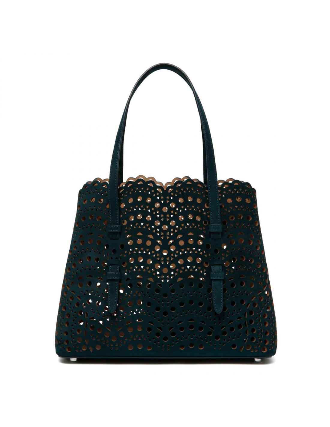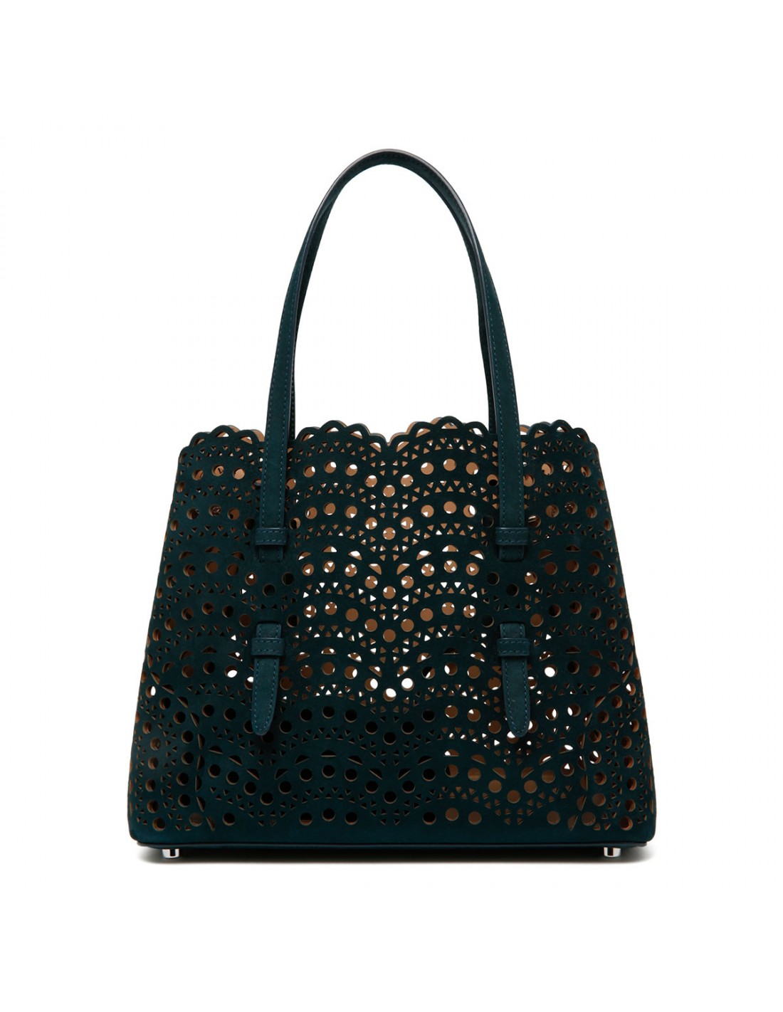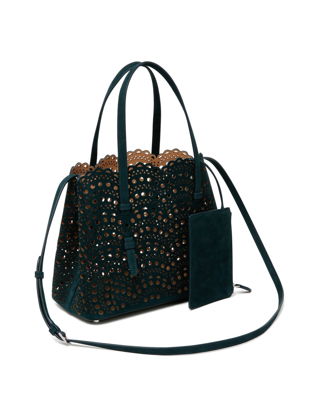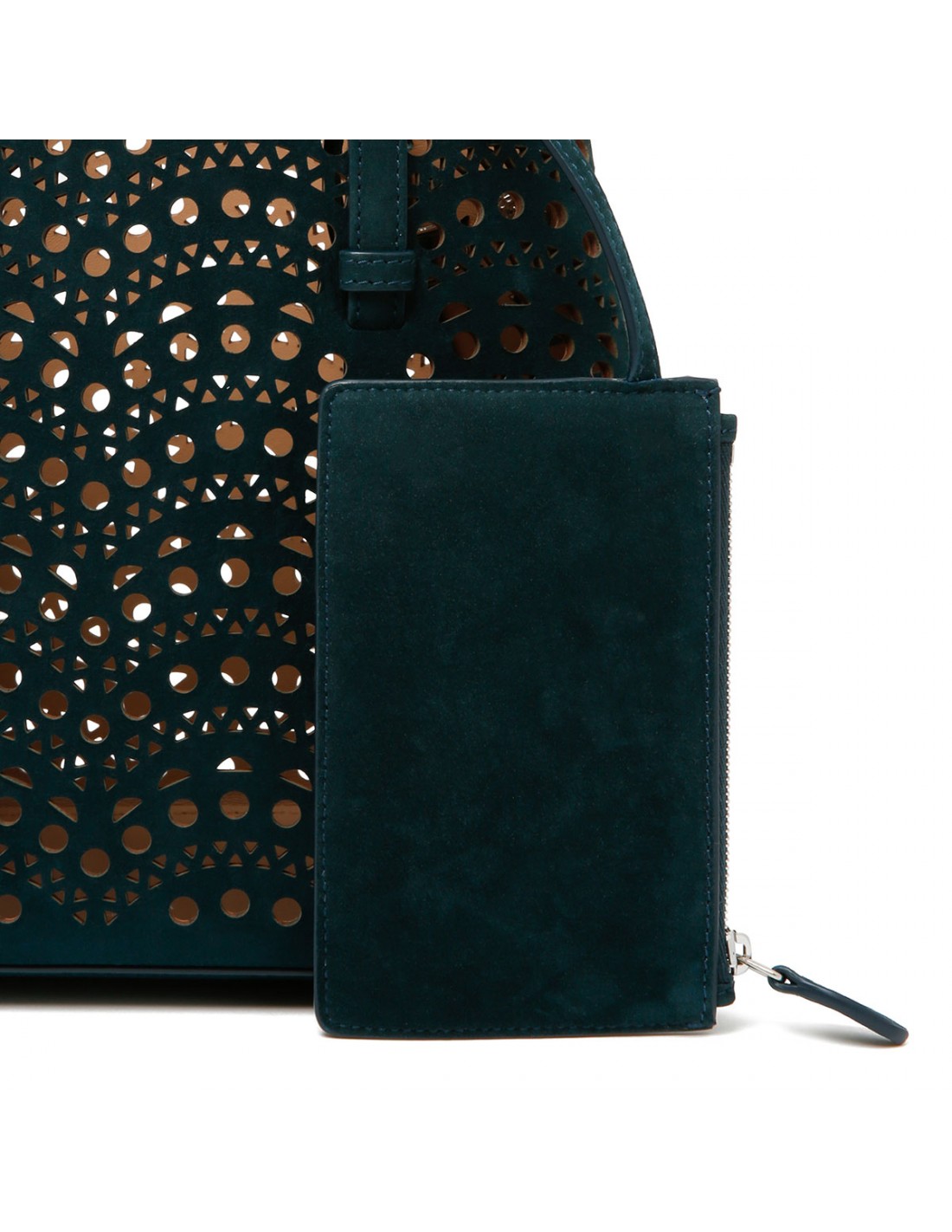 Peacock blue suede leather Mina 25 tote bag from Alaia featuring Vienne wave pattern, snap-fastening gusseted sides, double top handle, zipped leather pouch, adjustable shoulder strap.
