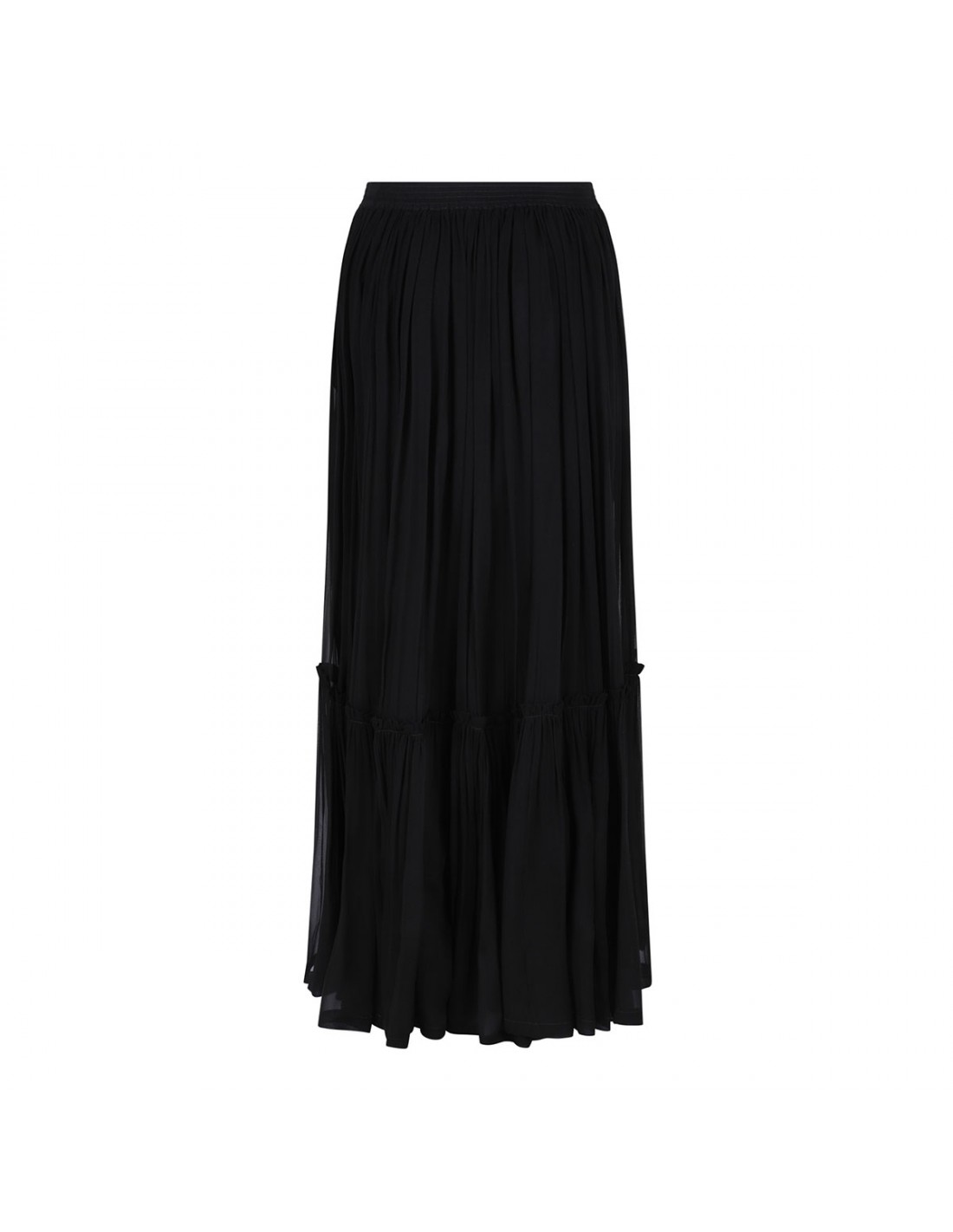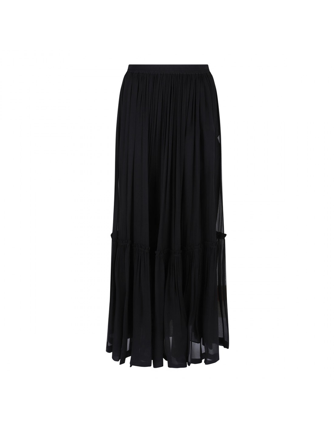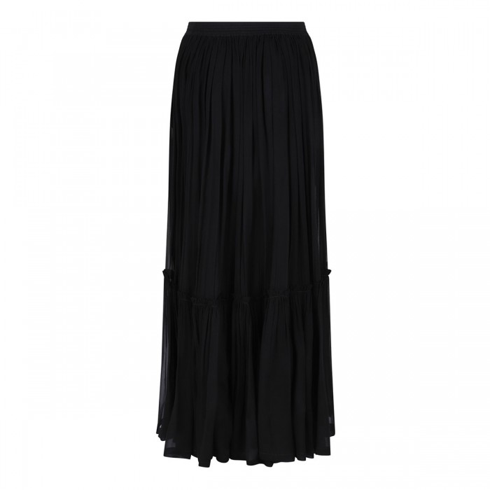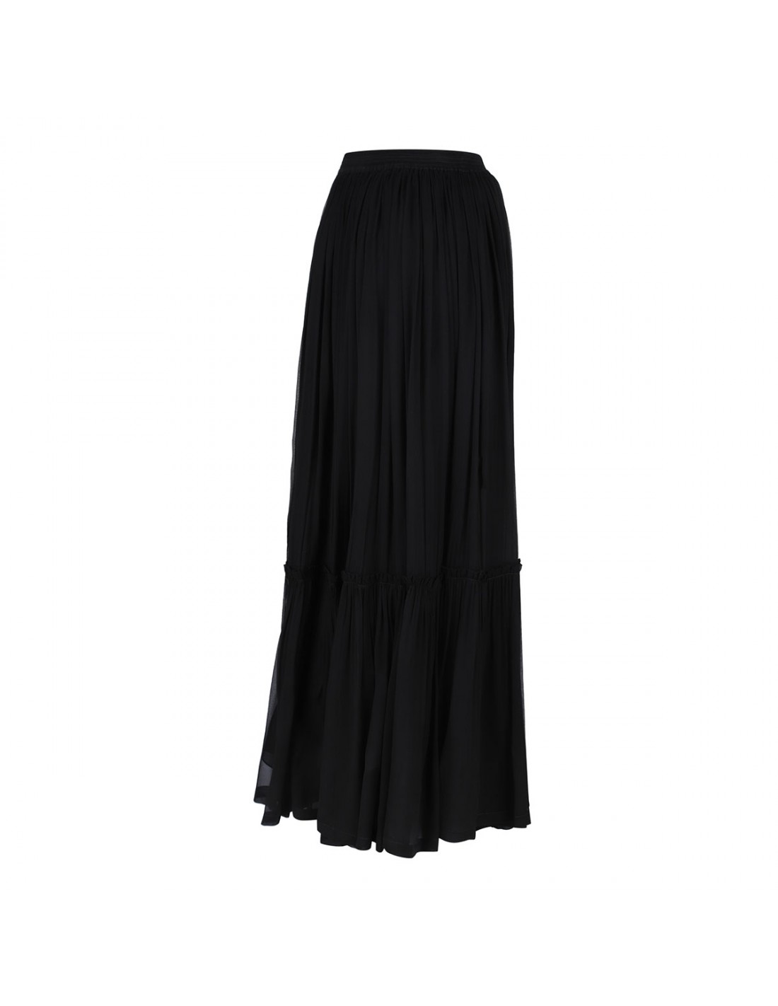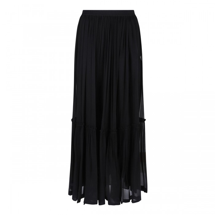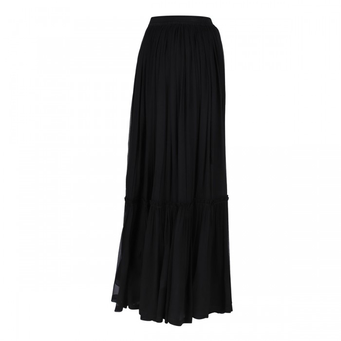 Black sheer silk crepe muslin long skirt from Saint Laurent featuring prairie style, concealed side pockets, concealed zip fastening at side, elastic waist, silk georgette half slip.