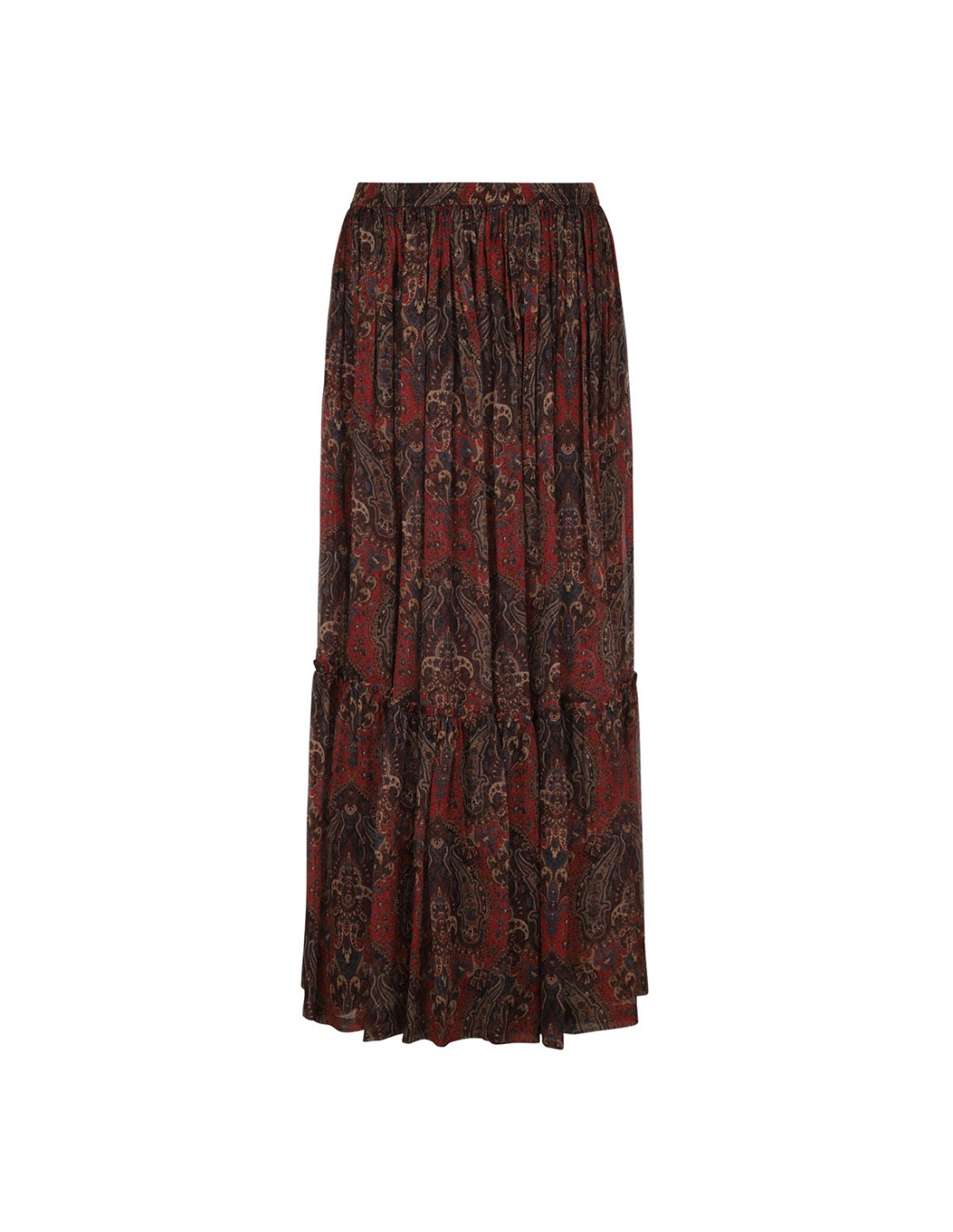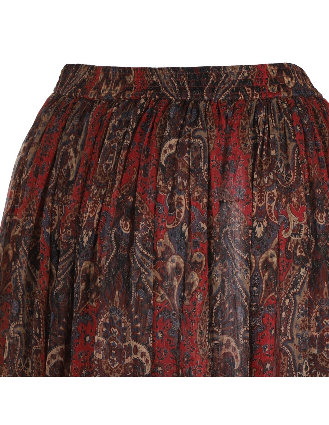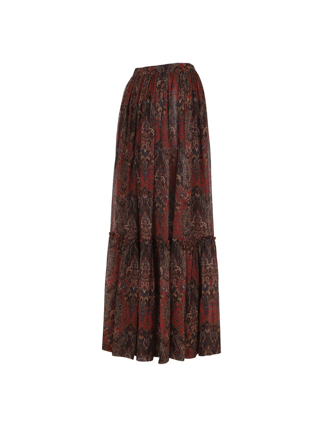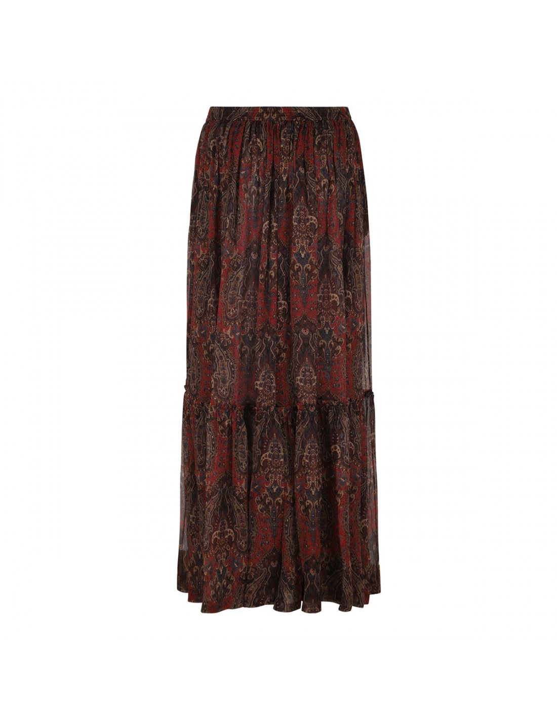 Multicolor silk crepon prairie skirt from Saint Laurent featuring paisley motif printed allover, concealed side zip closure, elastic waist, concealed side pockets, silk georgette half slip.