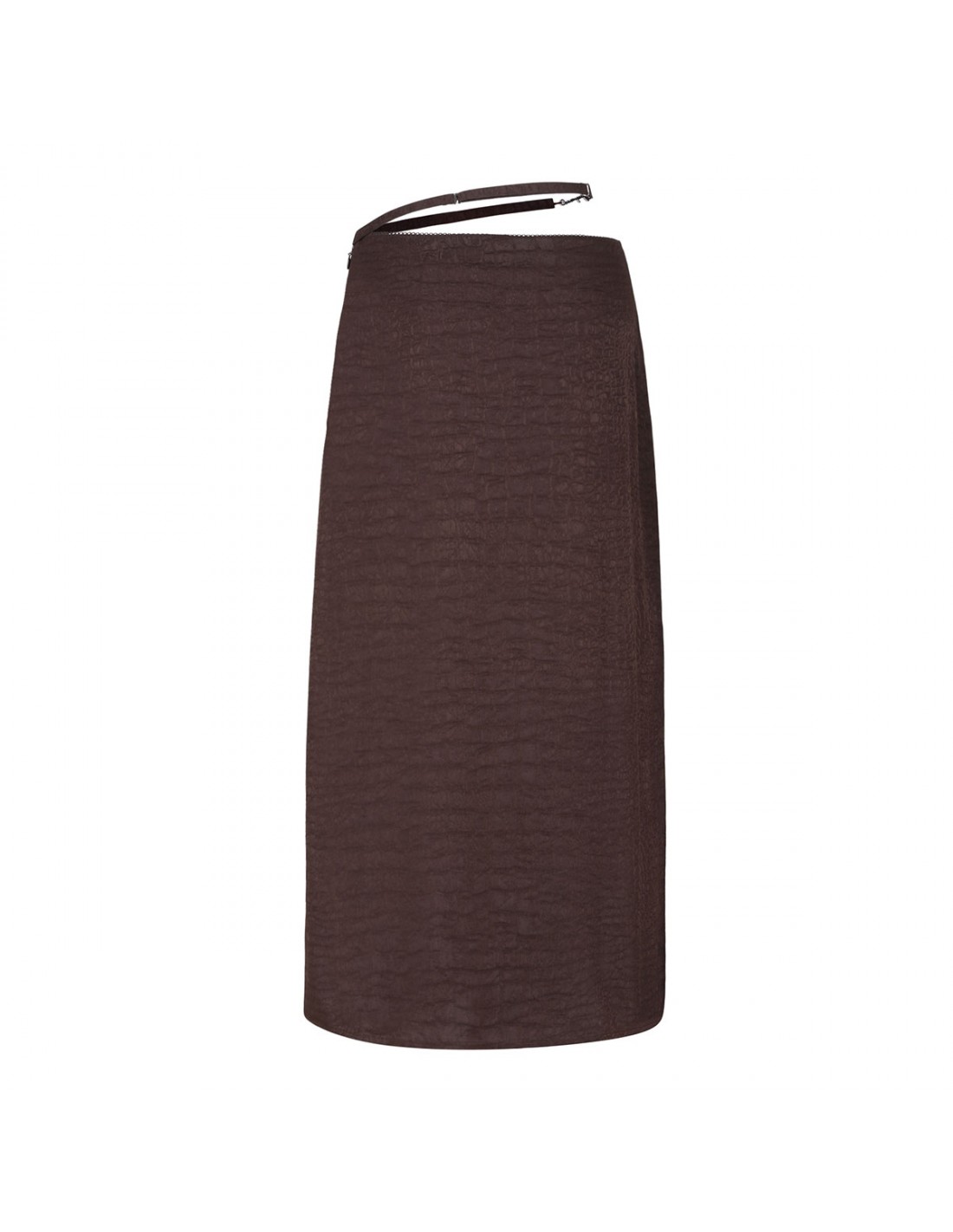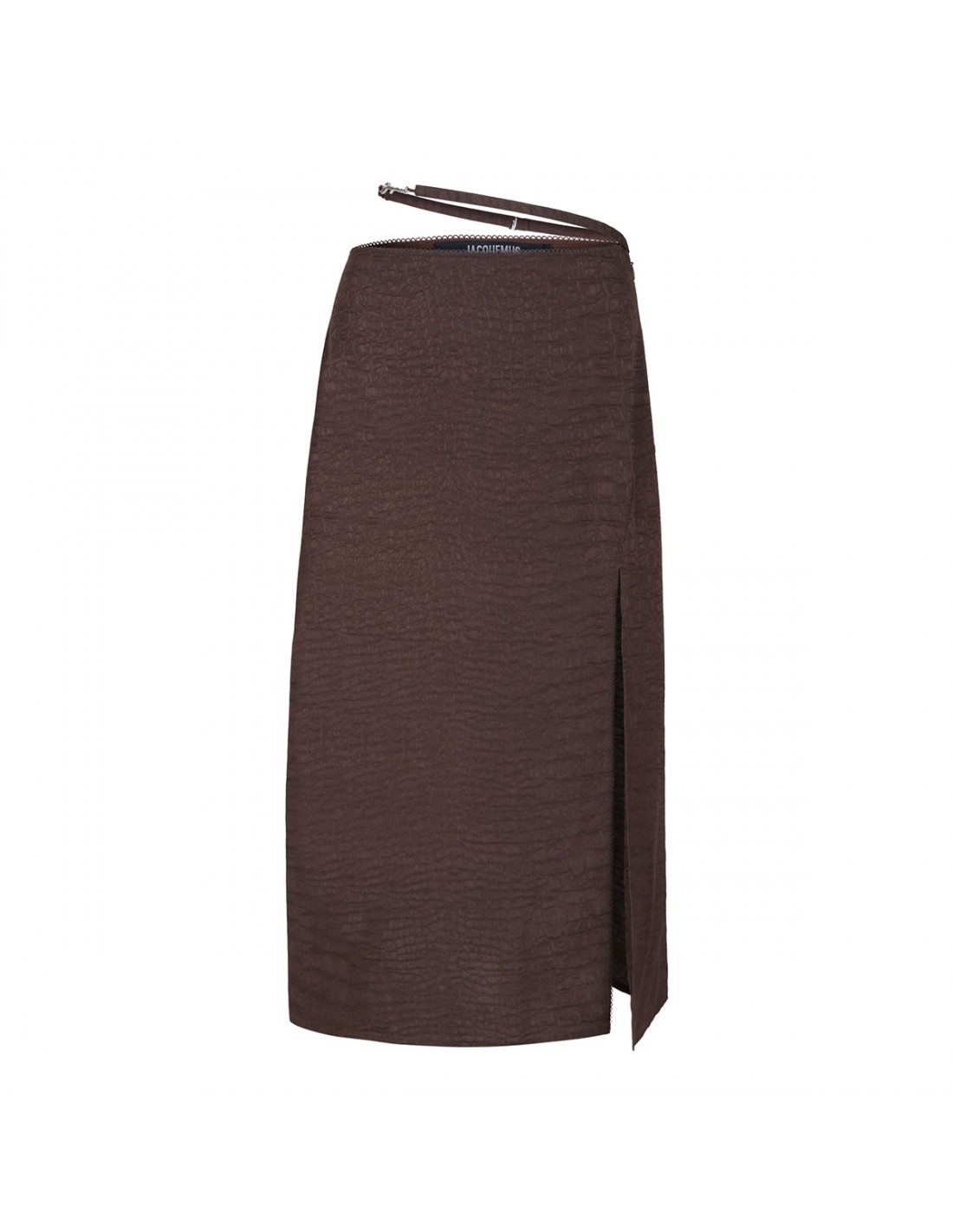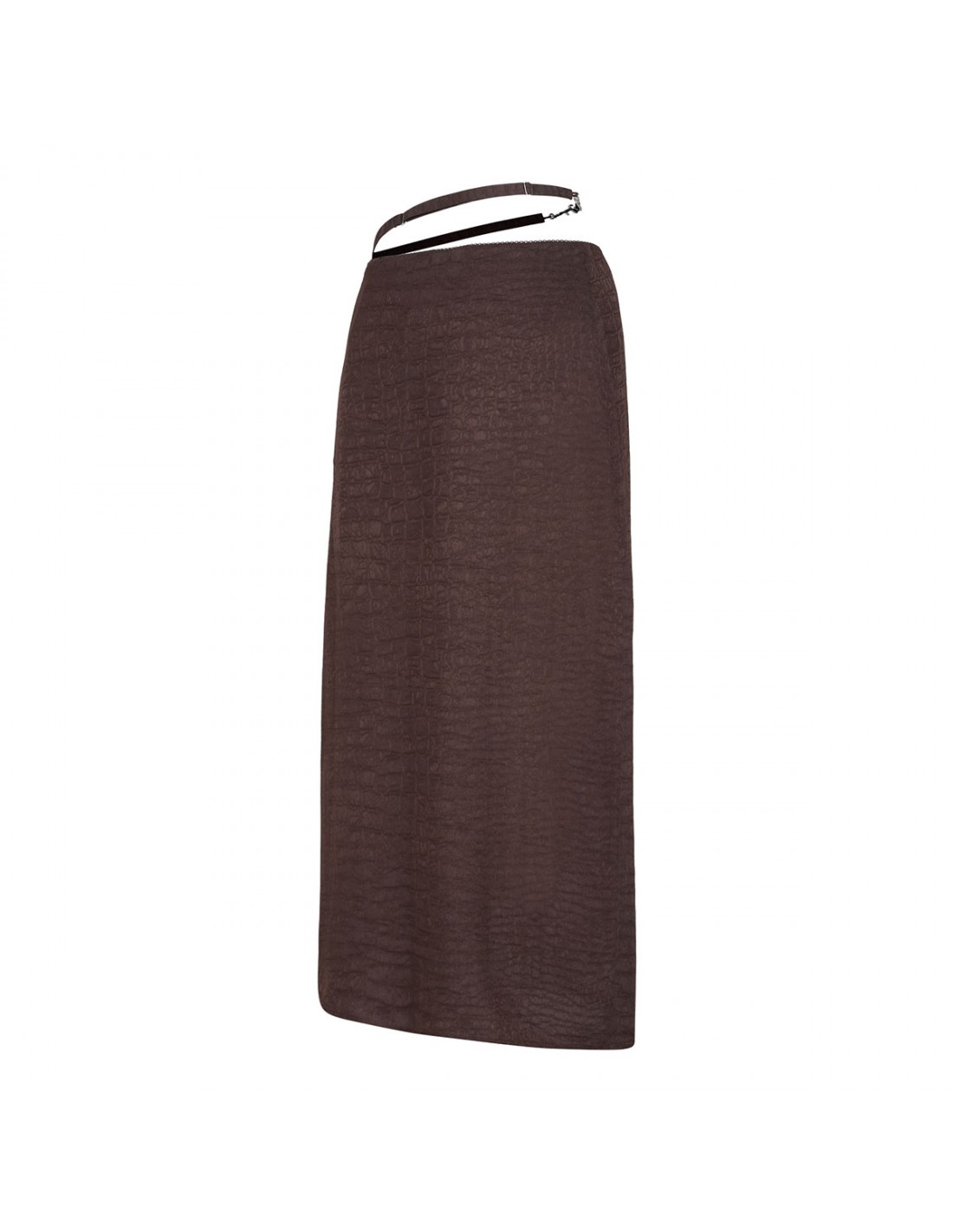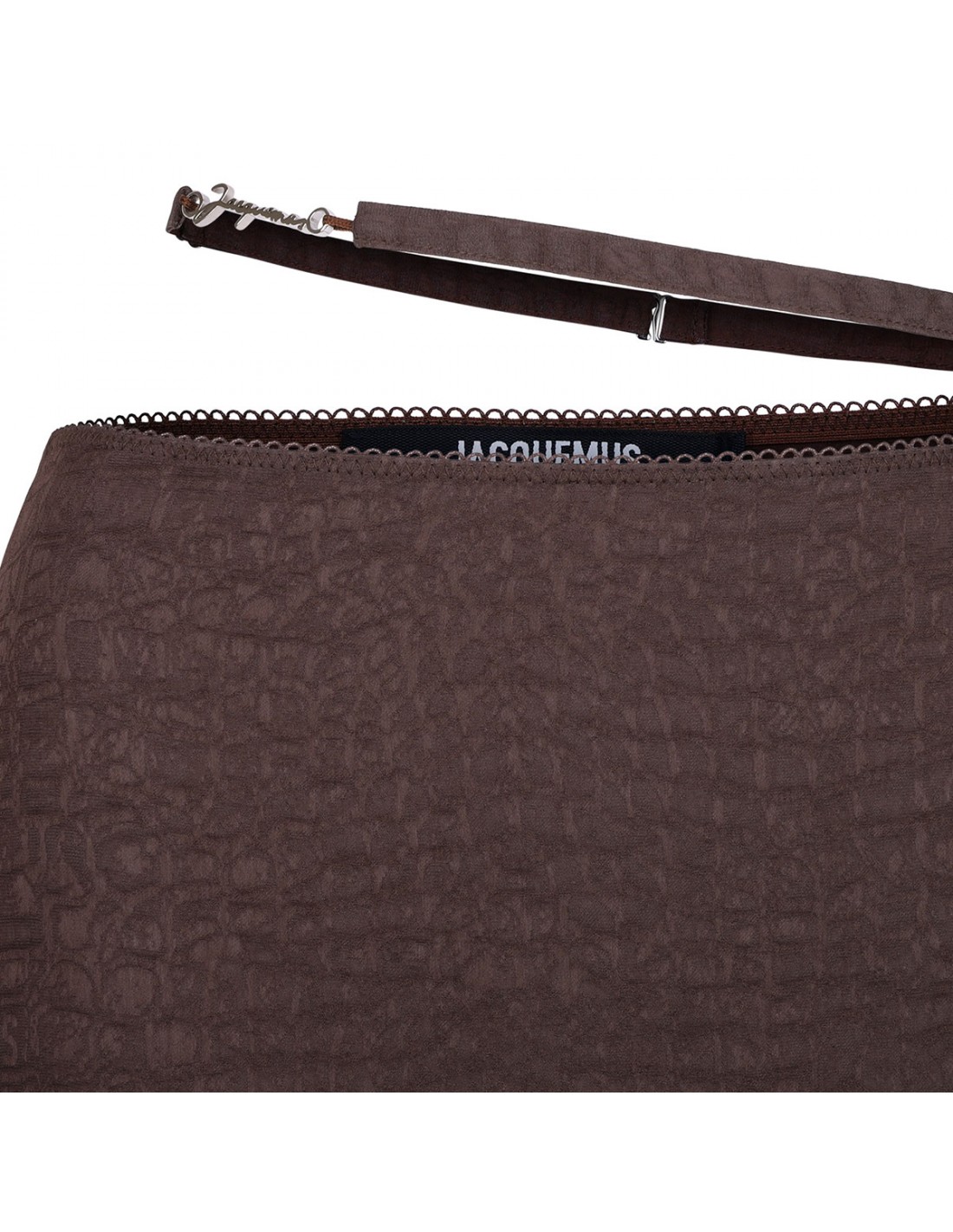 Brown crocodile viscose jacquard The Notte skirt from Jacquemus featuring gold metal charm-logo, below-the-knee length, high waist with adjustable lingerie strap, side slit, concealed zip fastening at side.