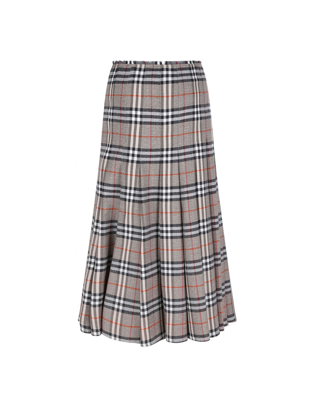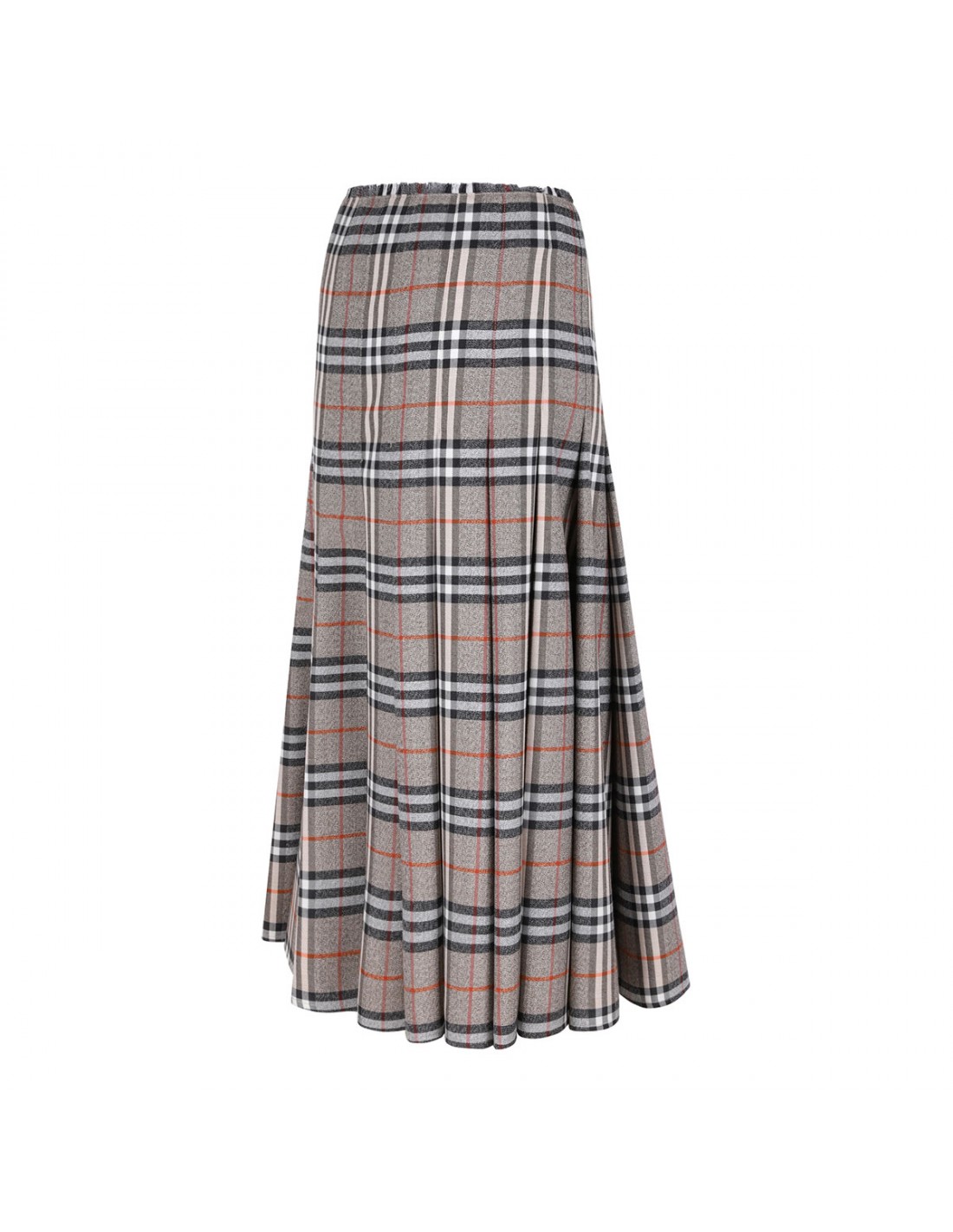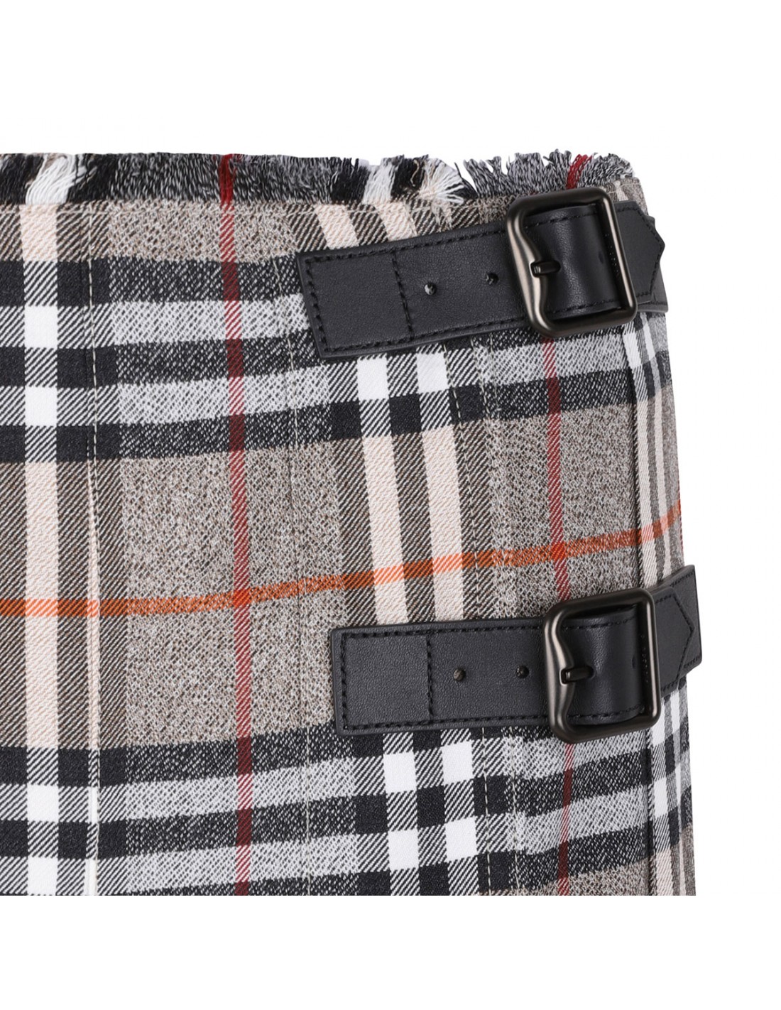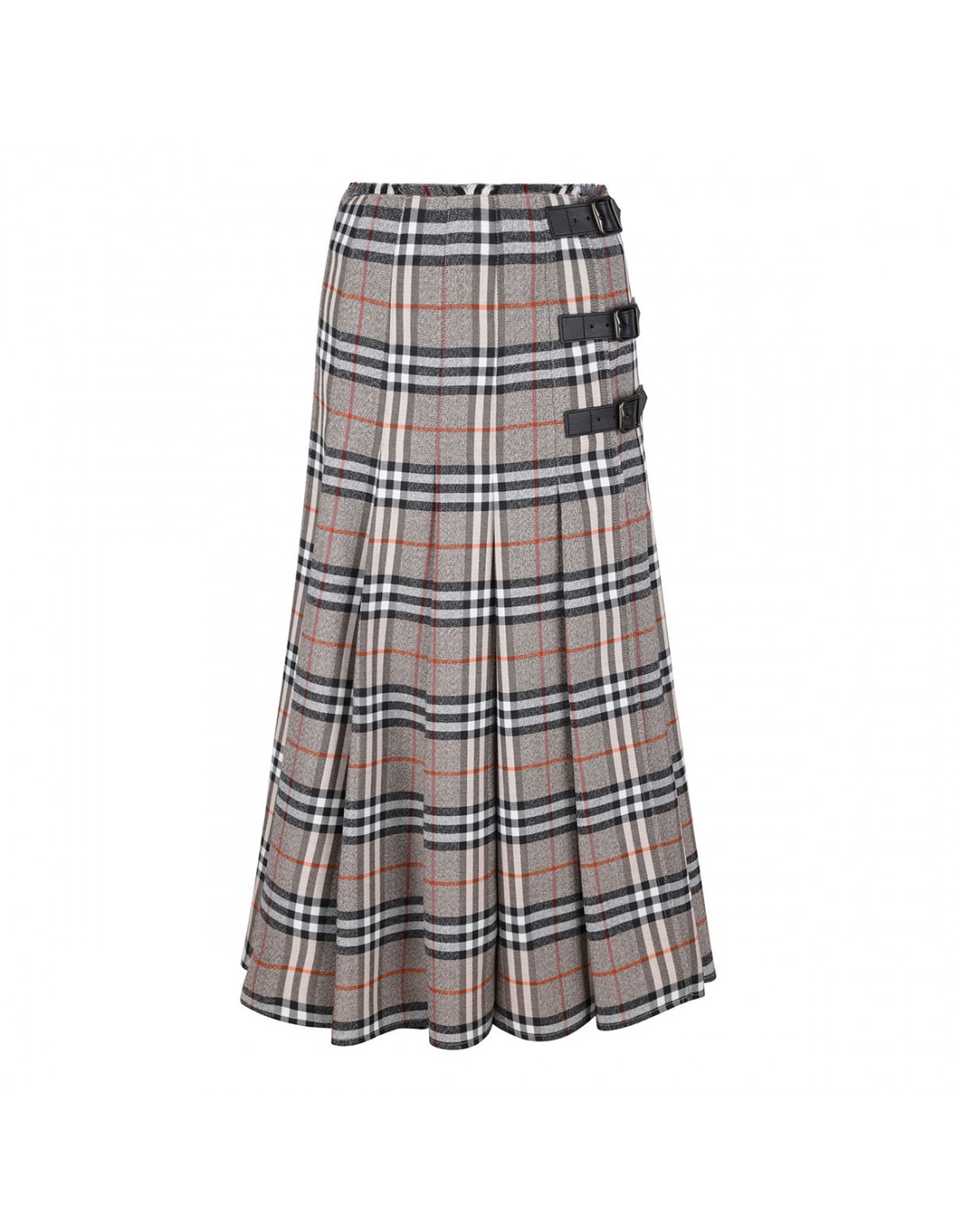 Gray wool midi kilt from Burberry featuring iconic check motif, A-line silhouette, pleats, calf leather B buckle straps, side button and B buckle closure, eyelash fringing at the waist.