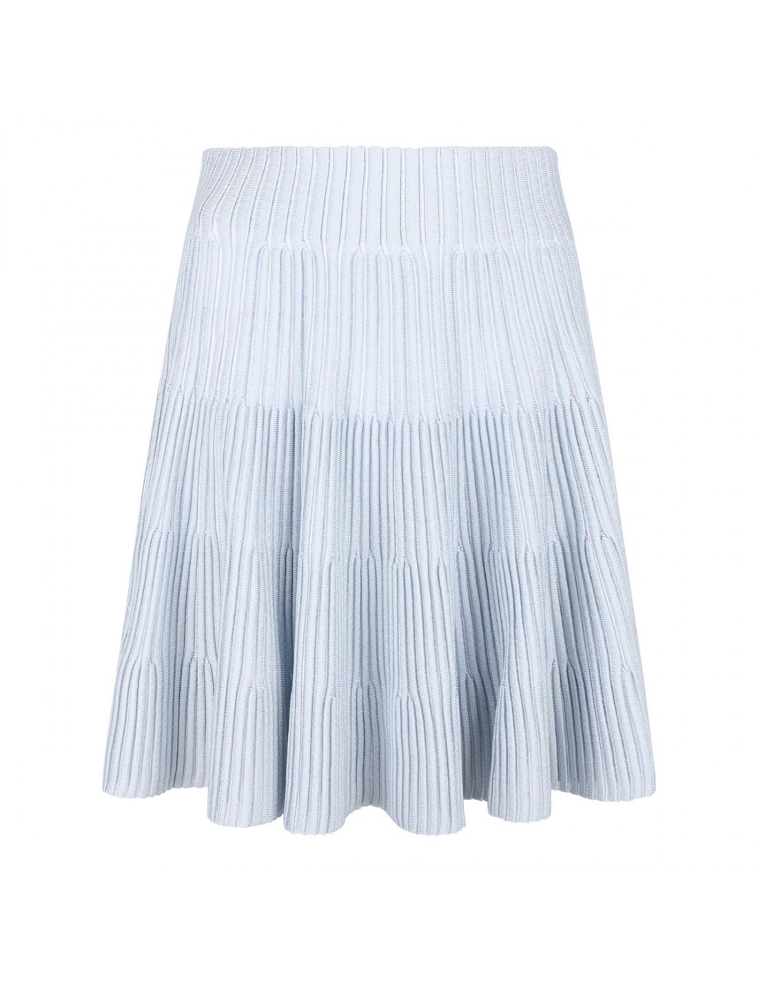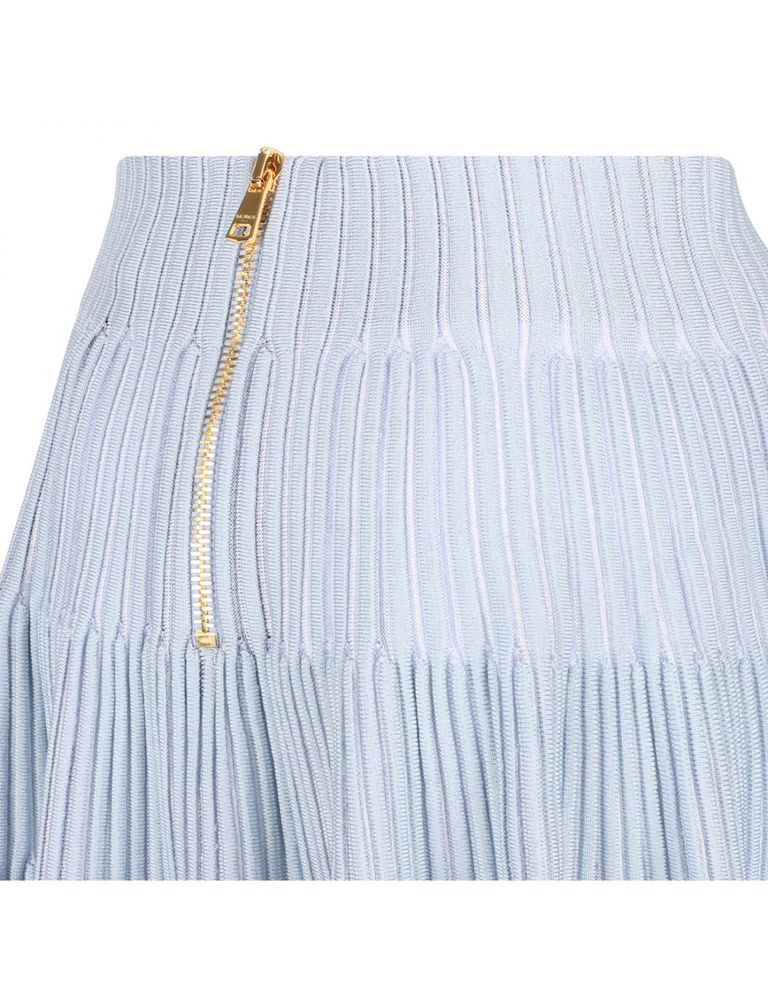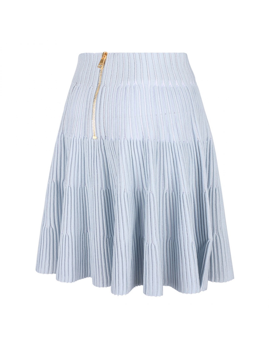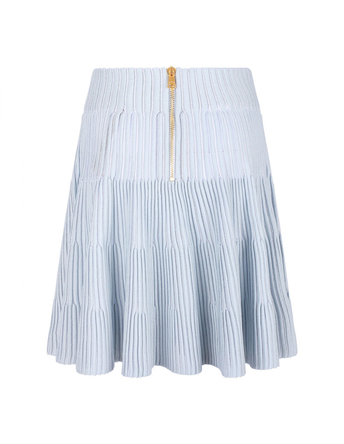 Blue textured knit skirt from Balmain featuring A-line, reinforced waistband, exposed gold metal zip fastening on back with logo-engraved slider, mini length, flared cut.