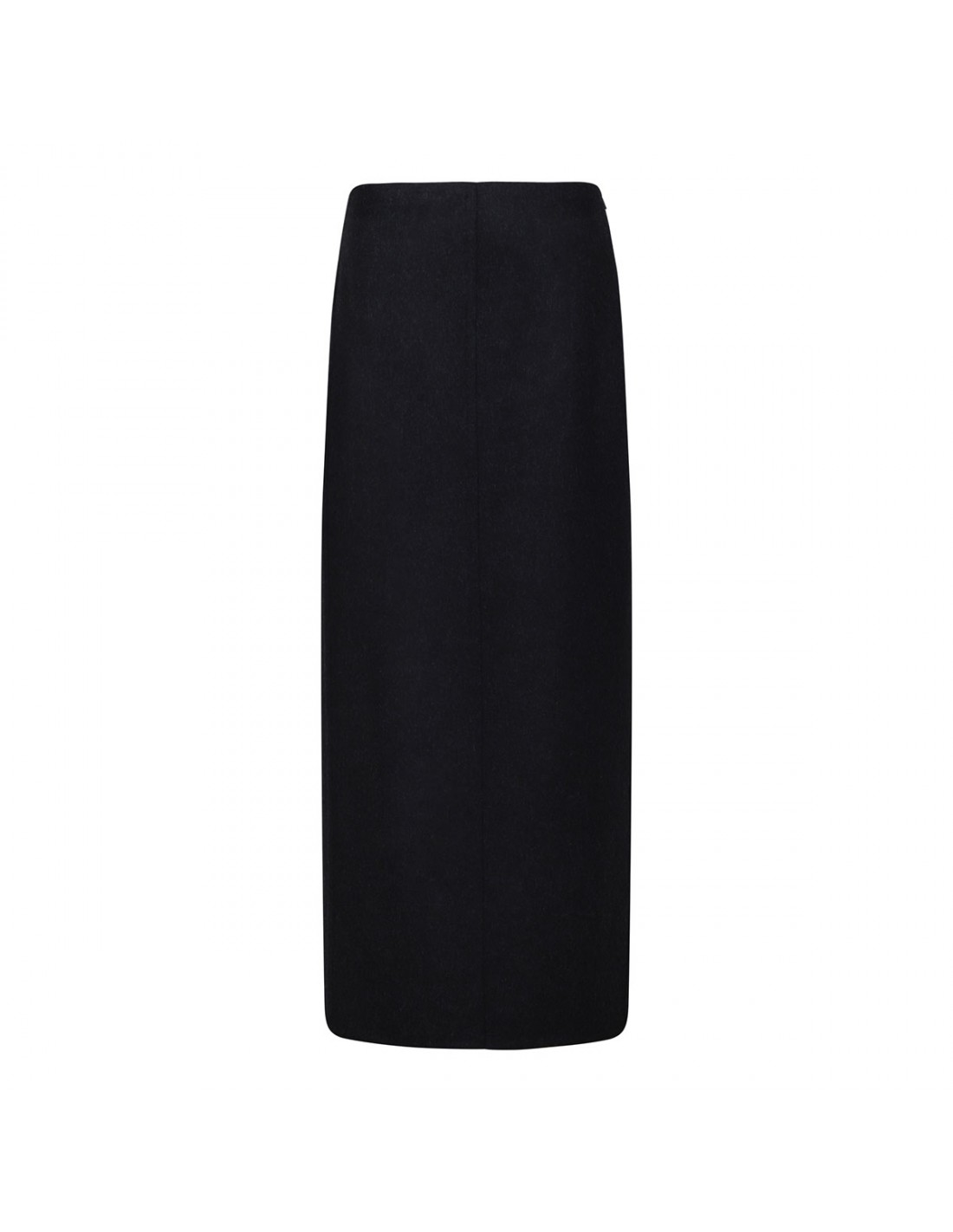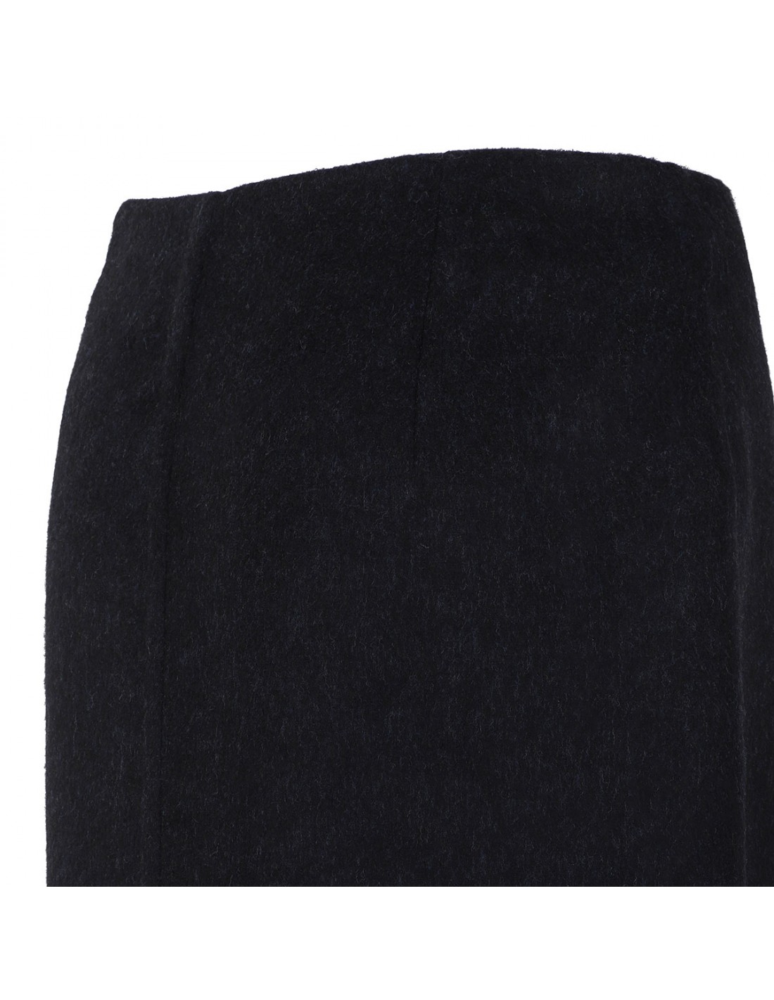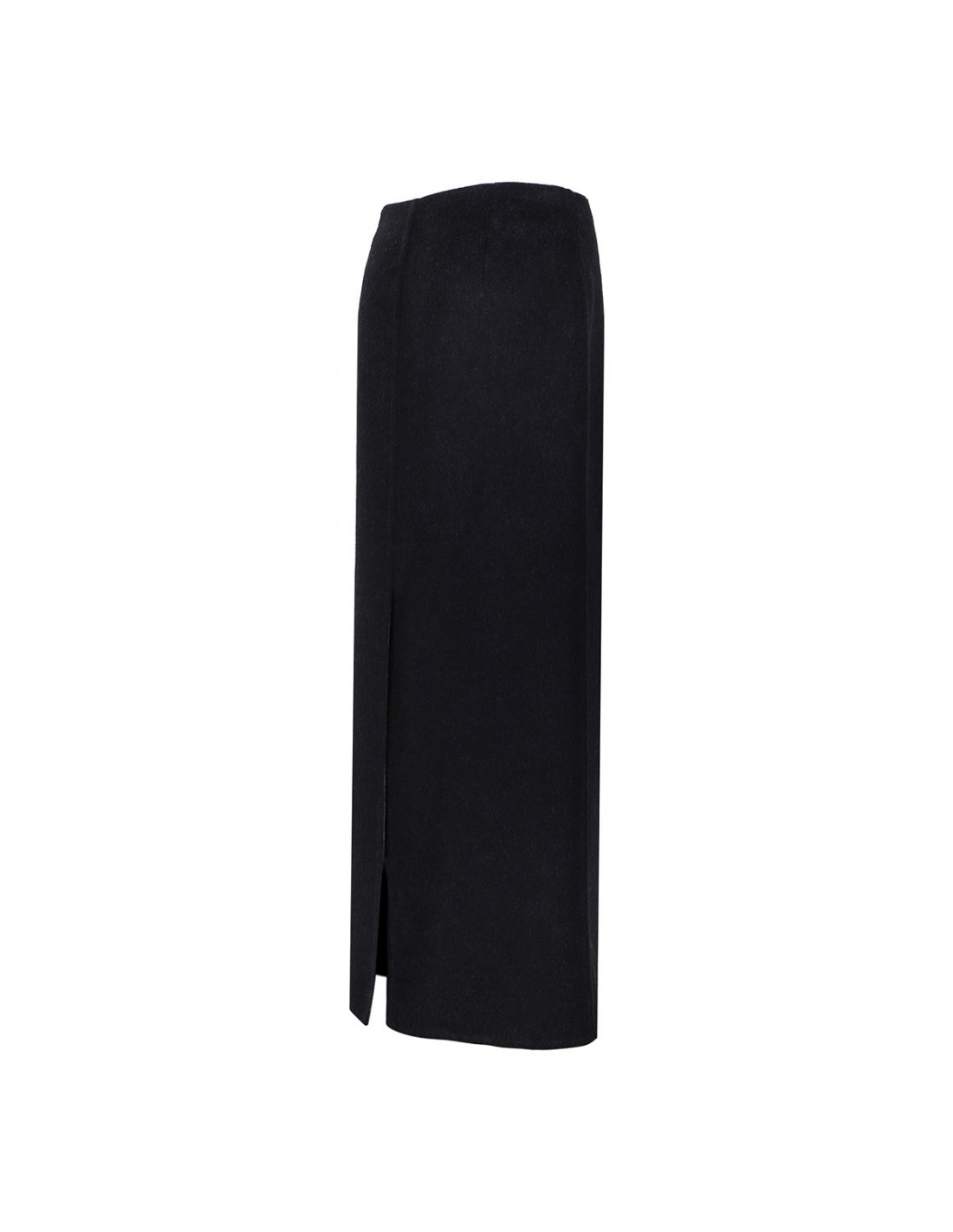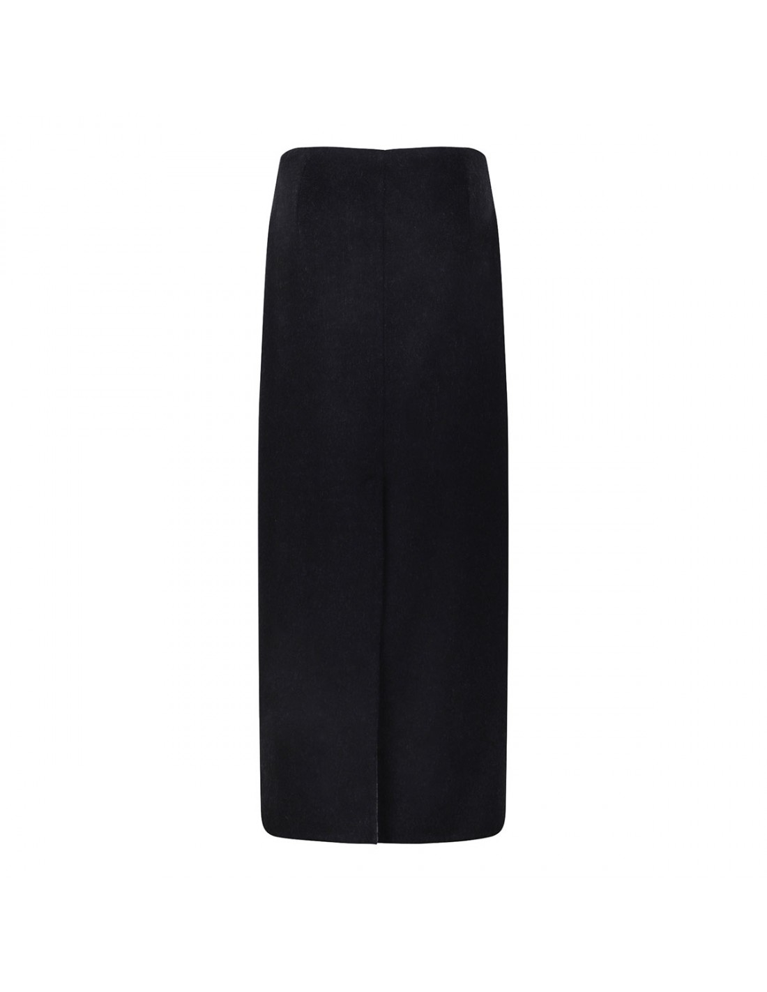 Dark blue virgin wool midi skirt from Brunello Cucinelli featuring zipper closure on side, deep slit on back, pencil silhouette.