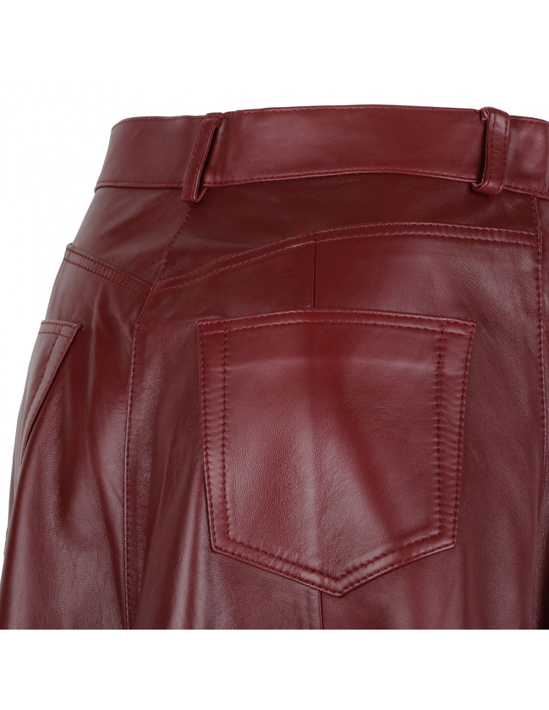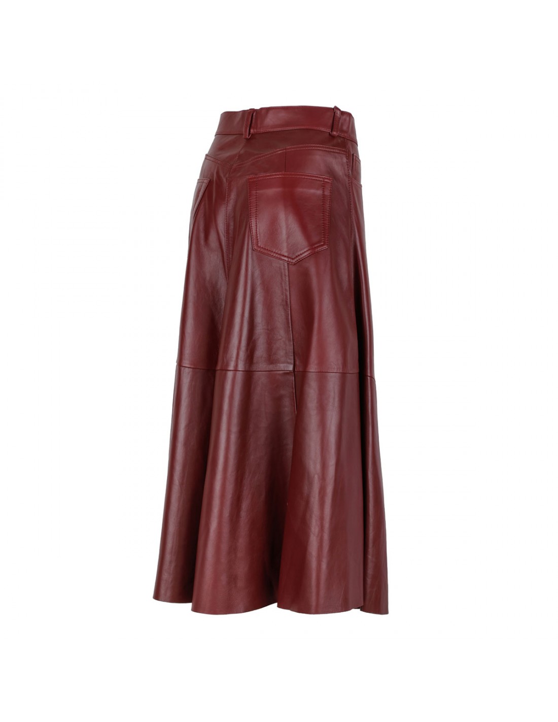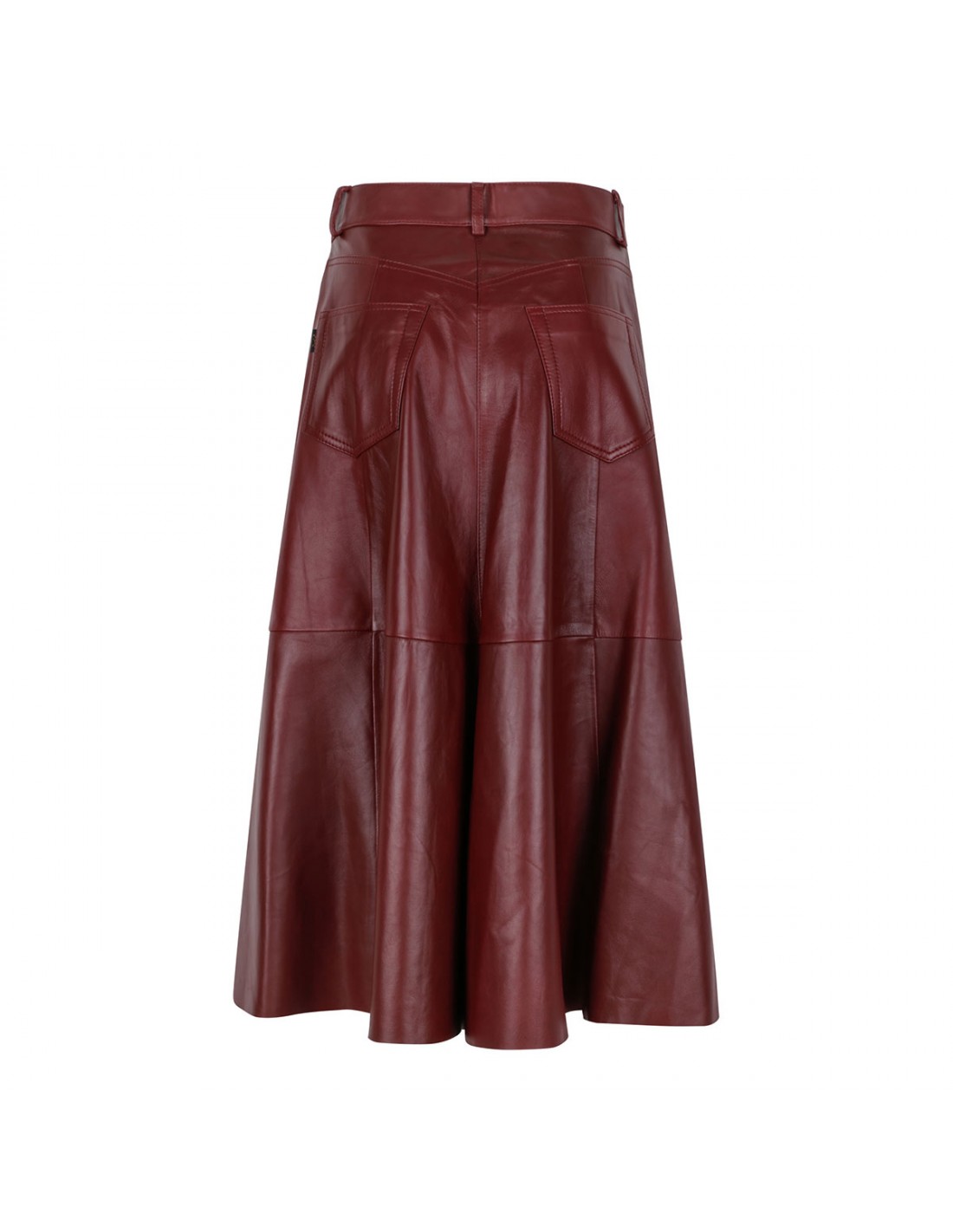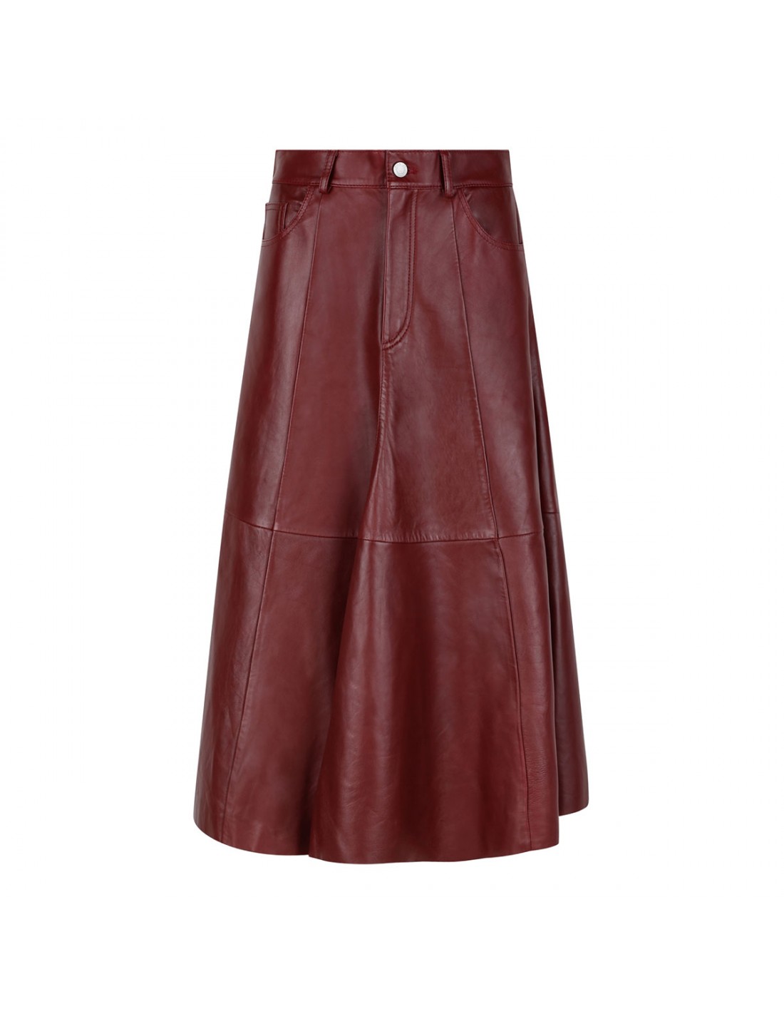 Cherry hue paneled leather Mid Serenity skirt from Haikure featuring folds through the hem, button and concealed zip fastening at front, classic five-pocket style, belt loops on the waistband.