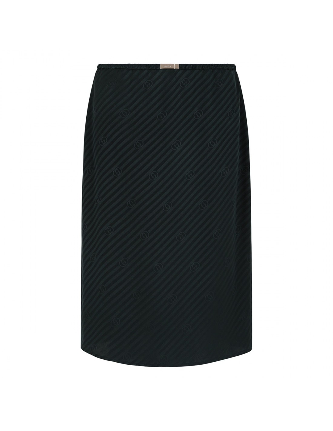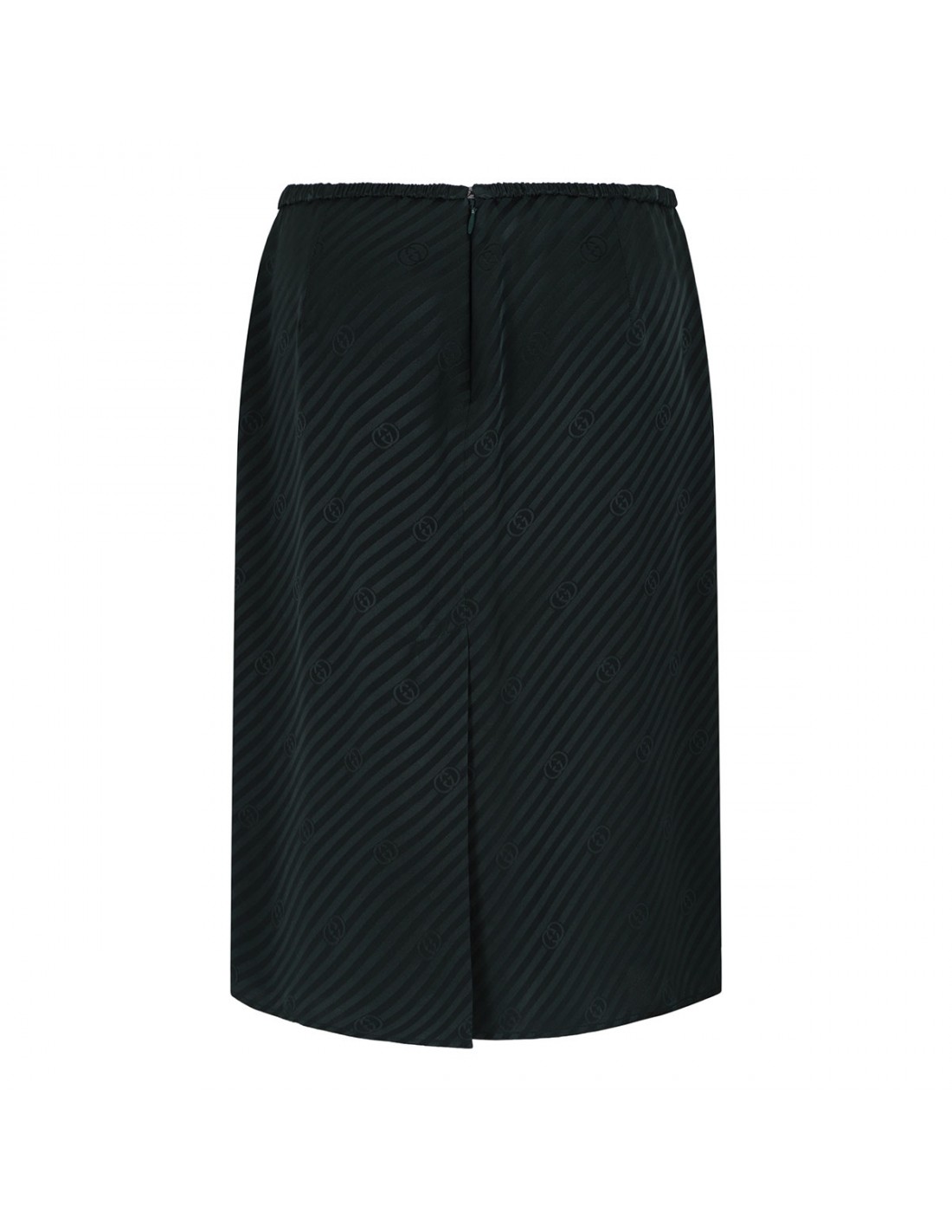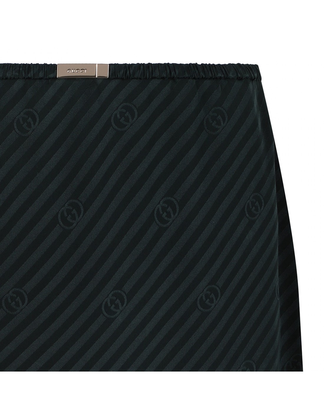 Dark bottle green silk skirt from Gucci featuring interlocking G jacquard motif, Gucci equestrian belts print, ruched elastic waist with metal logo buckle, zip fastening along back and back slit.