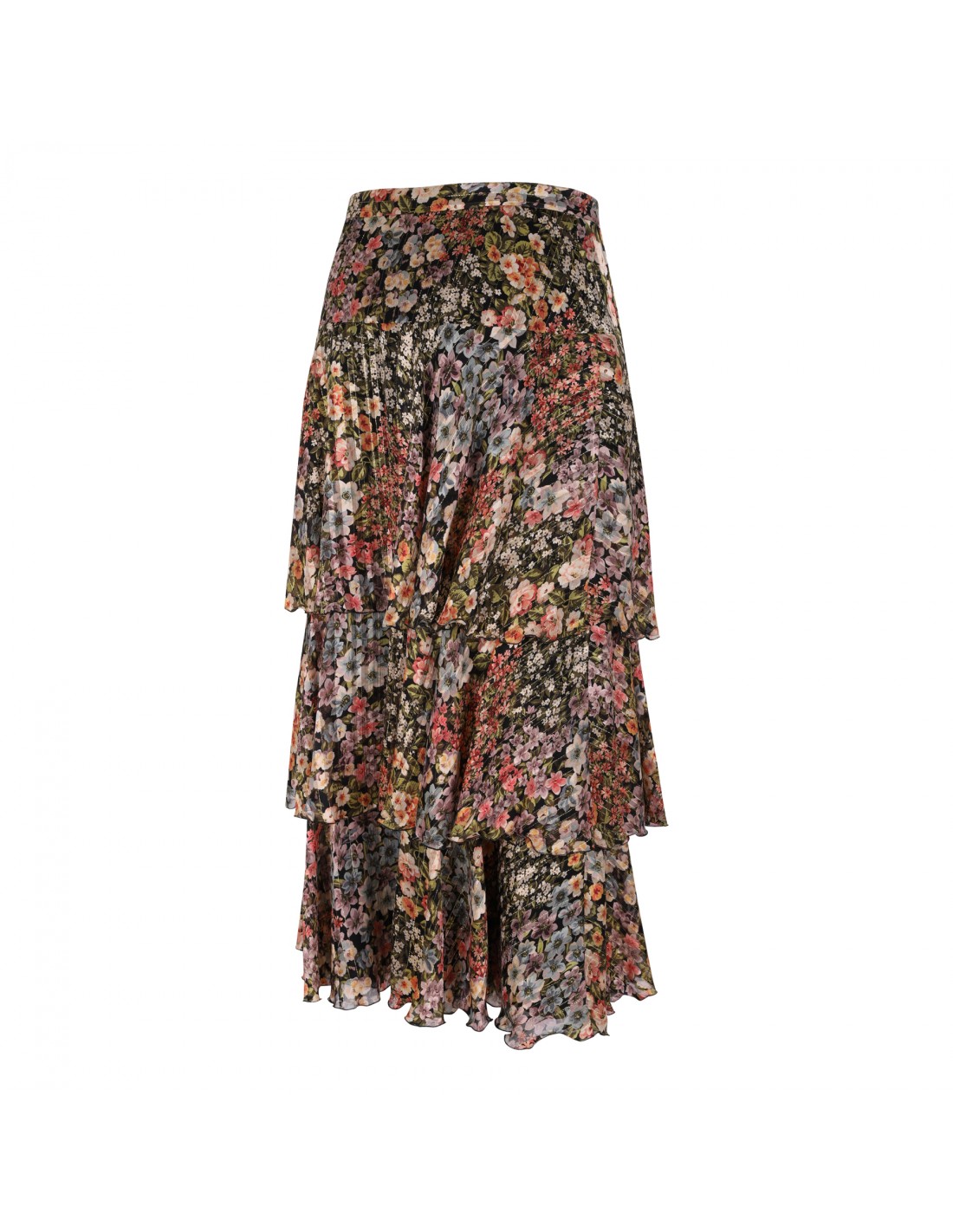 Multicolor silk plissé tiered skirt from Valentino featuring floral motif printed allover, midi length, gold-tone threads, high waist.
