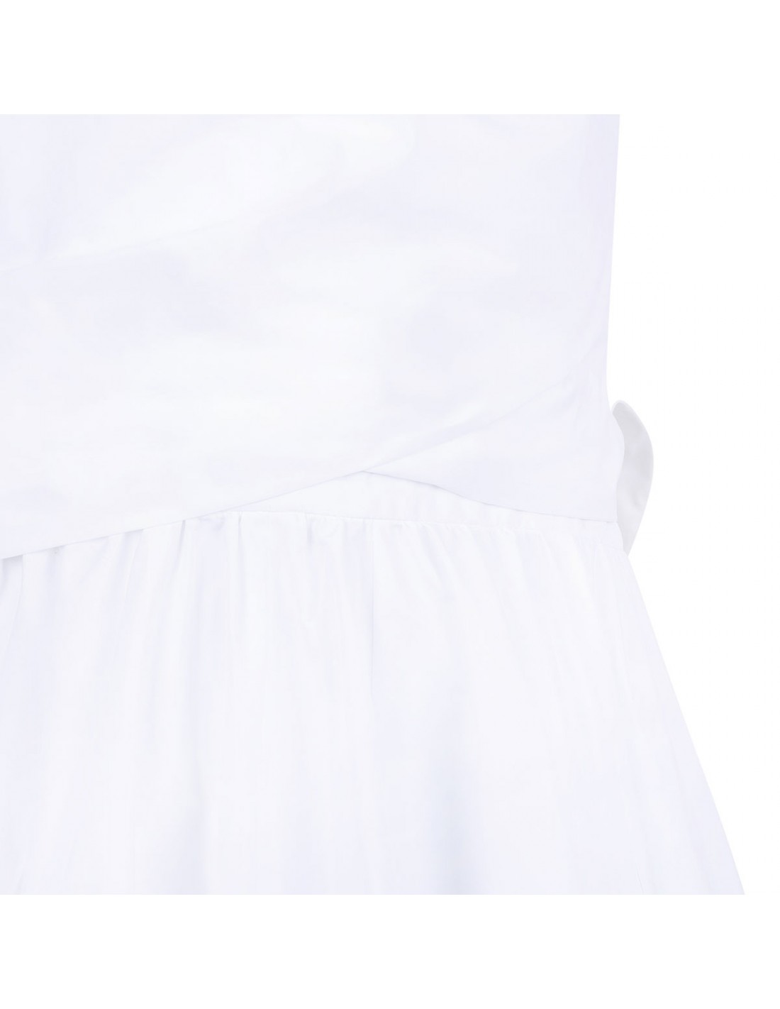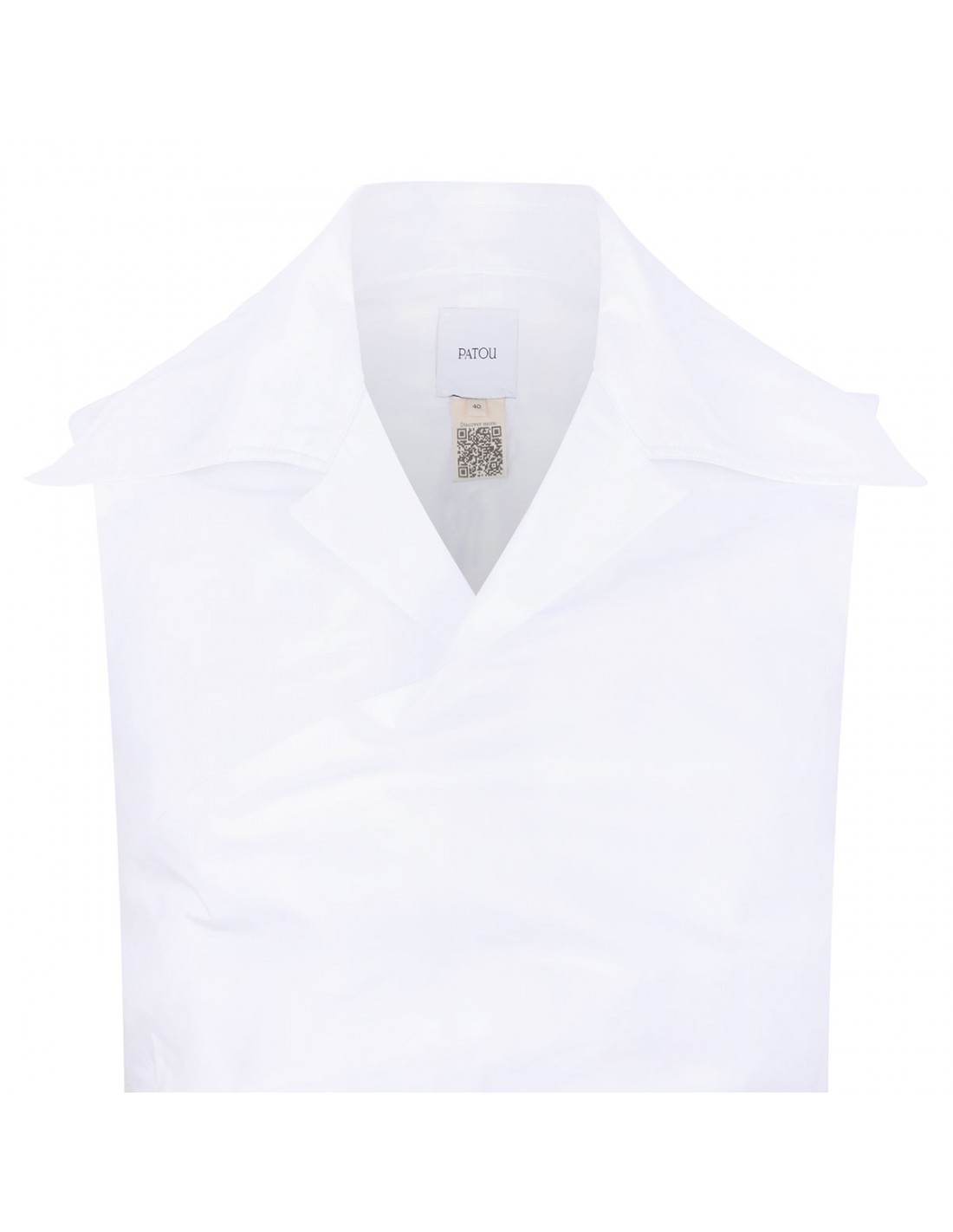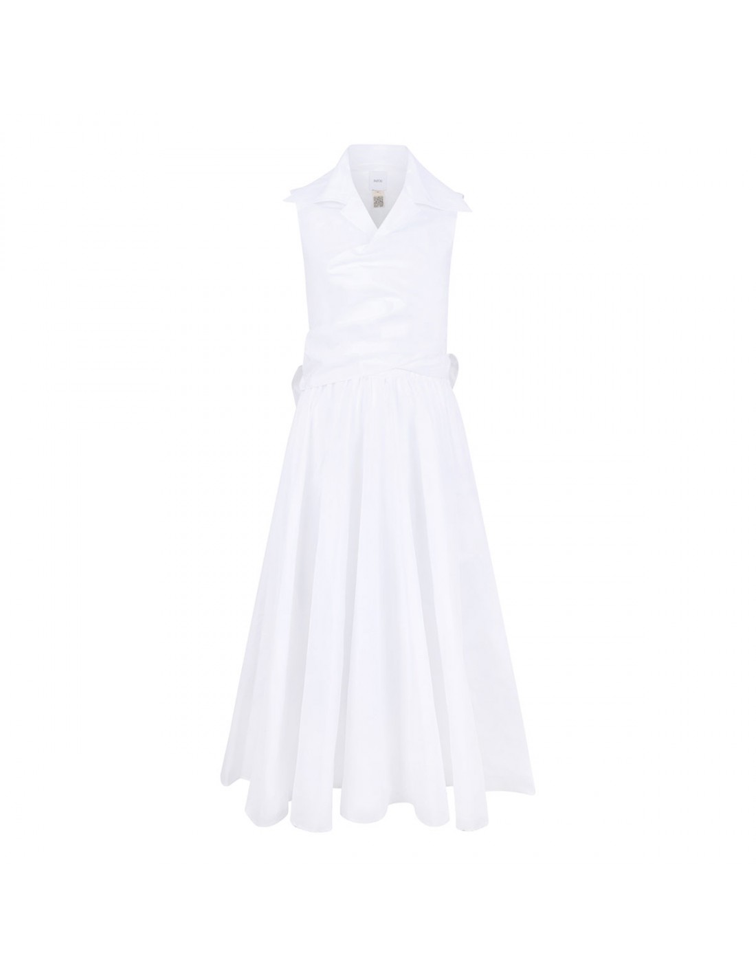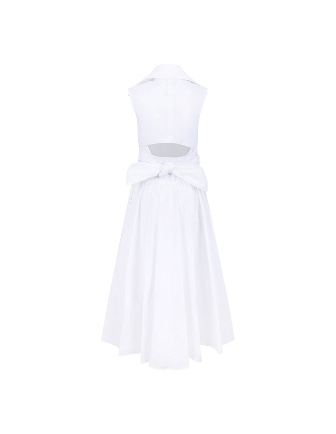 White organic cotton draped midi dress from Patou featuring pointed shirt collar, knot detail at the waist, sleeveless style, cut-out detail at back, flared skirt.