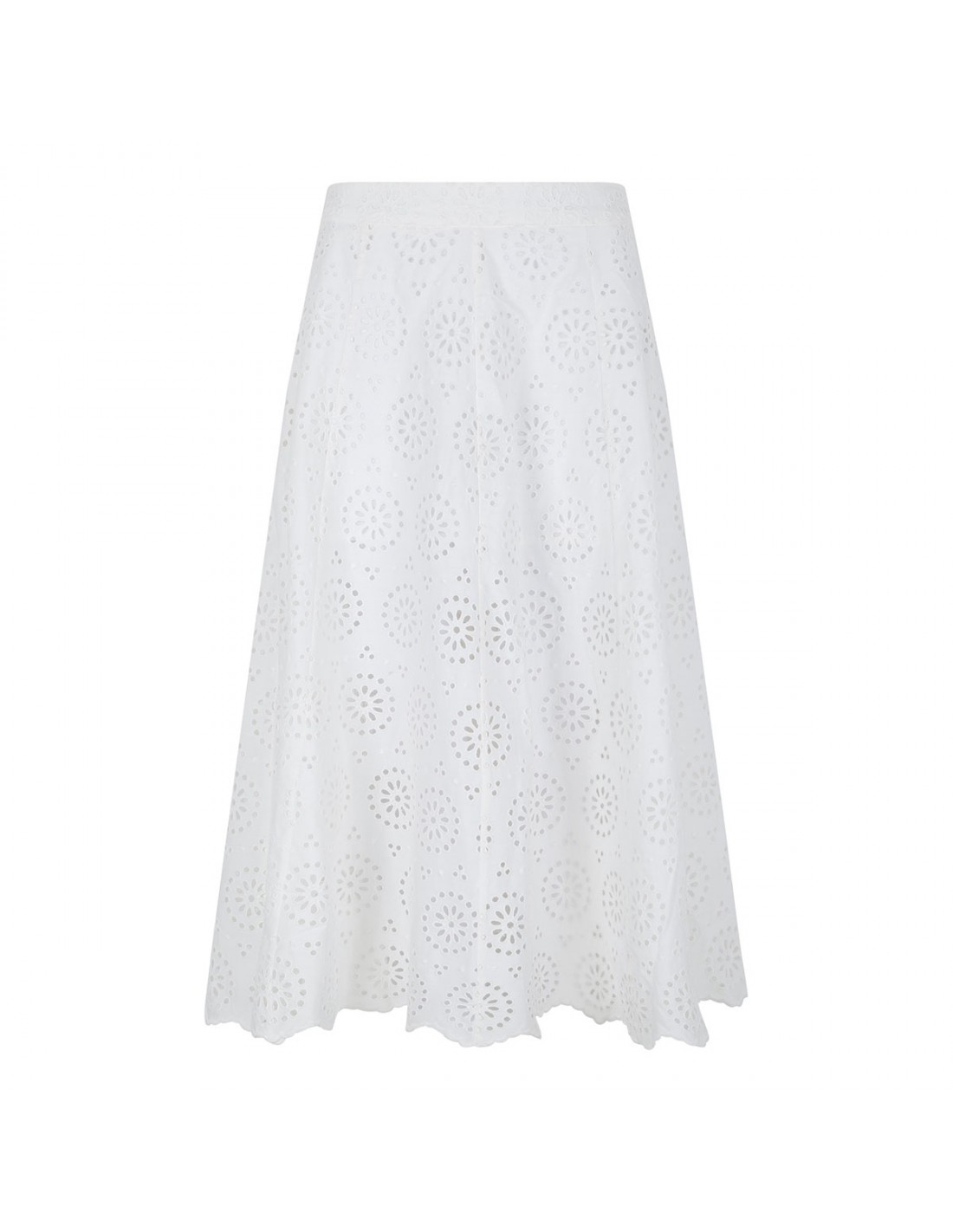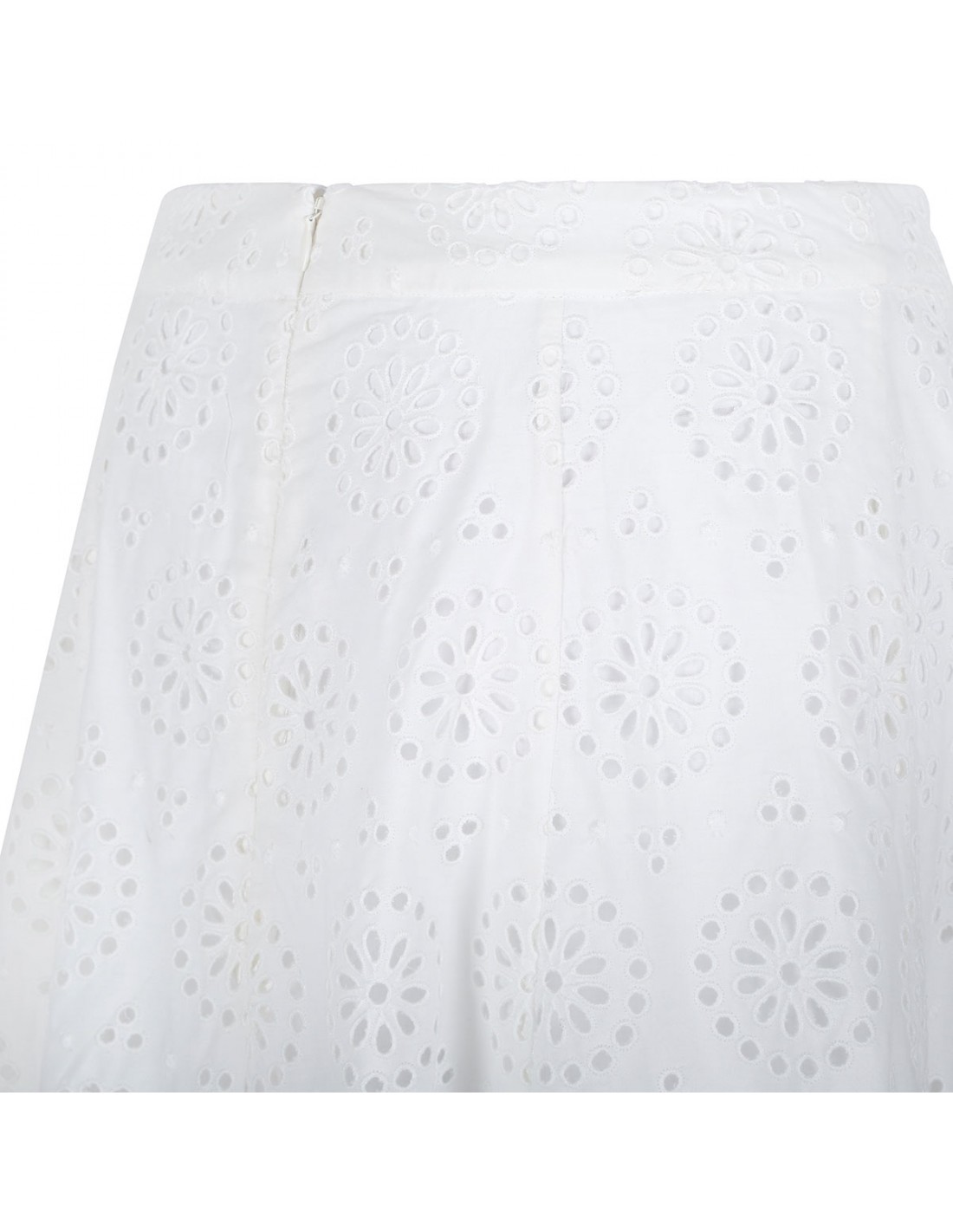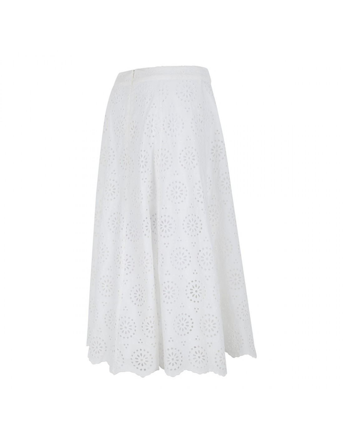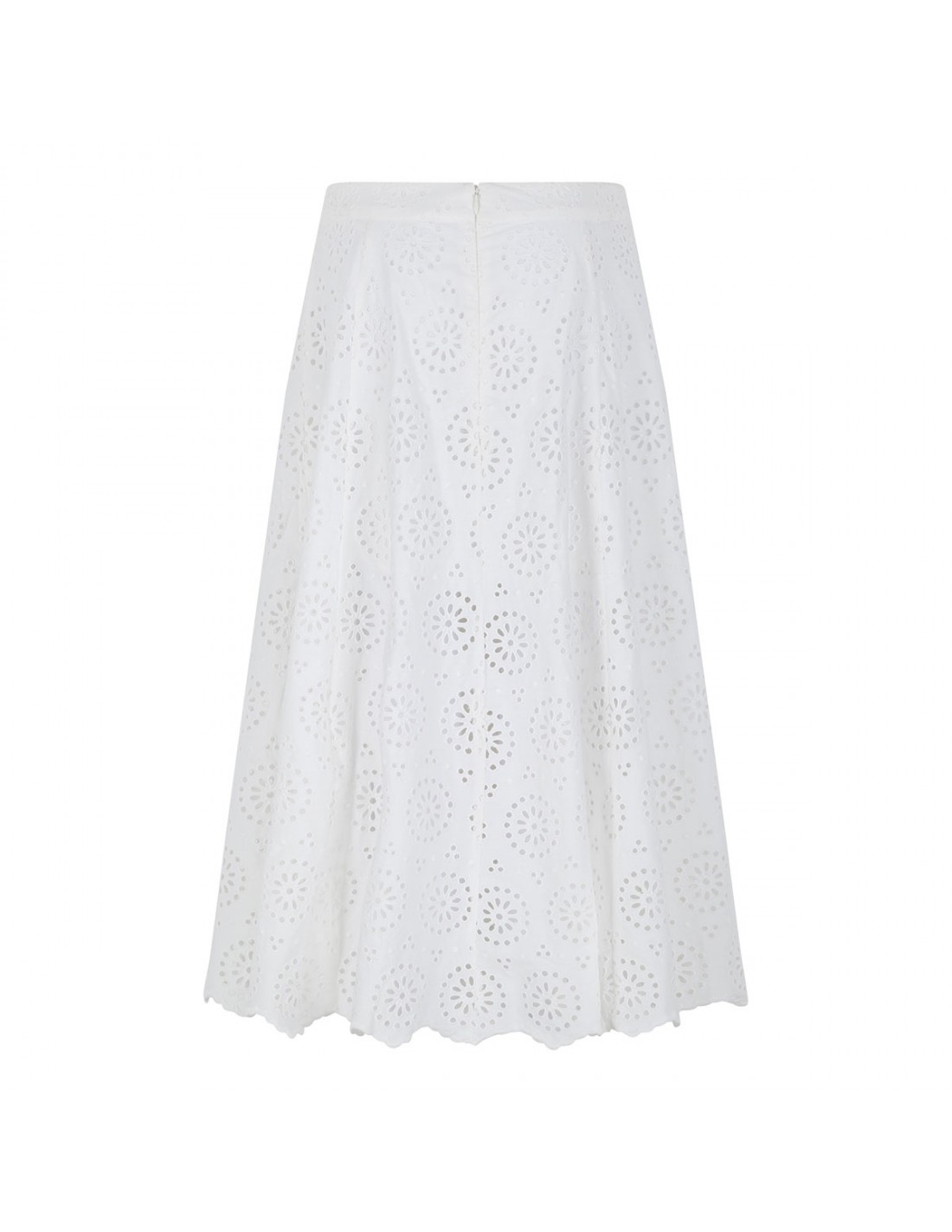 White crisp cotton The Solstice Eyelet skirt from Frame featuring eyelet pattern, clean waistband, flared silhouette, concealed zip fastening at back.