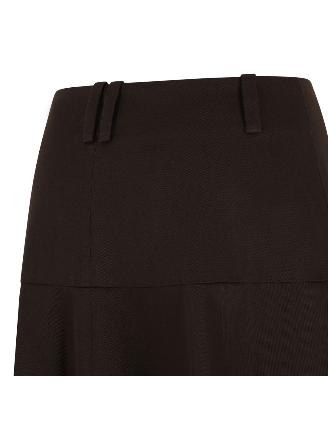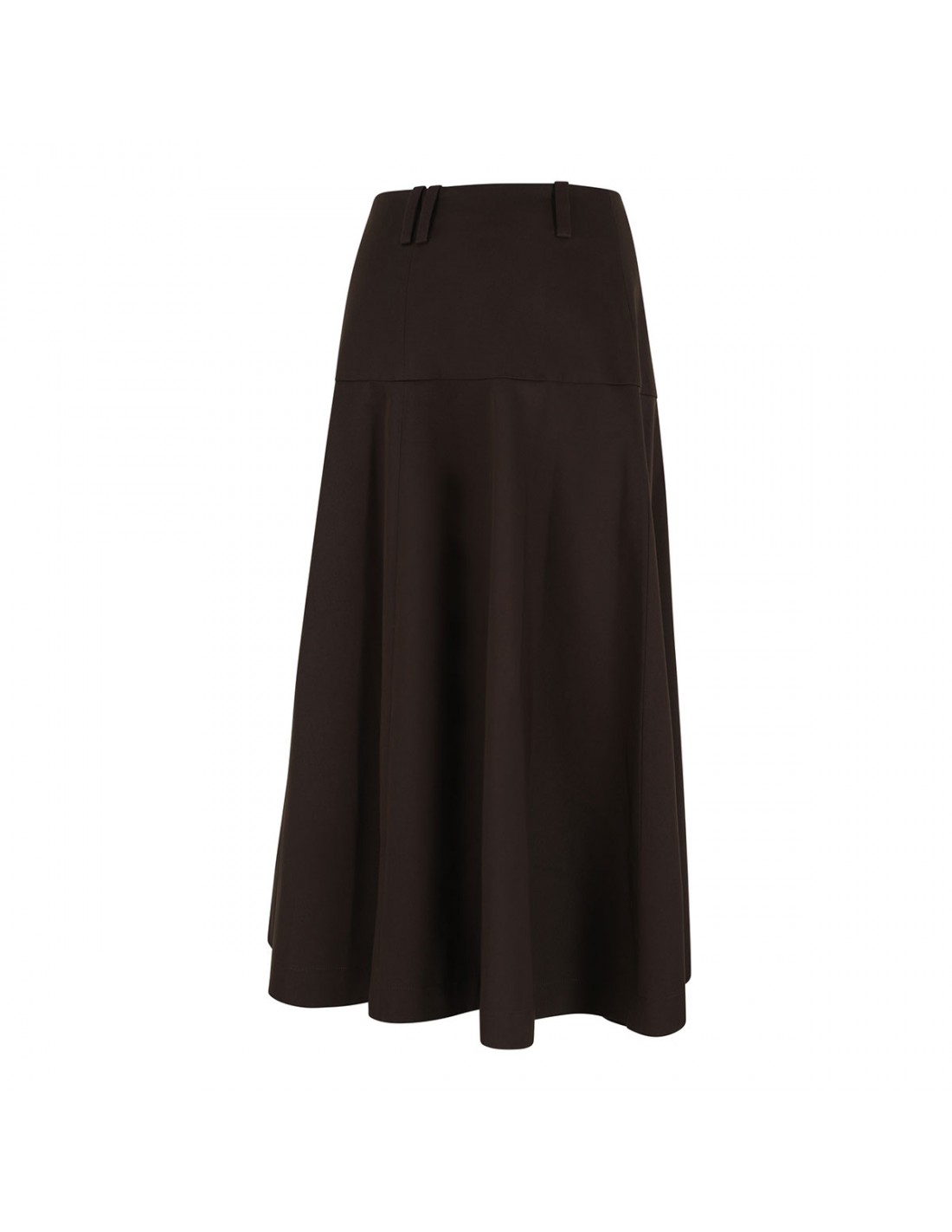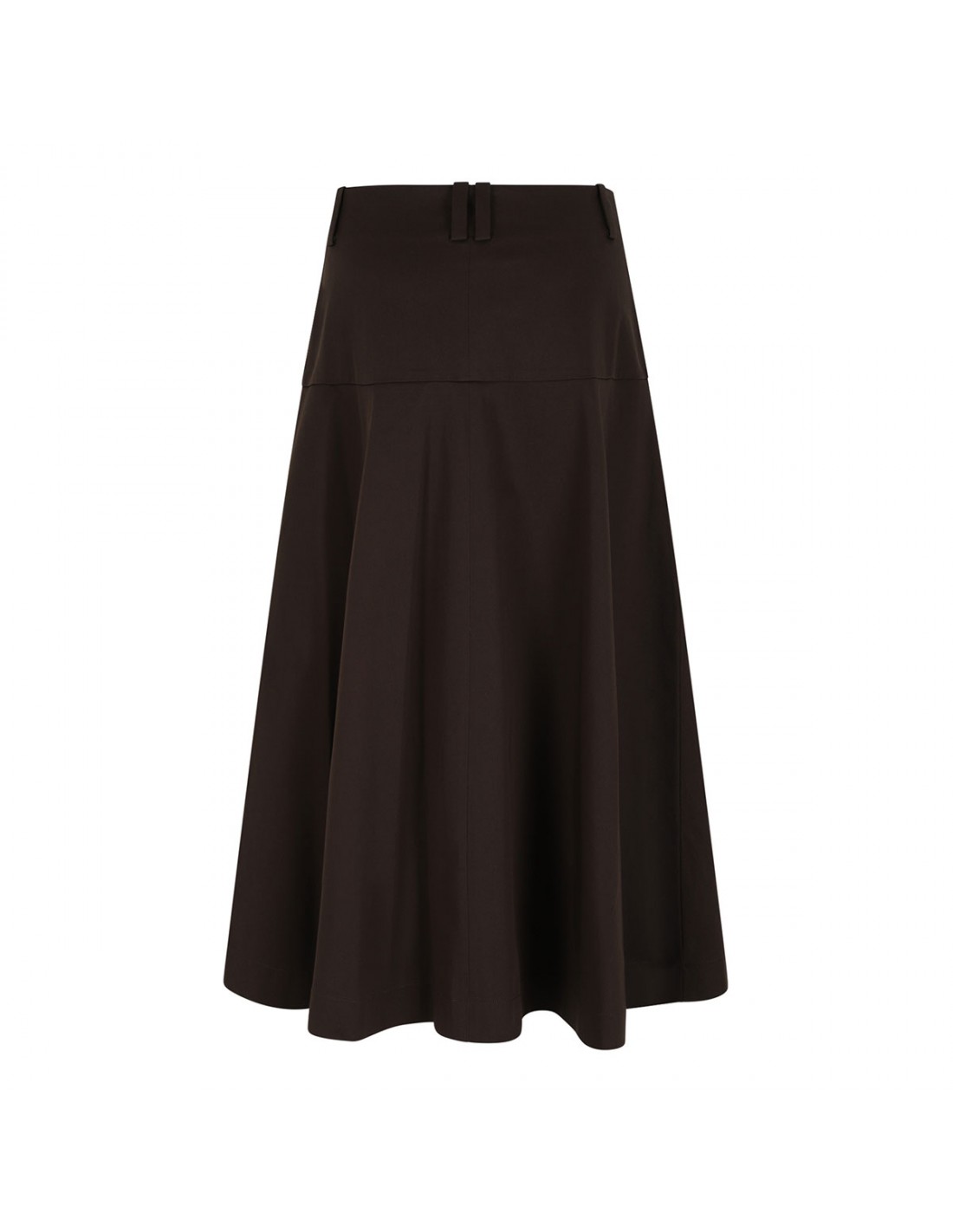 Dark brown stretch cotton twill utility full skirt from Vince featuring mid-calf length, sculpted drape, zip fly and button closure, belt loops on the waistband.