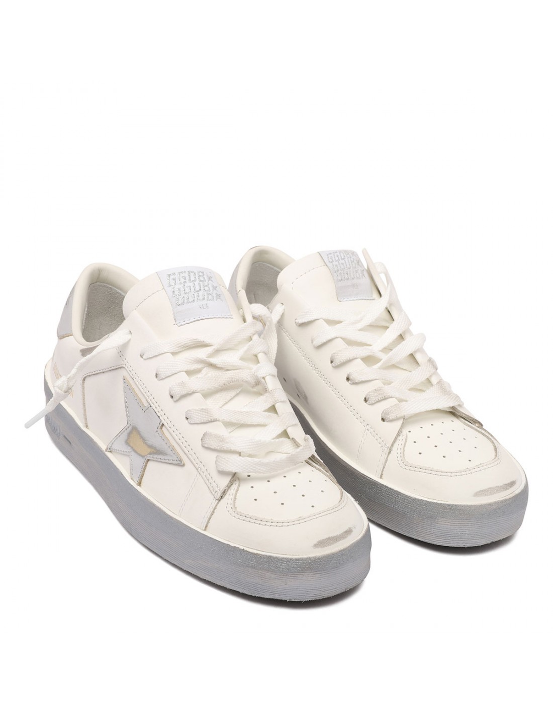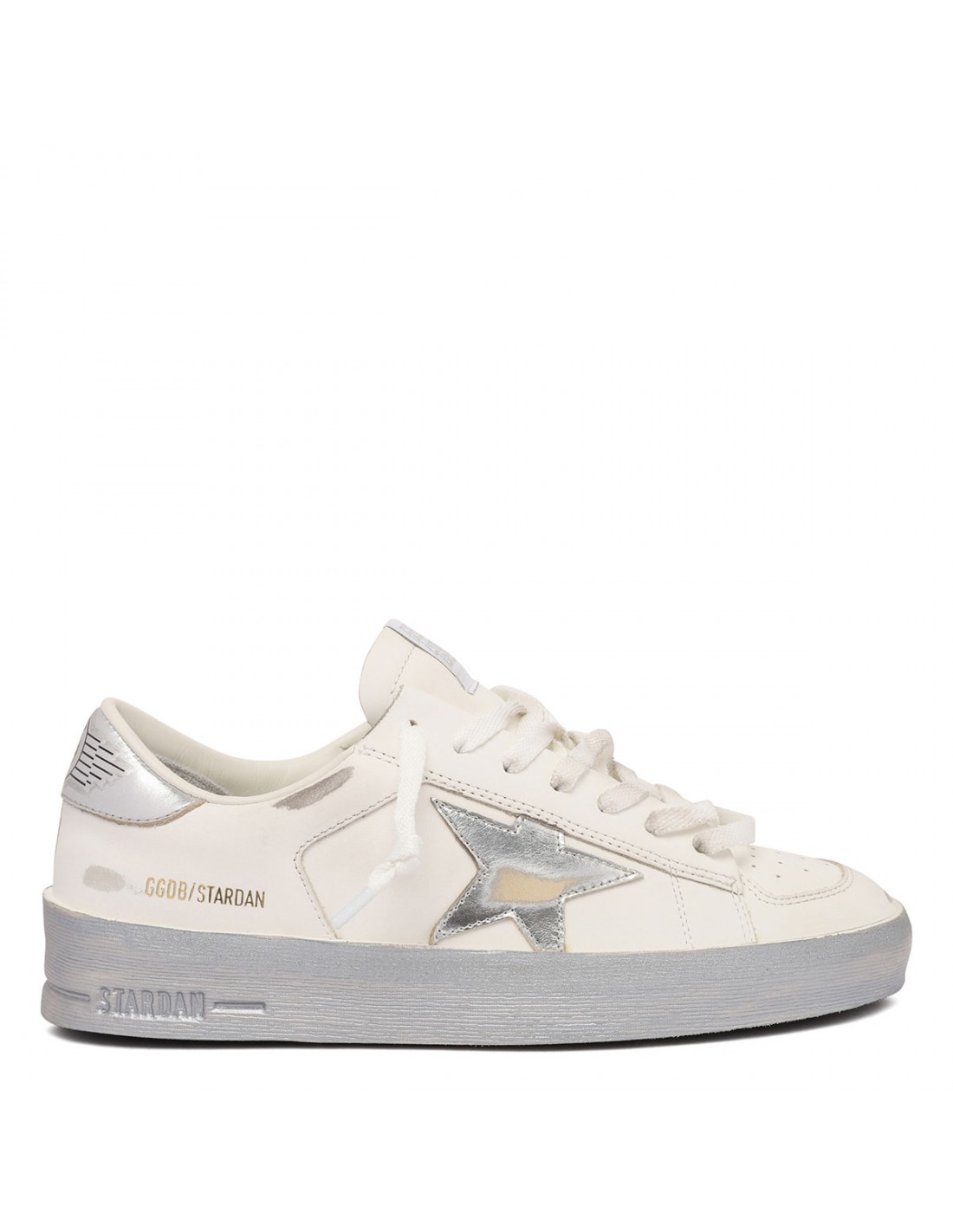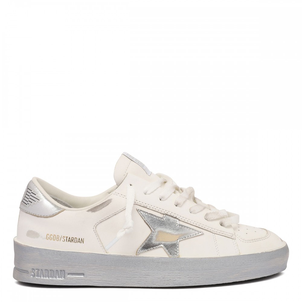 White nappa leather Stardan sneakers from Golden Goose featuring silver mirror-effect star on side, golden logo print on side, silver mirror-effect heel tab with logo, silver mirror-effect asymmetric insert on the back, logo on tongue, cream-white leather inserts
