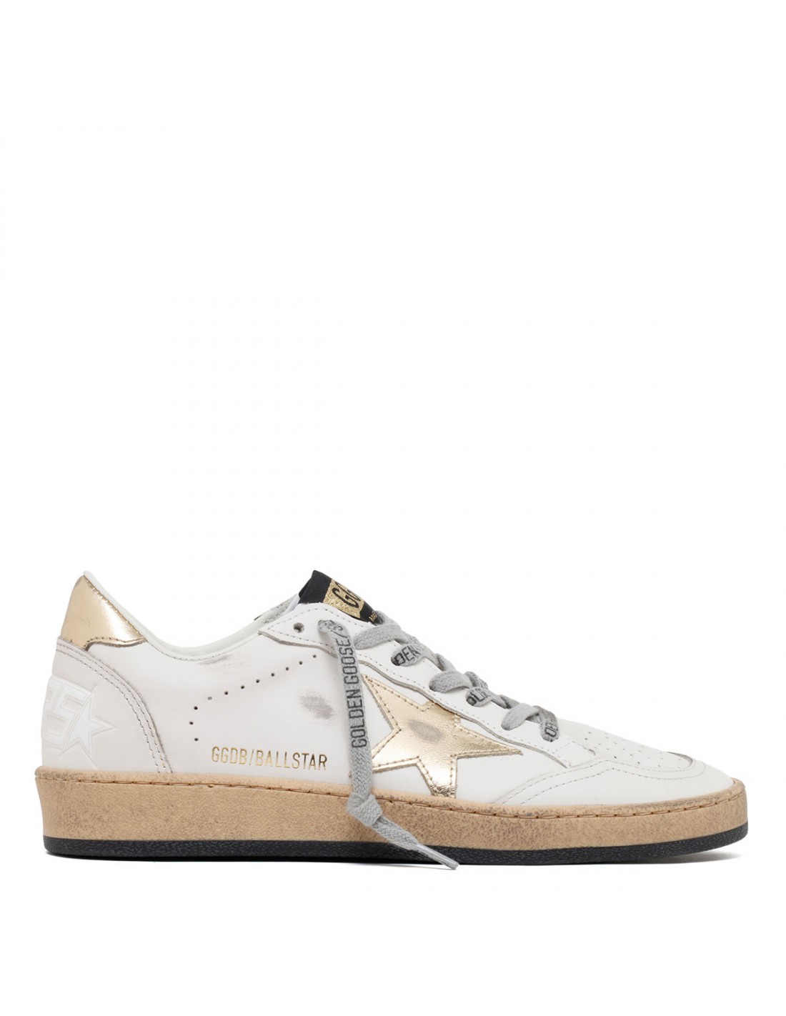 White leather BallStar sneakers from Golden Goose featuring golden metal star on side, vintage treatment, logo print on side, logoed laces, round toe, black and gold logo patch on tongue, sneakers lettering embossed on heel, golden metal heel tab, rubber sole.