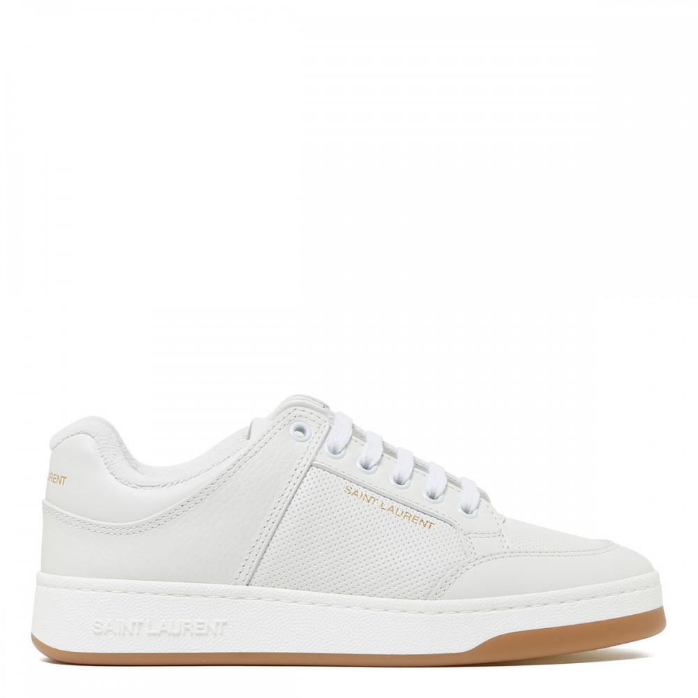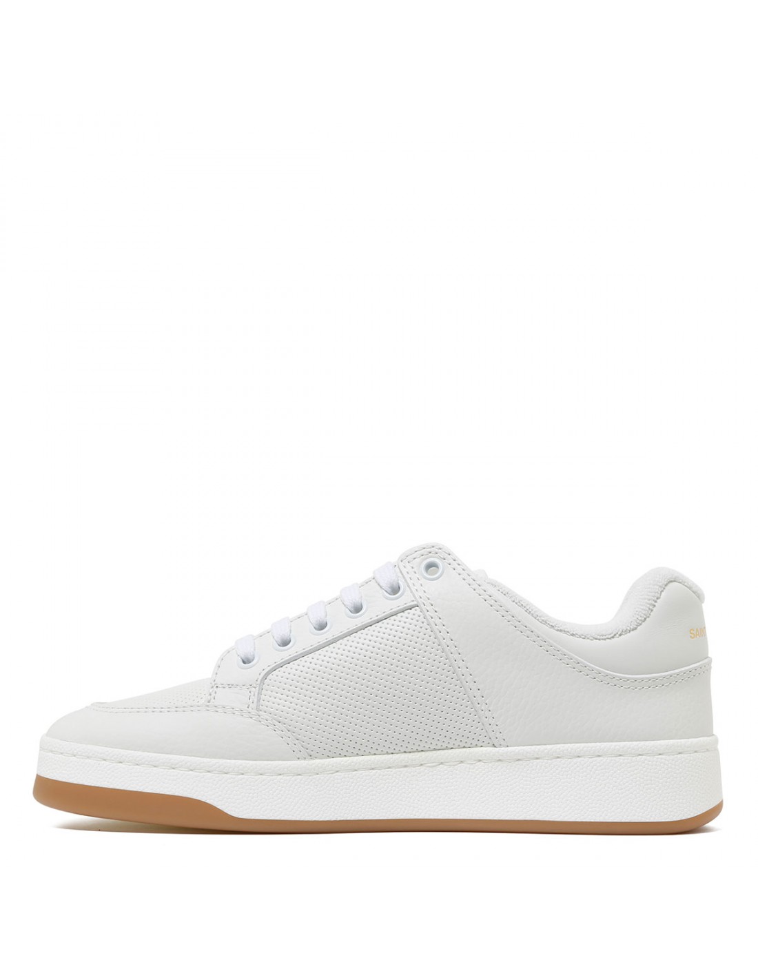 White leather SL/61 sneakers from Saint Laurent featuring perforated leather panels, gold-tone Saint Laurent logo across the pull tab, gold-tone Saint Laurent logo on side, rounded toe, padded collar, lace-up fastening, rubber sole.