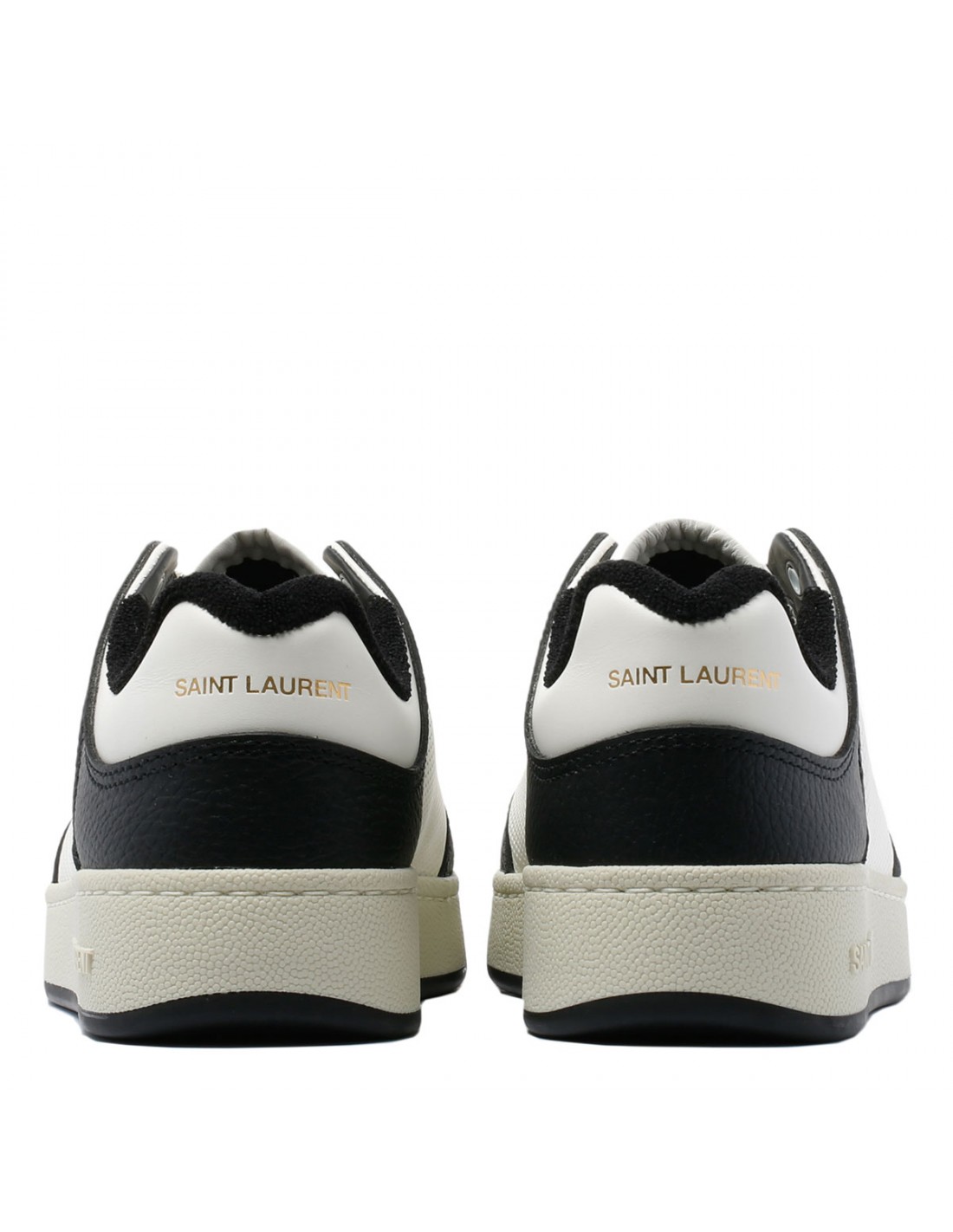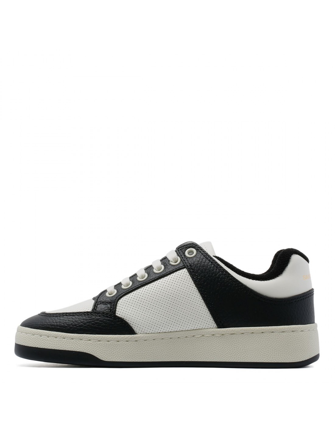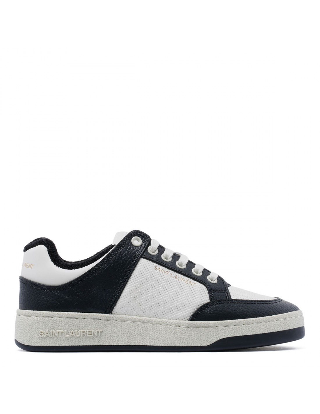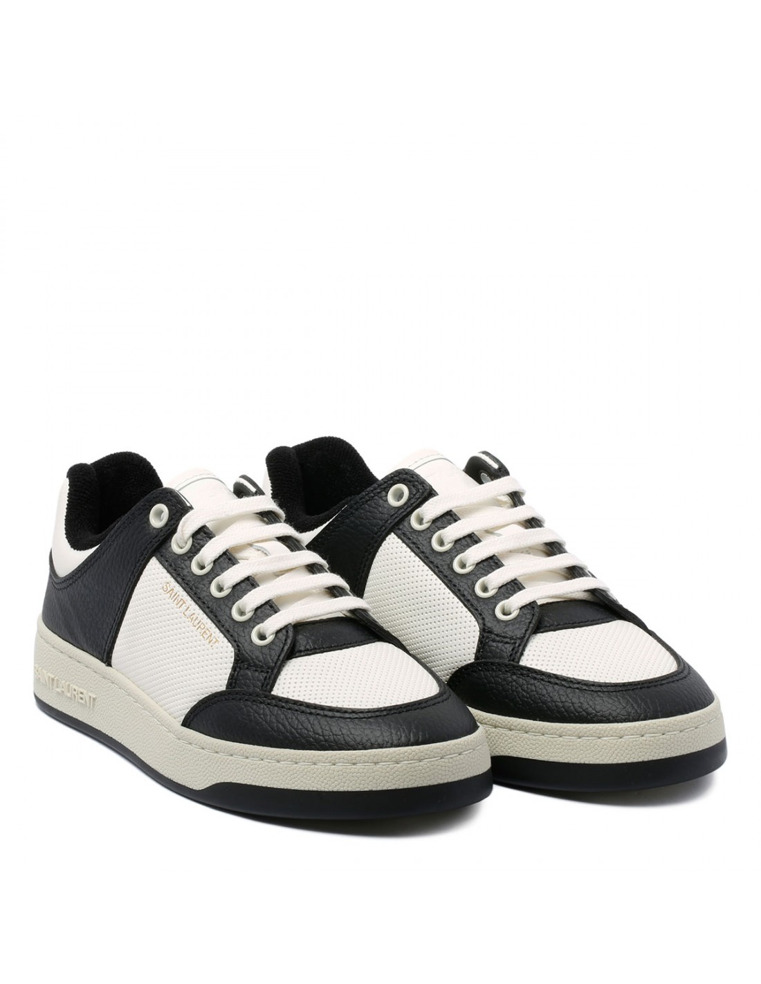 White and black leather SL/61 sneakers from Saint Laurent featuring perforated leather panels, gold-tone Saint Laurent logo across the pull tab, gold-tone Saint Laurent logo on side, rounded toe, padded collar, lace-up fastening, rubber sole.
