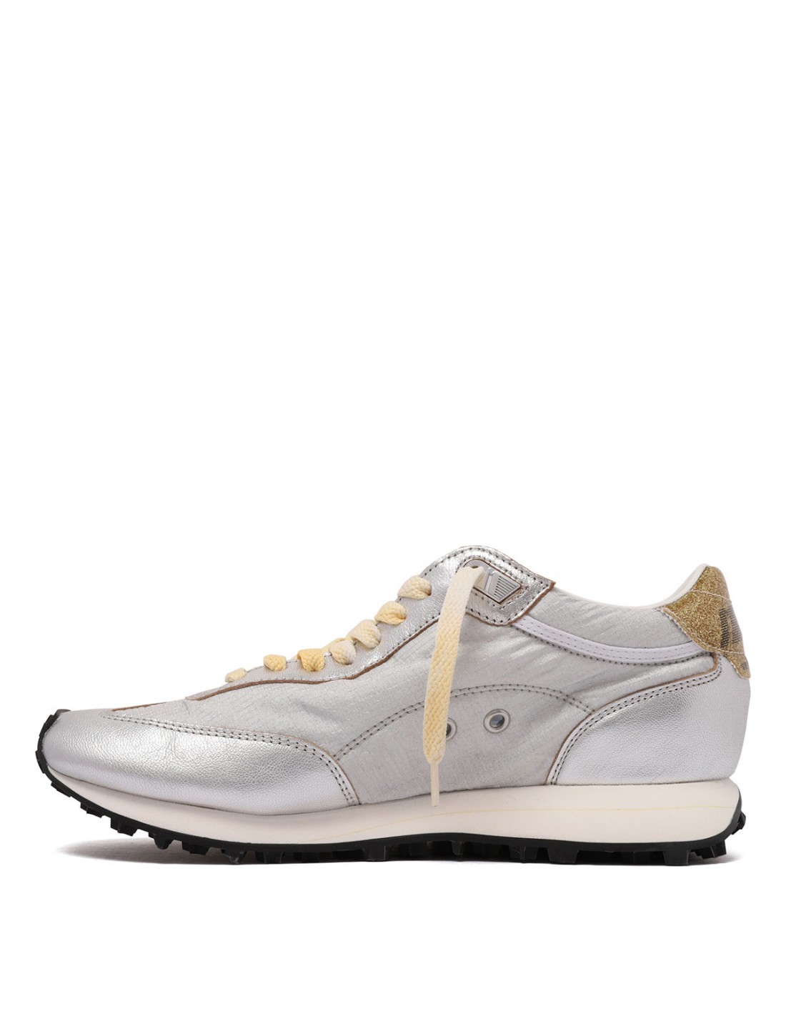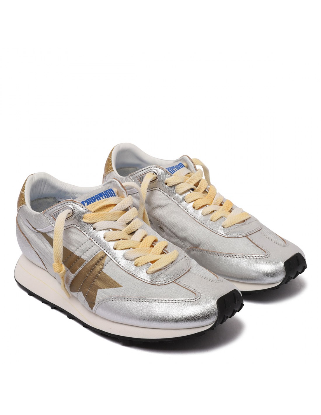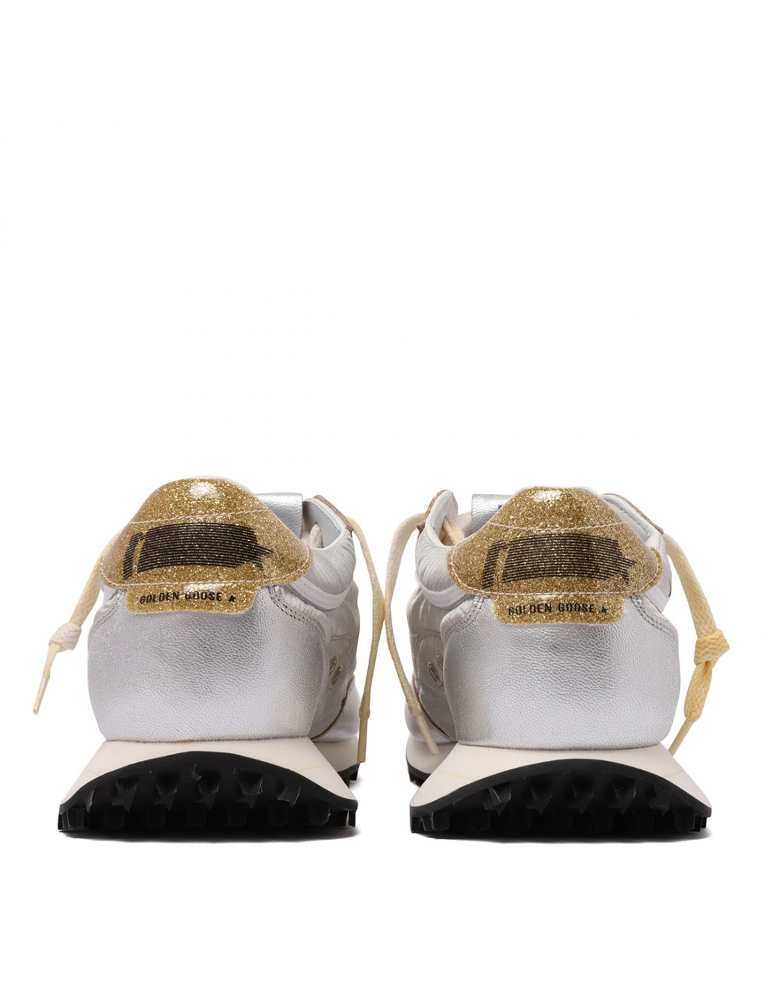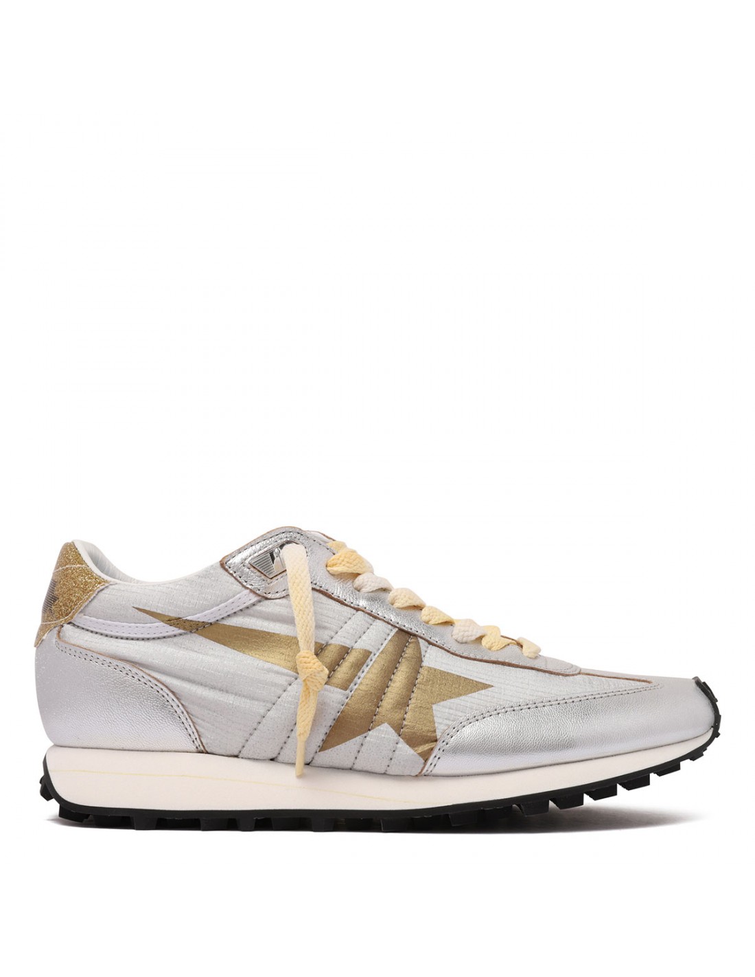 Silver ripstop nylon Marathon sneakers from Golden Goose featuring signature gold star on side, glazed gold glitter heel tab with logo, metallic silver nappa leather toe, logo tag on tongue, jacquard laces closure, round toe, rubber sole.