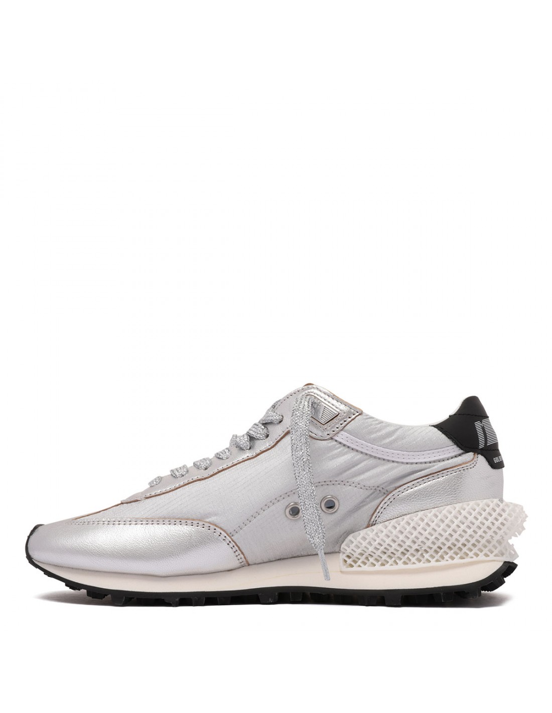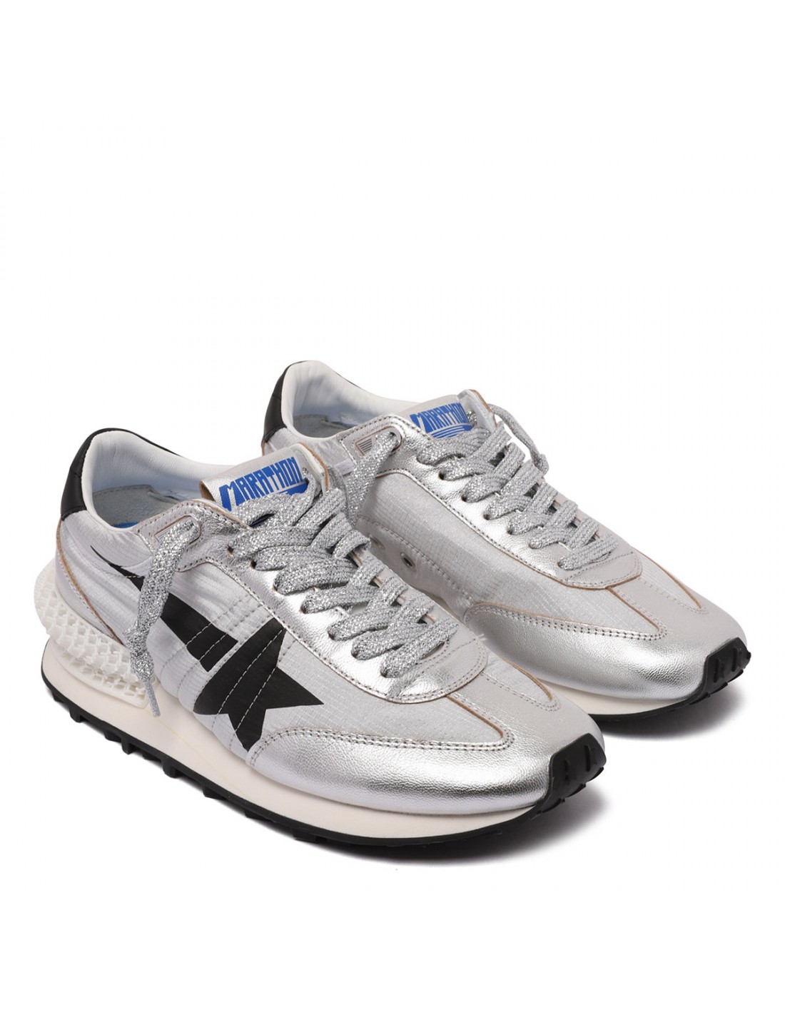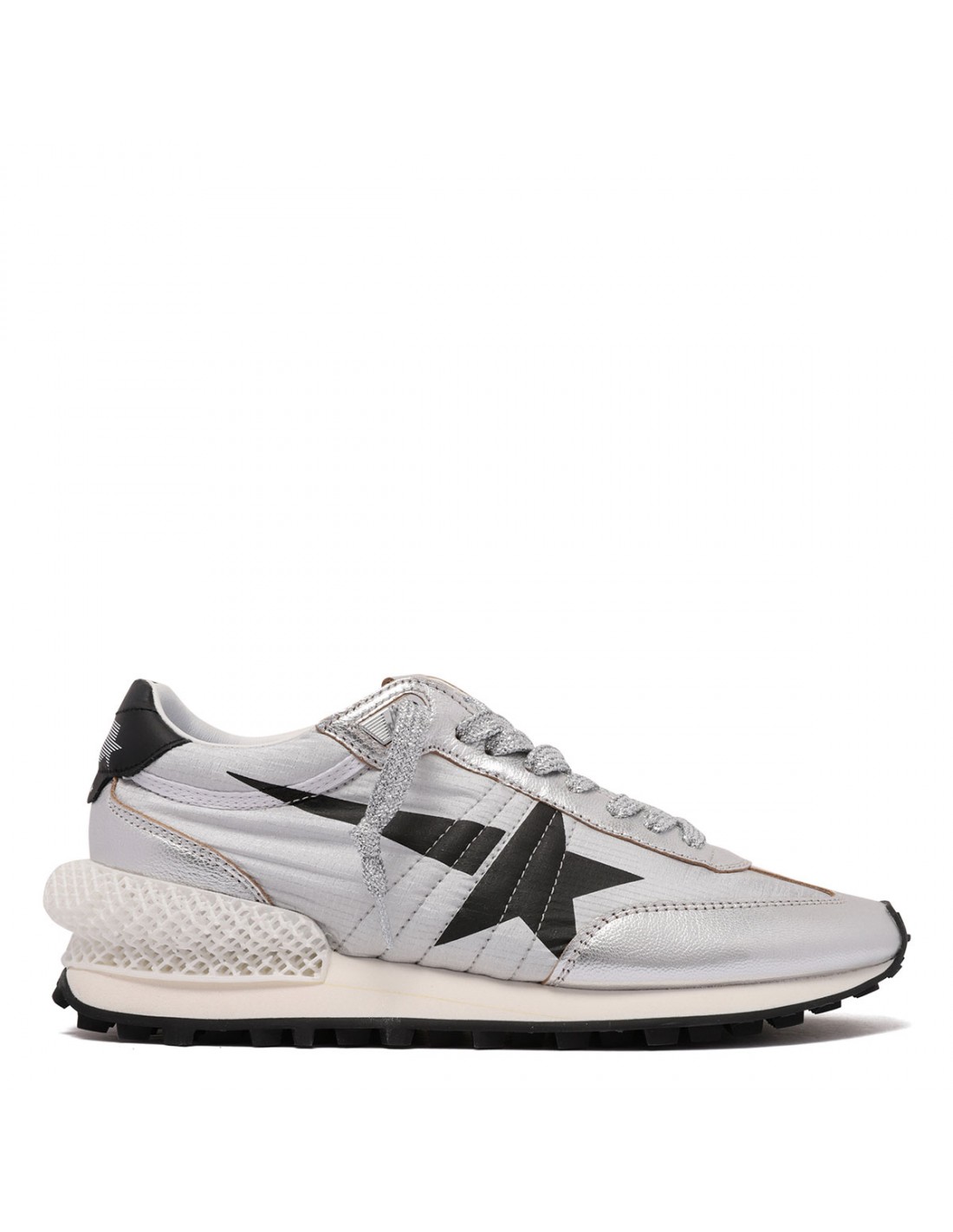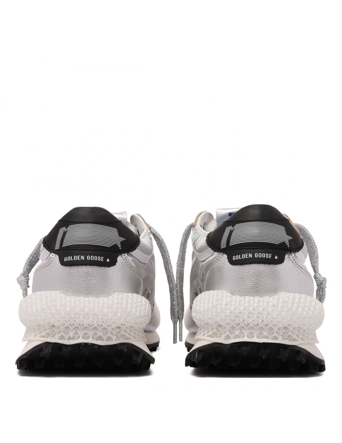 Silver ripstop nylon Marathon sneakers from Golden Goose featuring signature black star on side, metallic black nappa leather heel tab, metallic silver nappa leather toe, silver lurex lace closure, 3D printed extra cushioning stabilizer, logo tag on tongue, round toe, rubber sole.