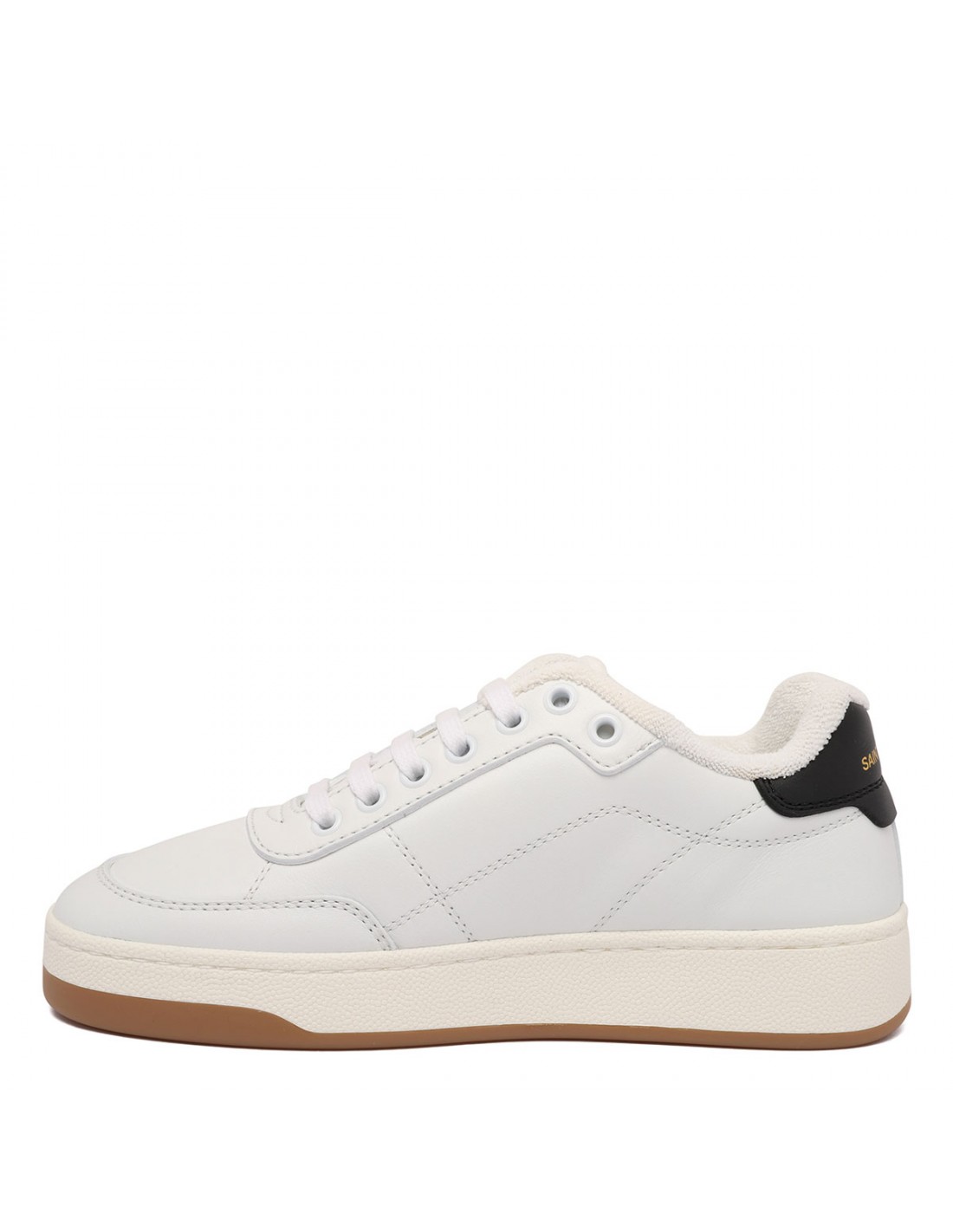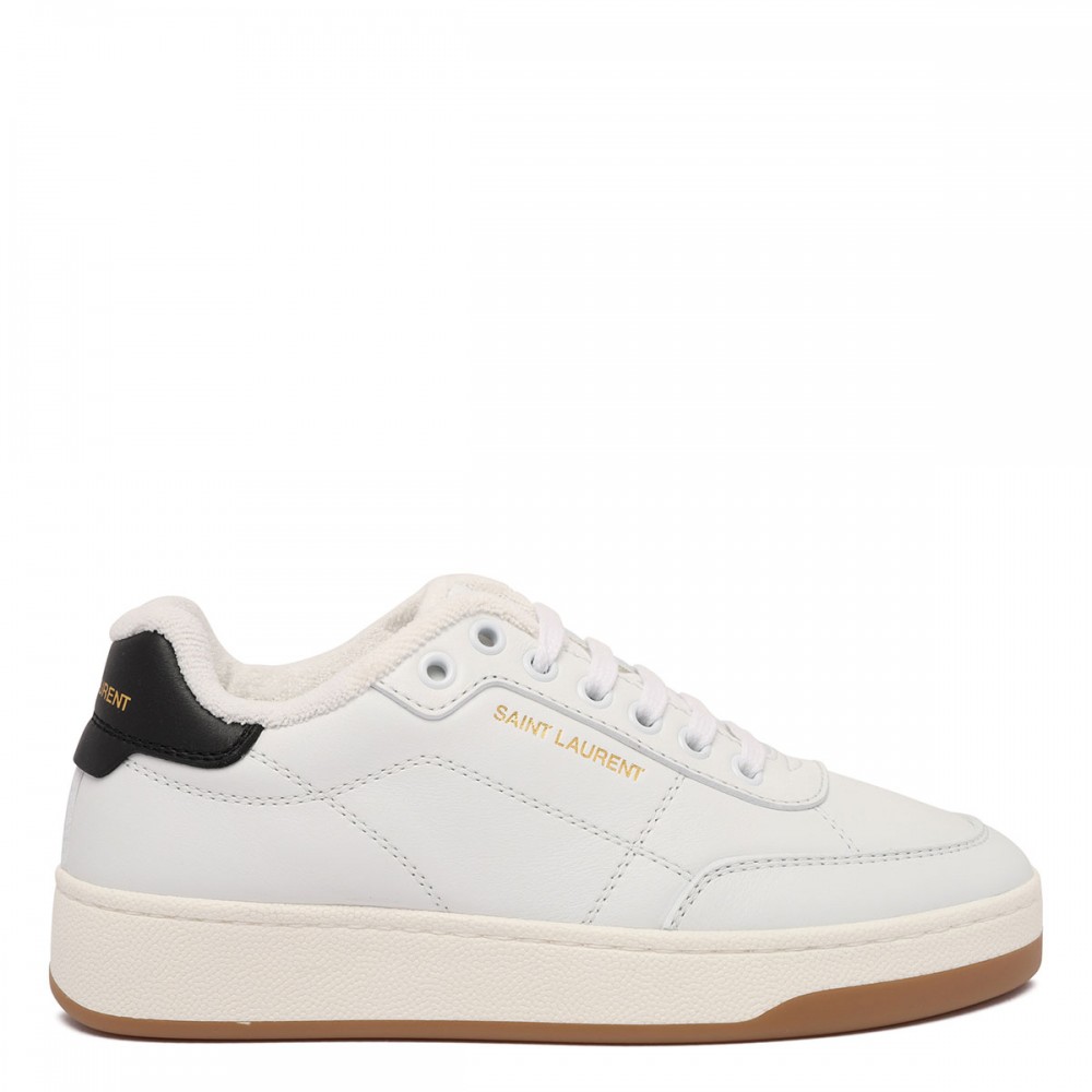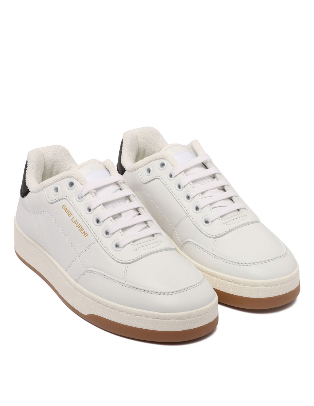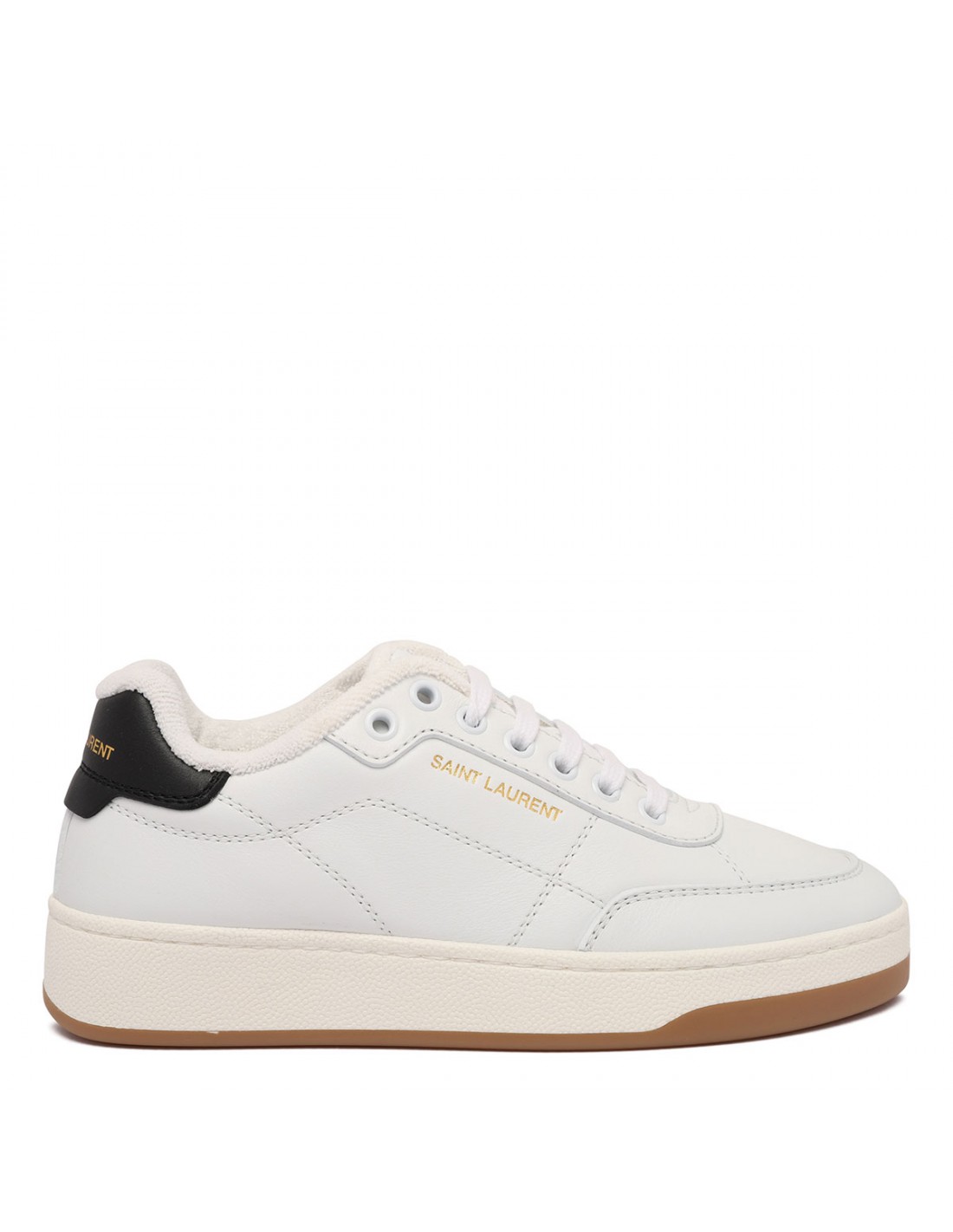 White smooth leather SL/61 low-top sneakers from Saint Laurent featuring gold-tone Saint Laurent signature on side and back heel counter, round toe, laces closure, logo patch on the tongue, rubber sole.