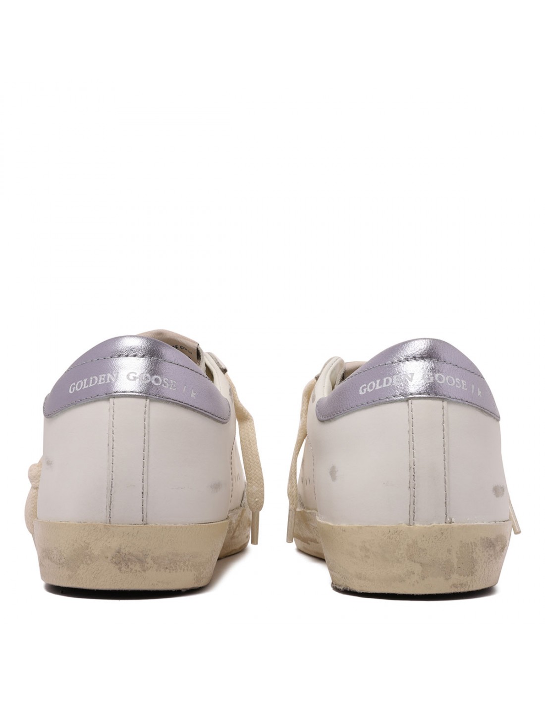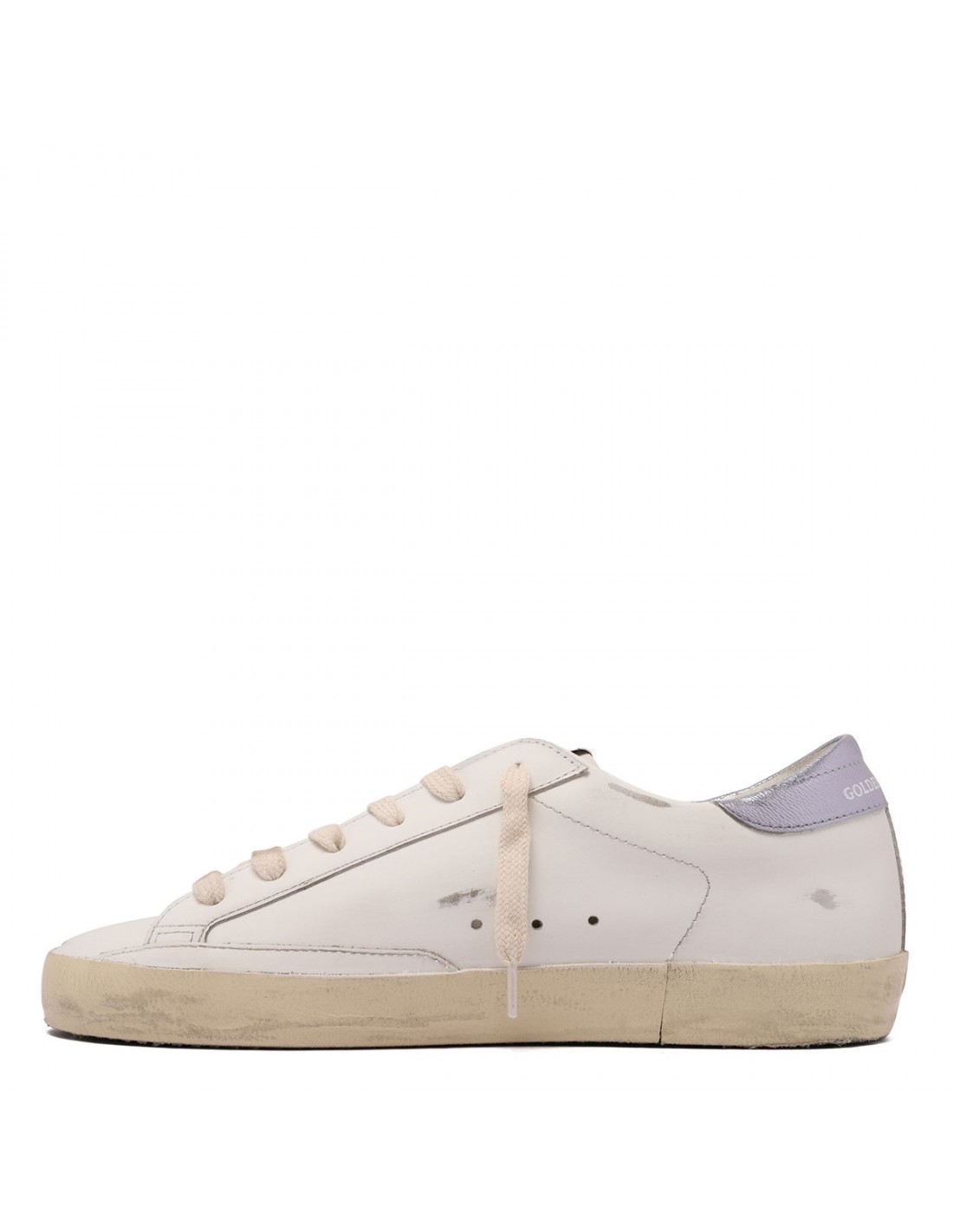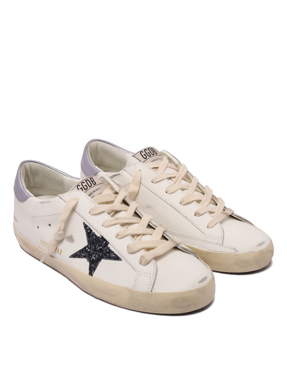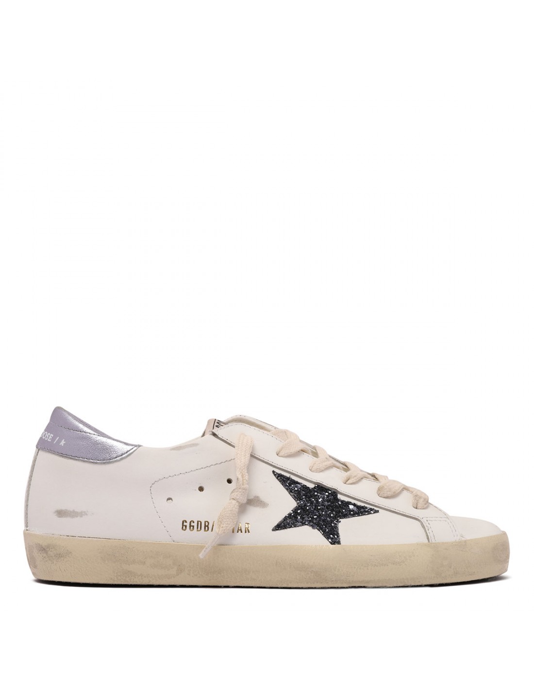 White leather SuperStar sneakers from Golden Goose featuring black glittery star, laminated wisteria hue leather heel tab, logo on tongue, Vintage finishing, round toe, logo print on side, lace-up fastening, rubber sole.