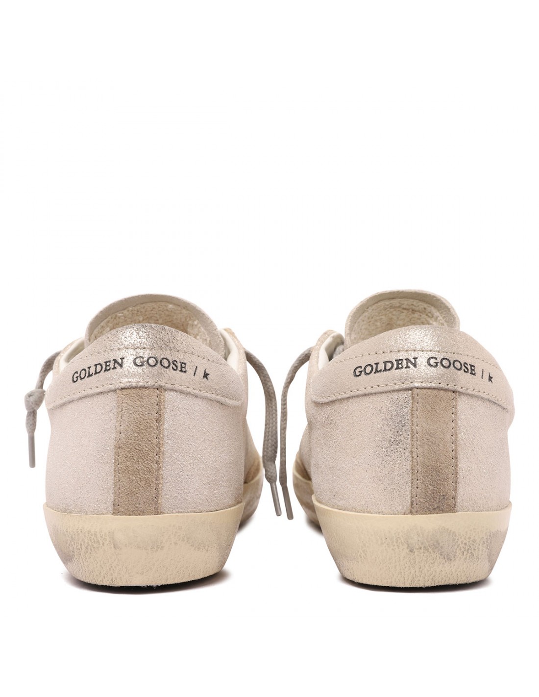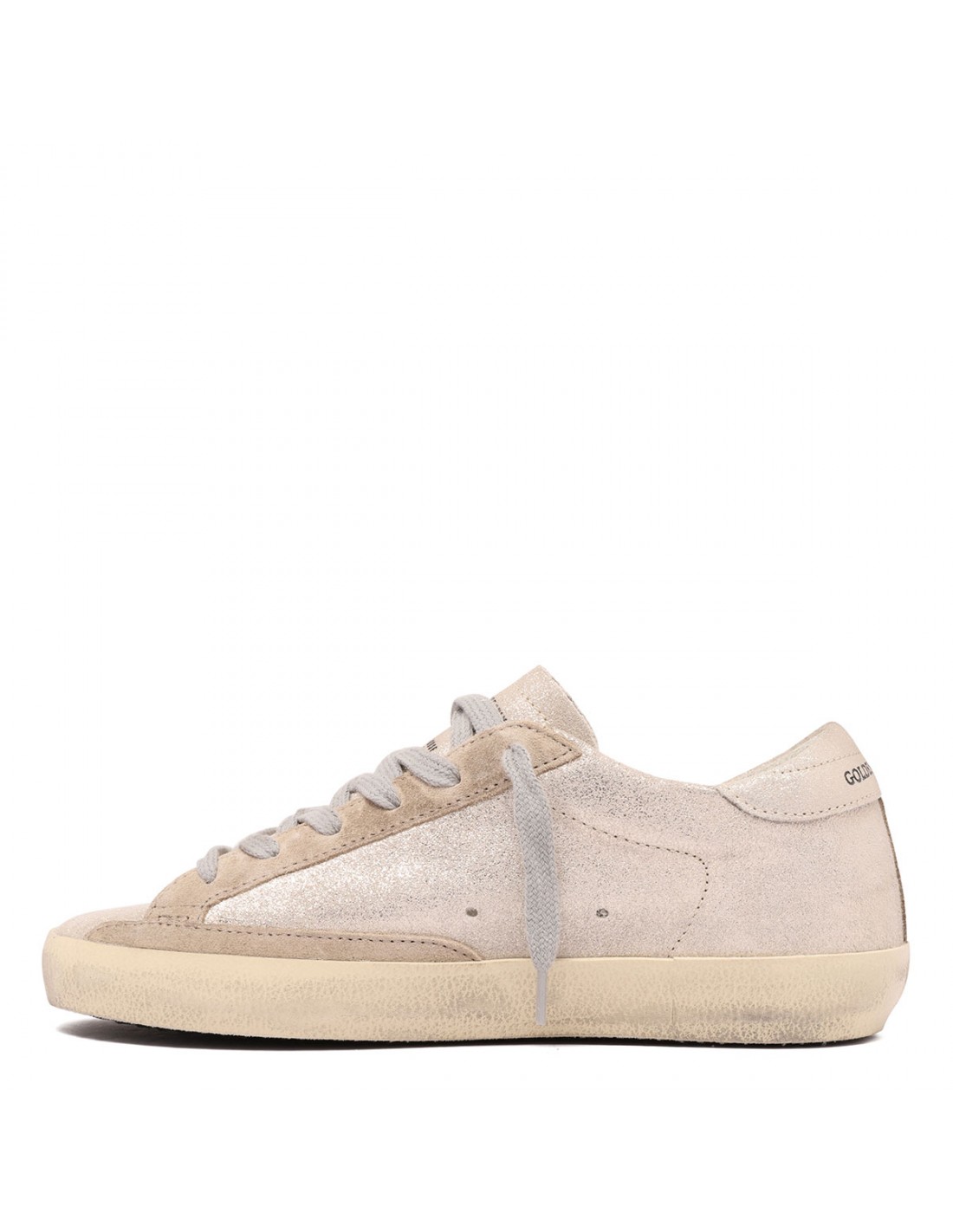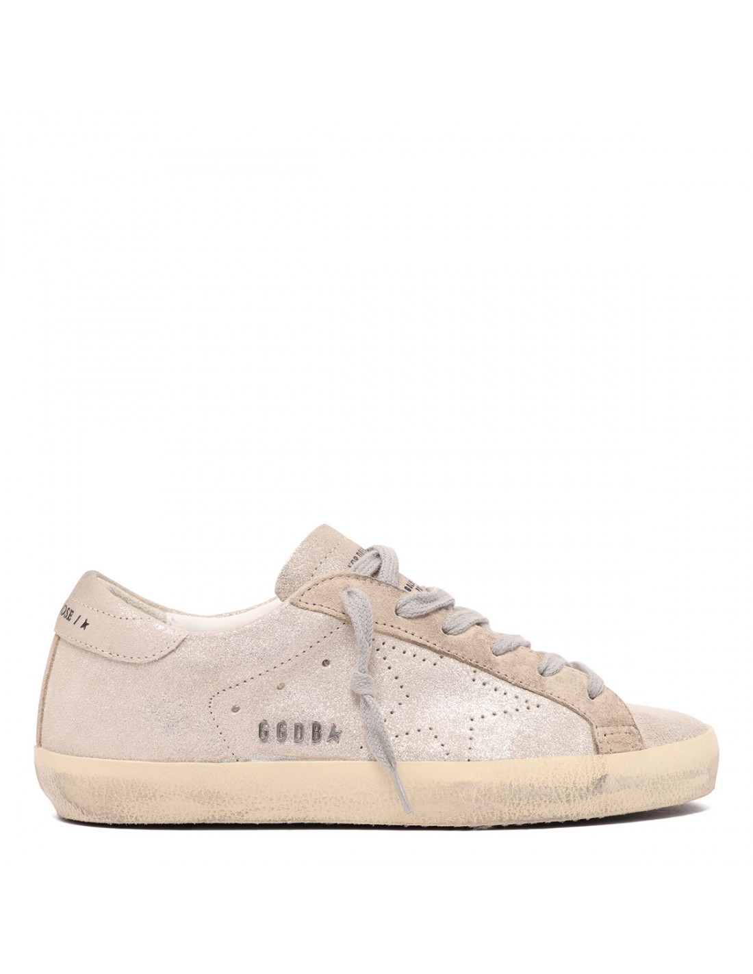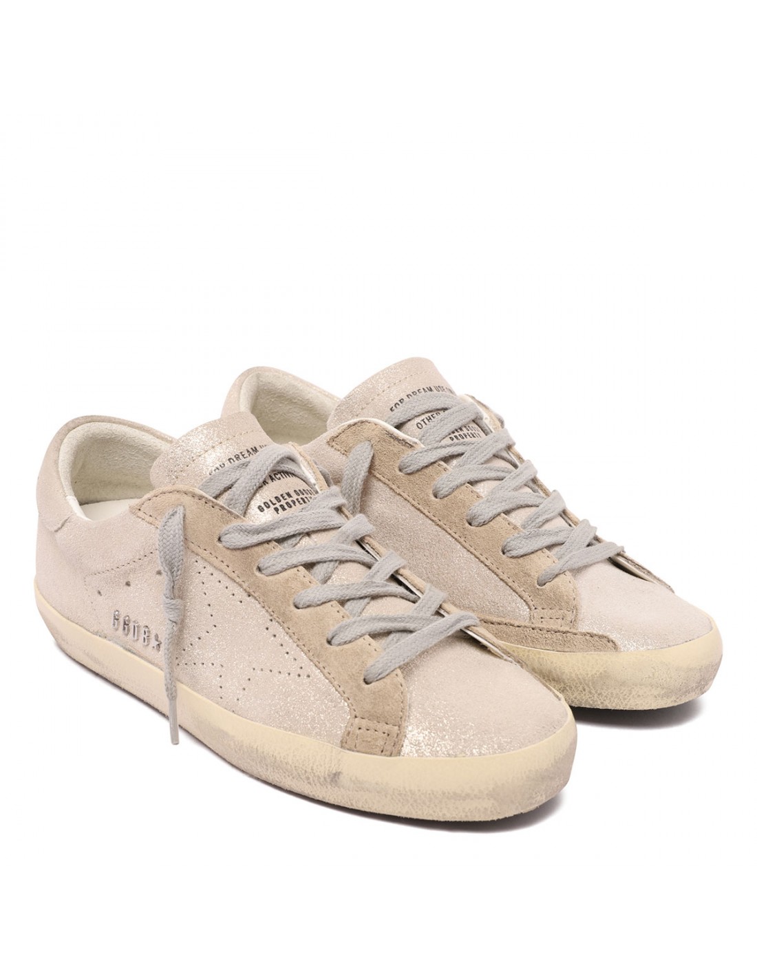 Beige glittery suede SuperStar sneakers from Golden Goose featuring platinum heel tab with logo, perforated star at side, round toe, lace-up closure, lettering logo plaque on side, tag on tongue, vintage finishing, rubber sole.