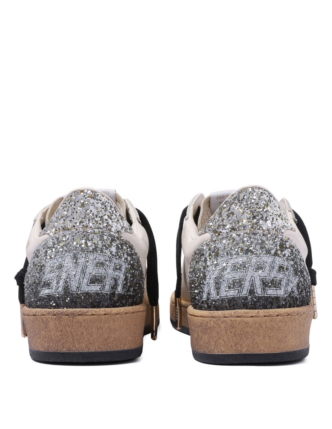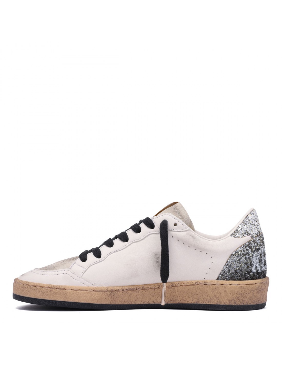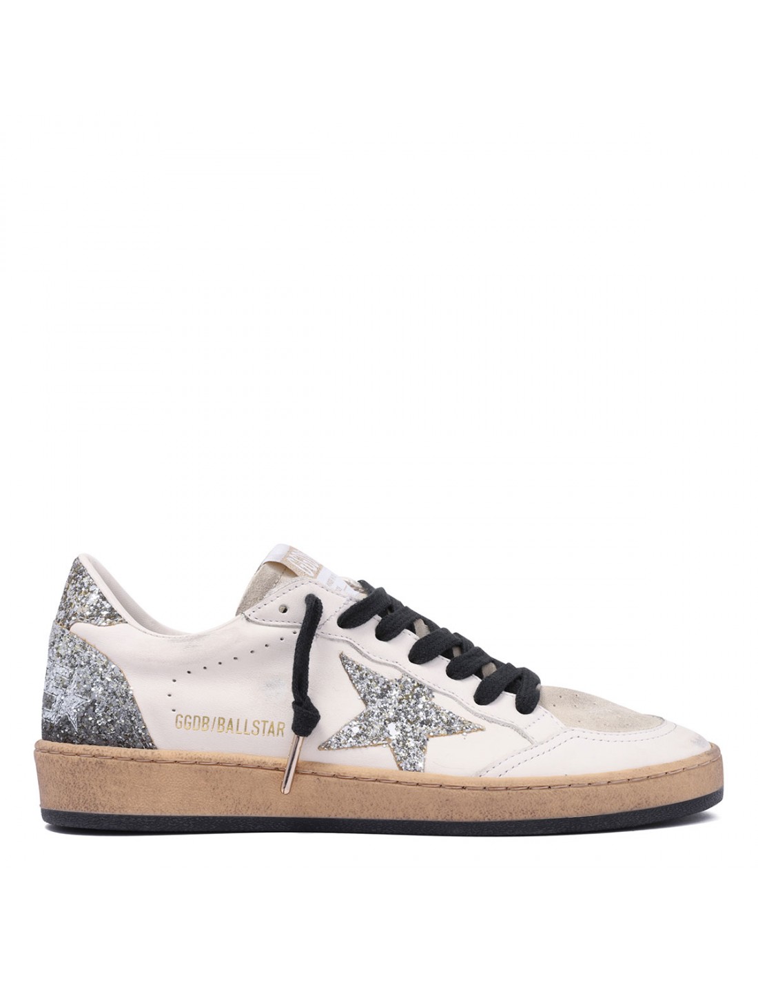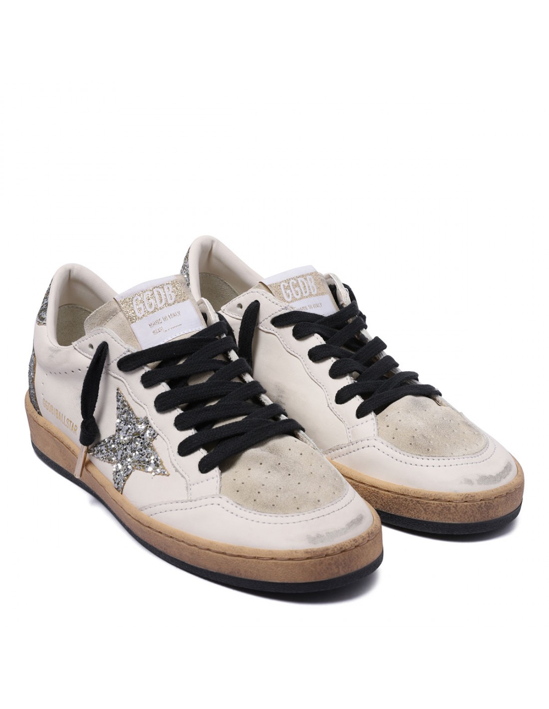 White leather BallStar sneakers from Golden Goose featuring glittery heel with degradé effect, platinum glittery star on side, suede tongue with logo tag, black laces, round toe, perforated toecap, logo on side, padded collar, vintage finish, rubber sole.