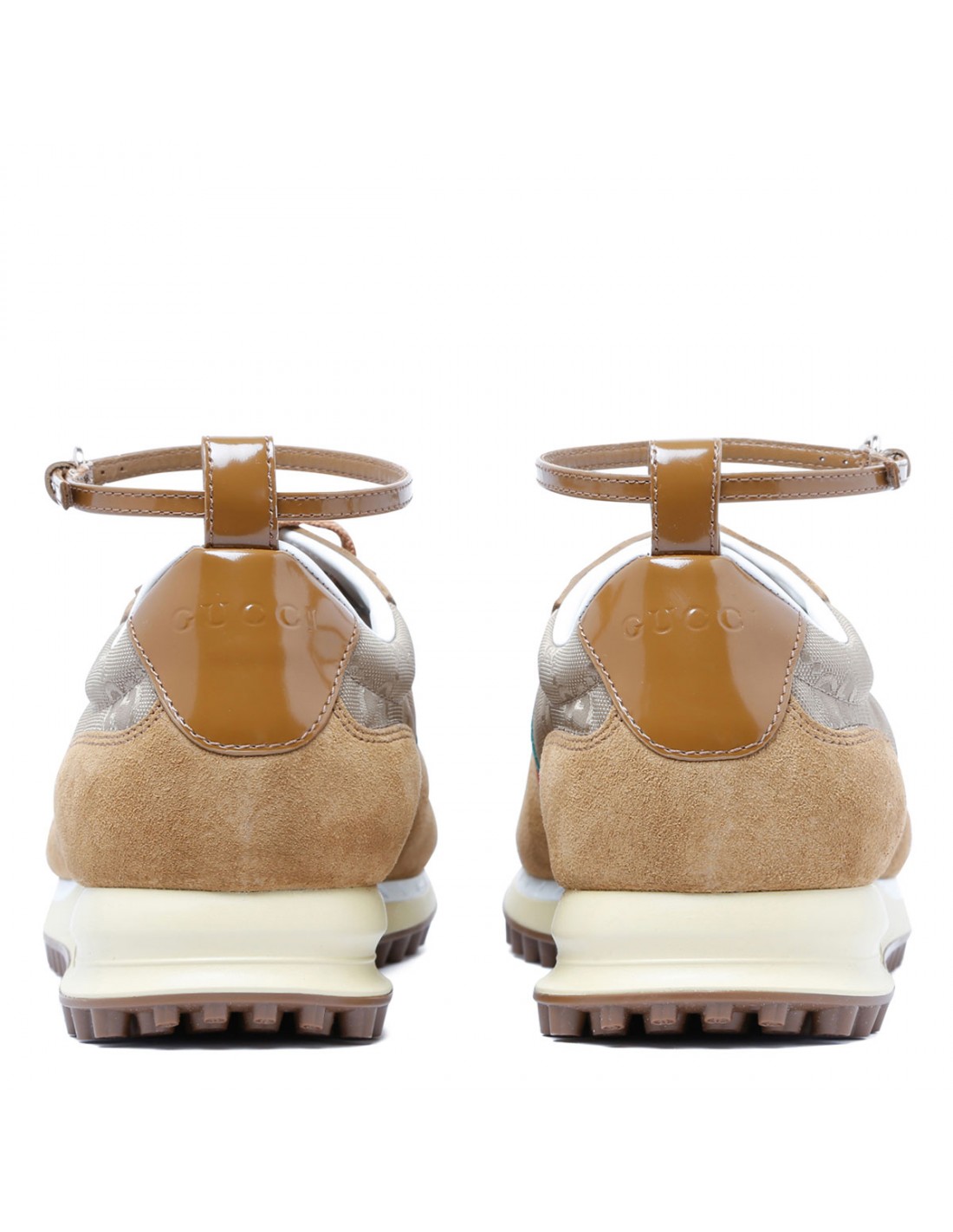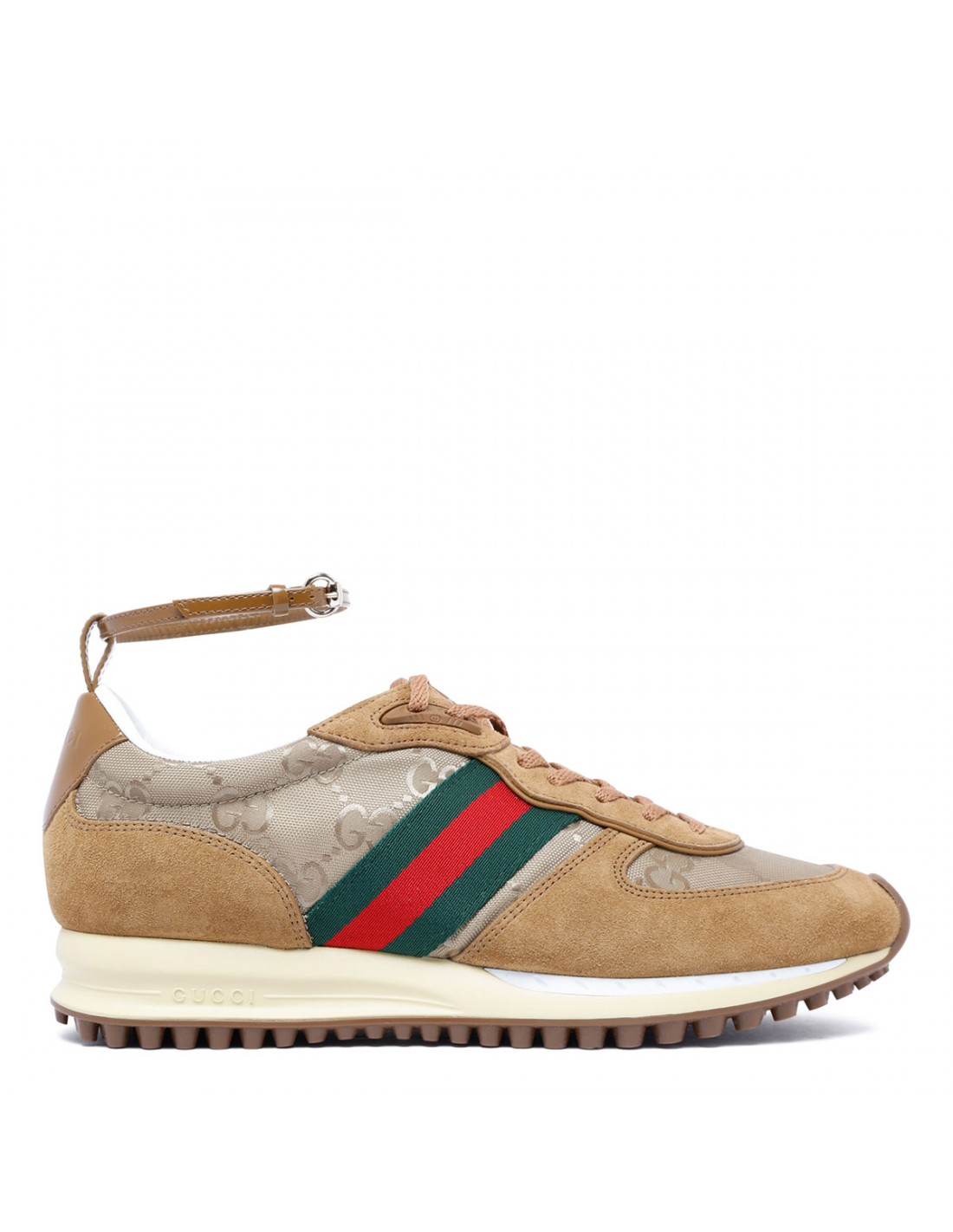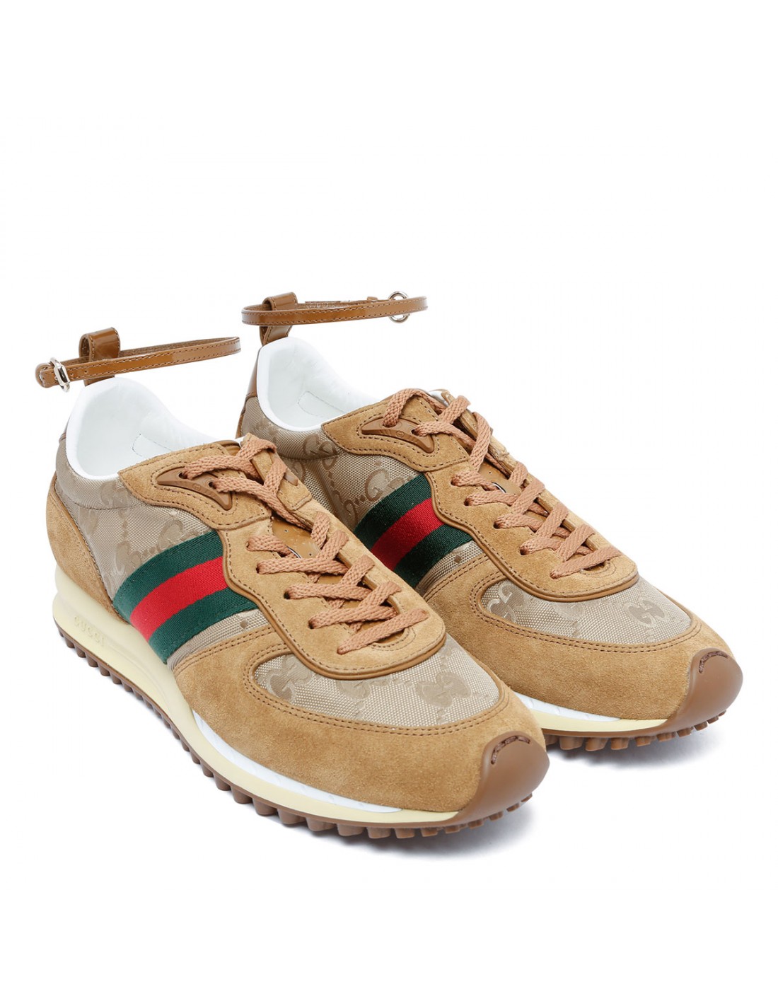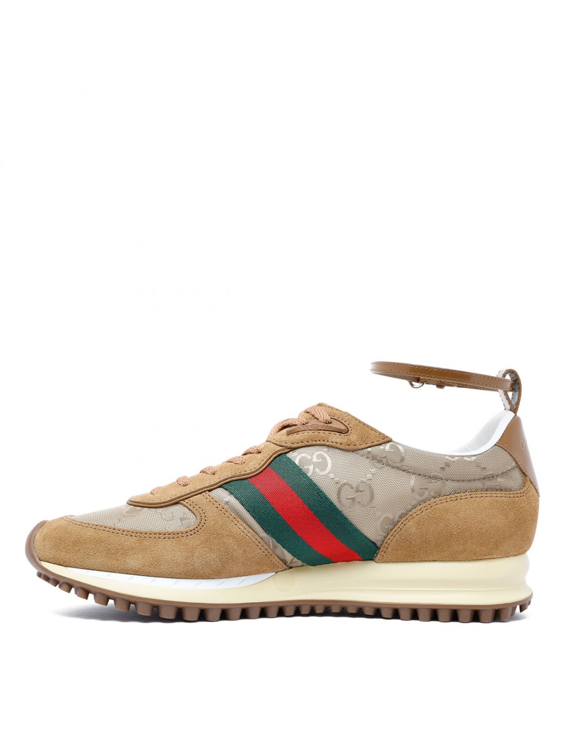 Re-Motion sneakers from Gucci featuring light brown suede leather and GG nylon upper, green and red Web, detachable and adjustable ankle strap, round toe, lace-up closure, interlocking G details on eyelets, tongue with 3D logo and interlocking G, fabric lining, rubber outsole with interlocking G and logo.