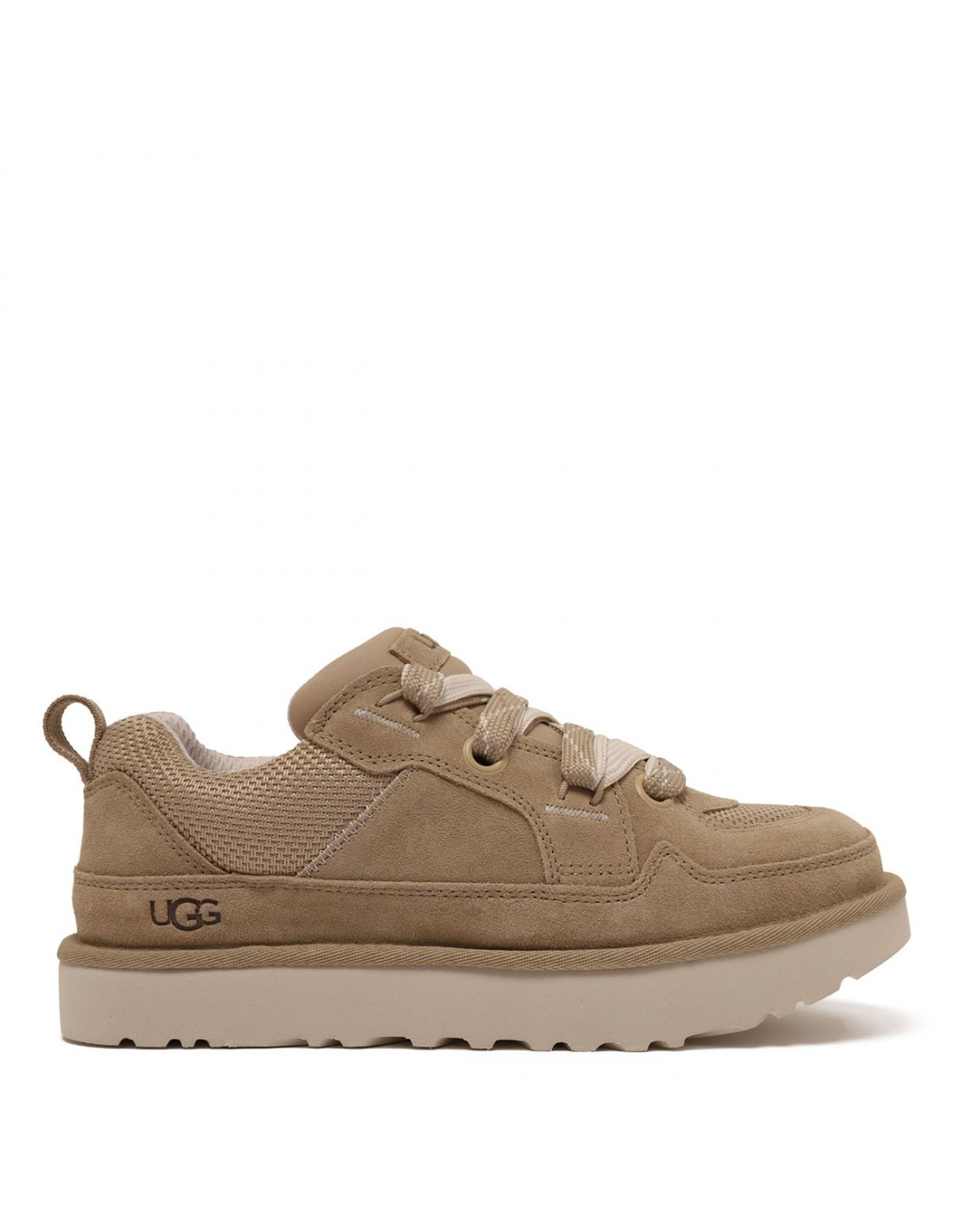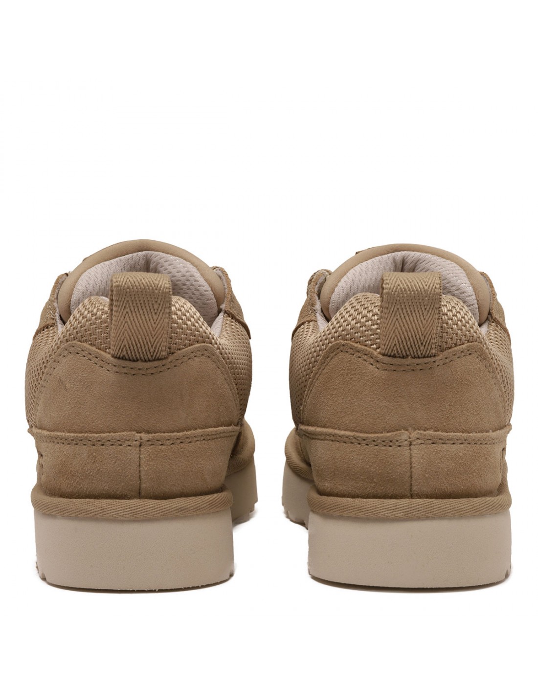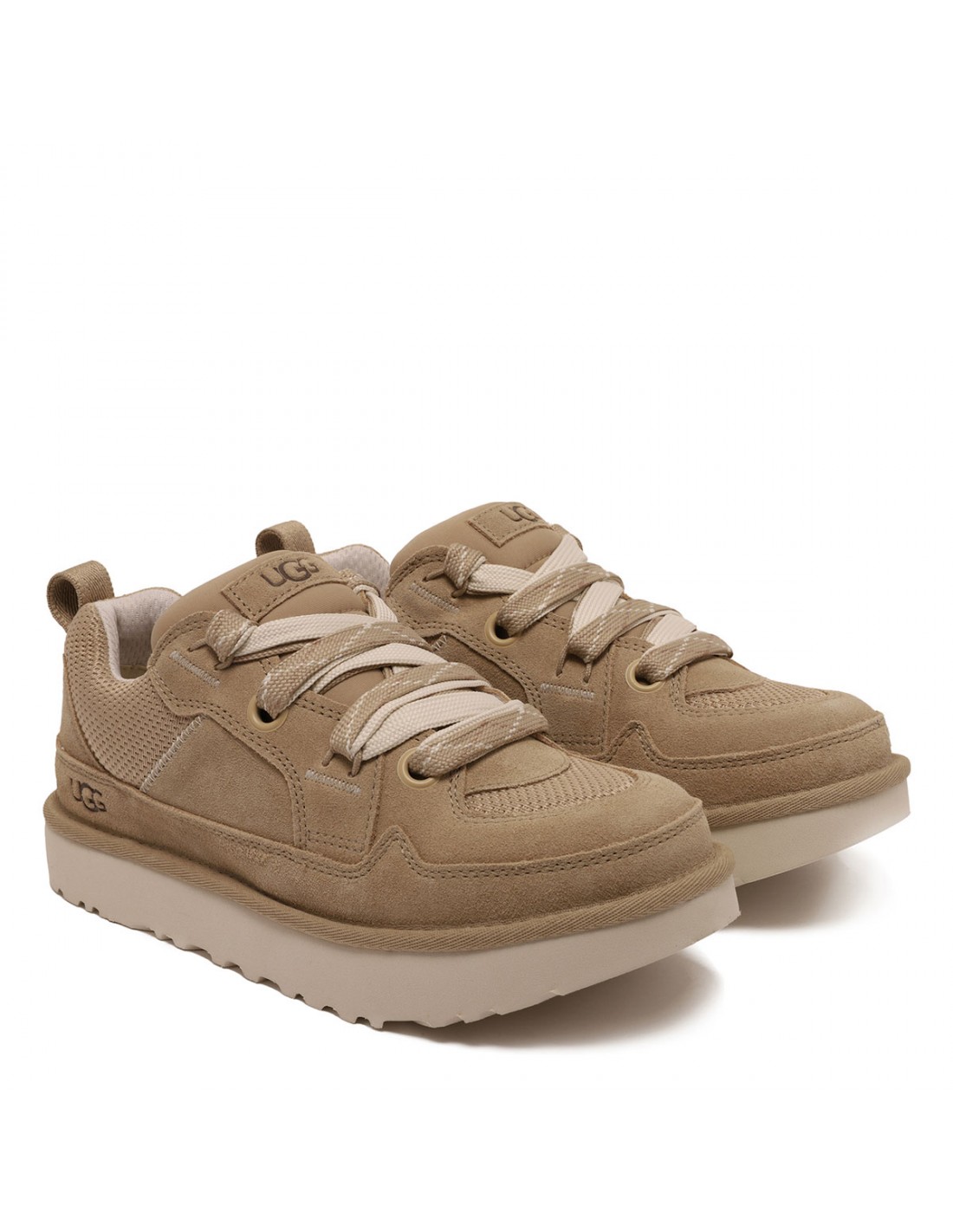 Mustard hue Lo Lowmel sneakers from UGG featuring suede and recycled ballistic canvas mesh upper, low style, padded collar, logo embossed, Web heel strap, two-tone flat lace fastening, sheepskin lining, foam footbed, sugarcane EVA outsole.