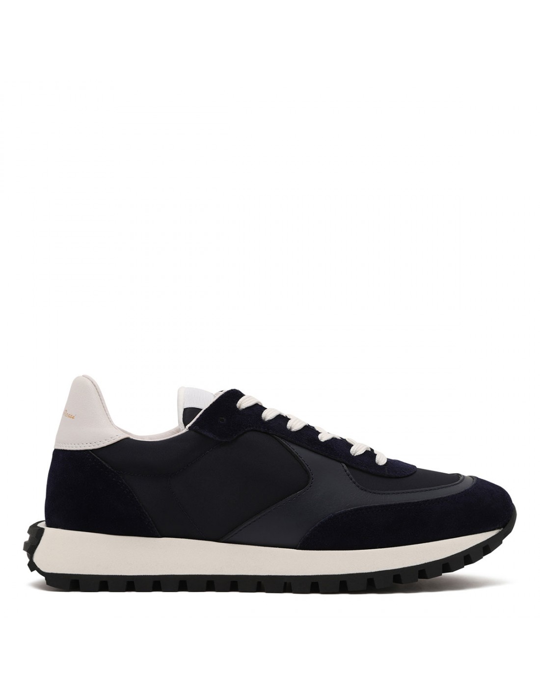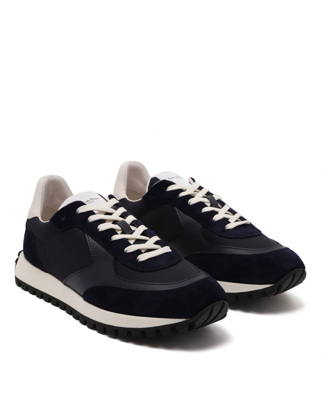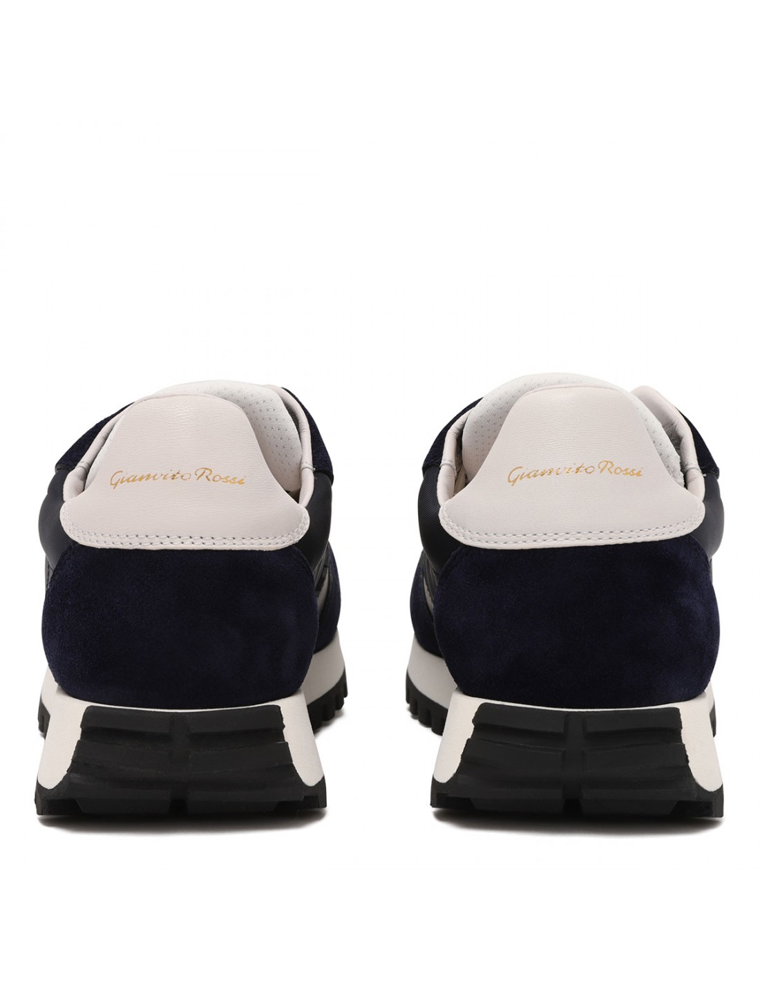 Gravel sneakers from Gianvito Rossi featuring dark denim-hue suede, leather and shell upper, contrasting white laces, off-white leather heel tab with logo, round toe, padded ankle, rubber lug sole.