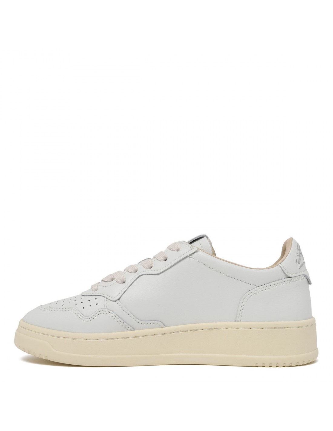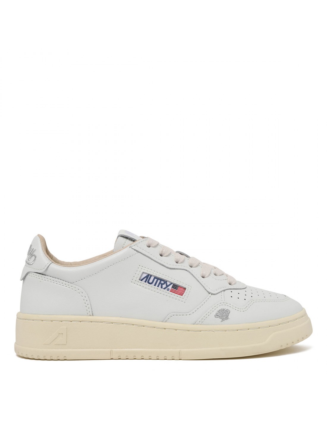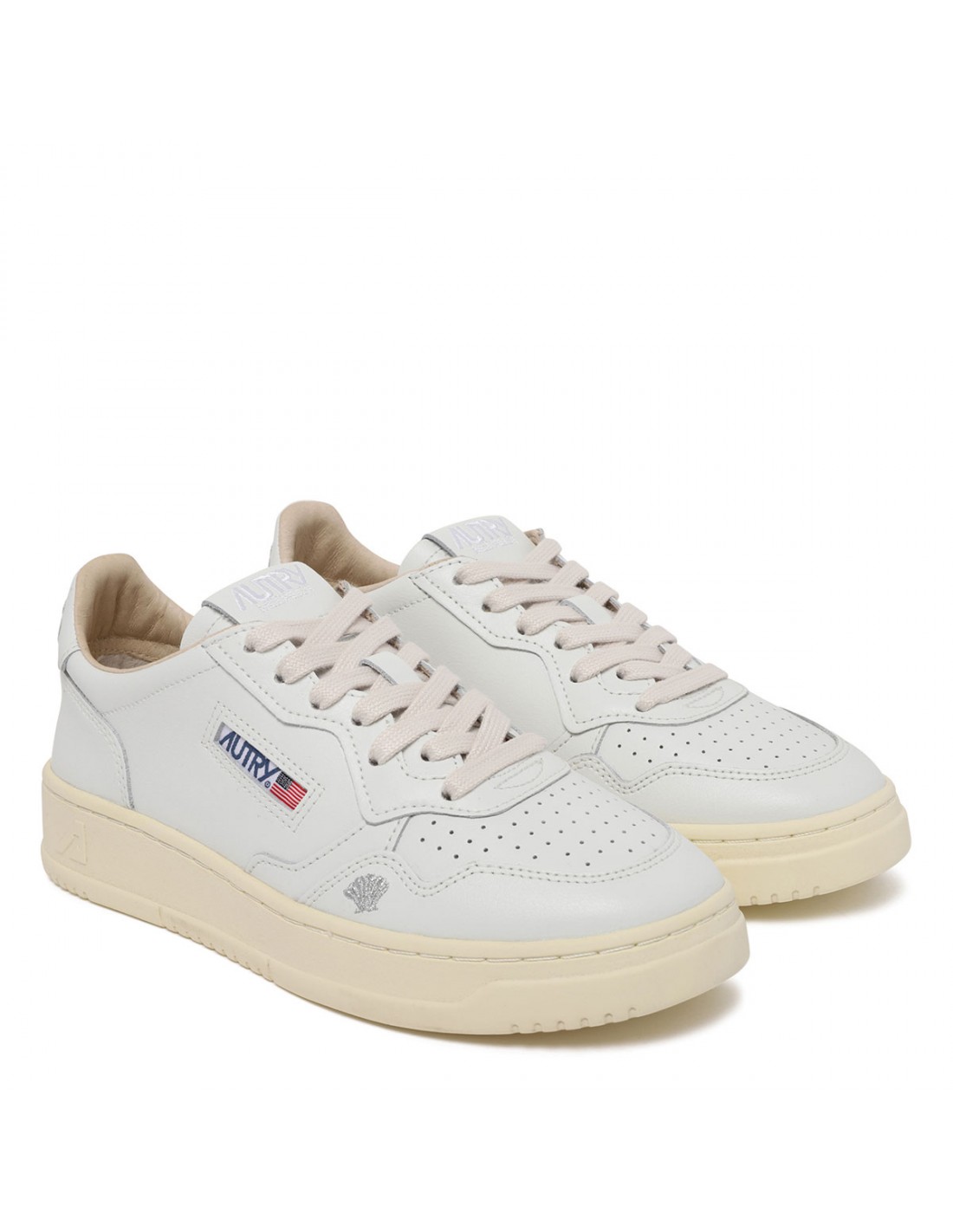 White leather Medalist low top sneakers from Autry featuring silver details, white leather heel tab with embroidered logo, perforated toecap, round toe, lace-up closure, logo label on tongue, padded ankle collar, leather insole, natural rubber sole.
