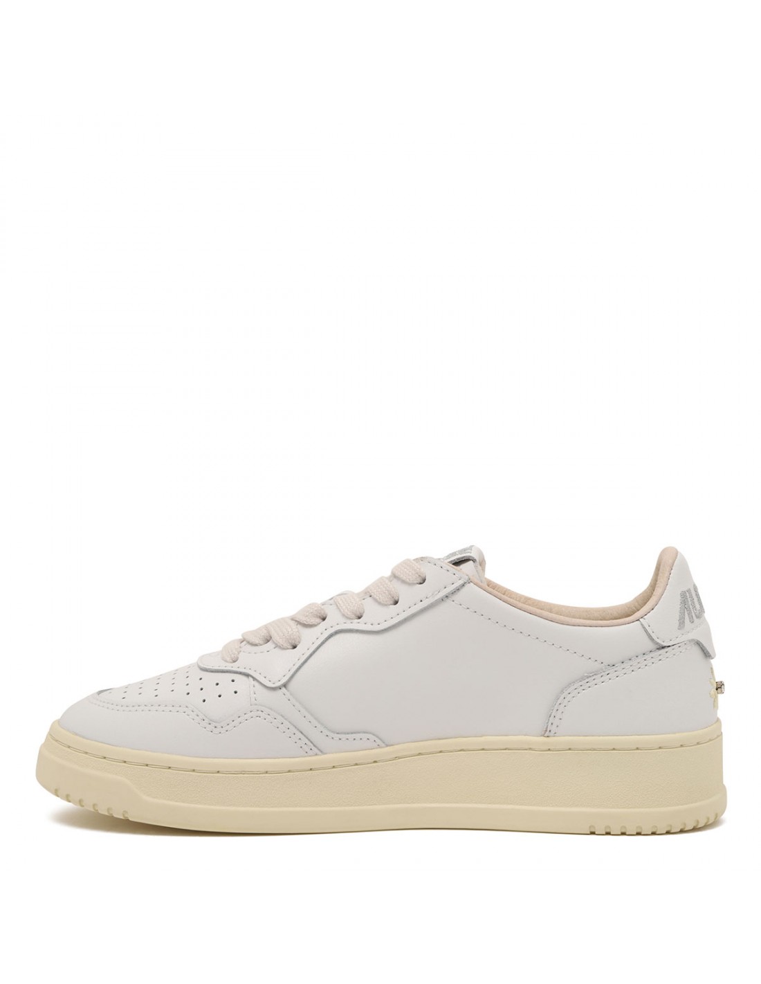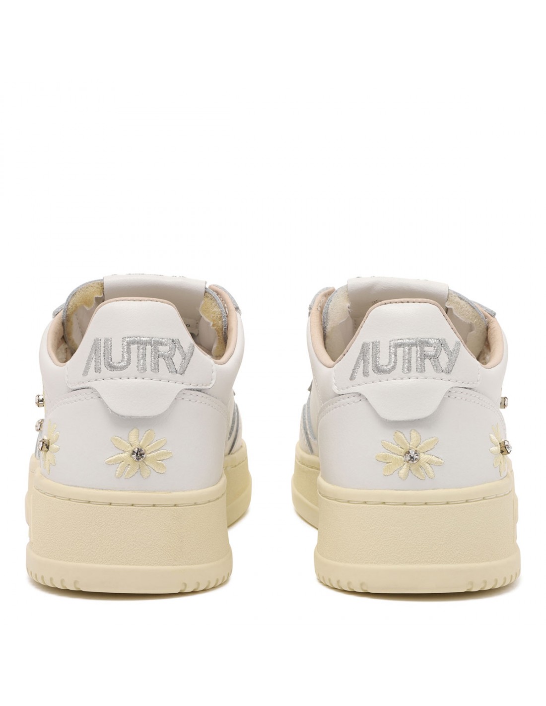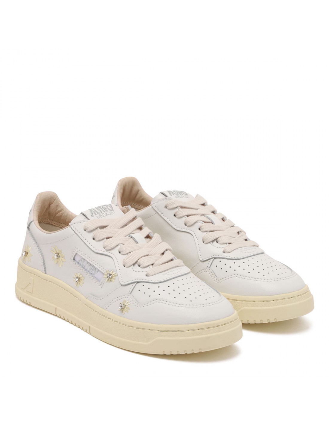White leather Medalist low sneakers from Autry featuring  floral embroidery, crystal applications, micro-perforated toe, leather heel tab with embossed logo, round toe, lace-up closure, logo label on tongue, padded ankle collar, leather insole, natural rubber sole.